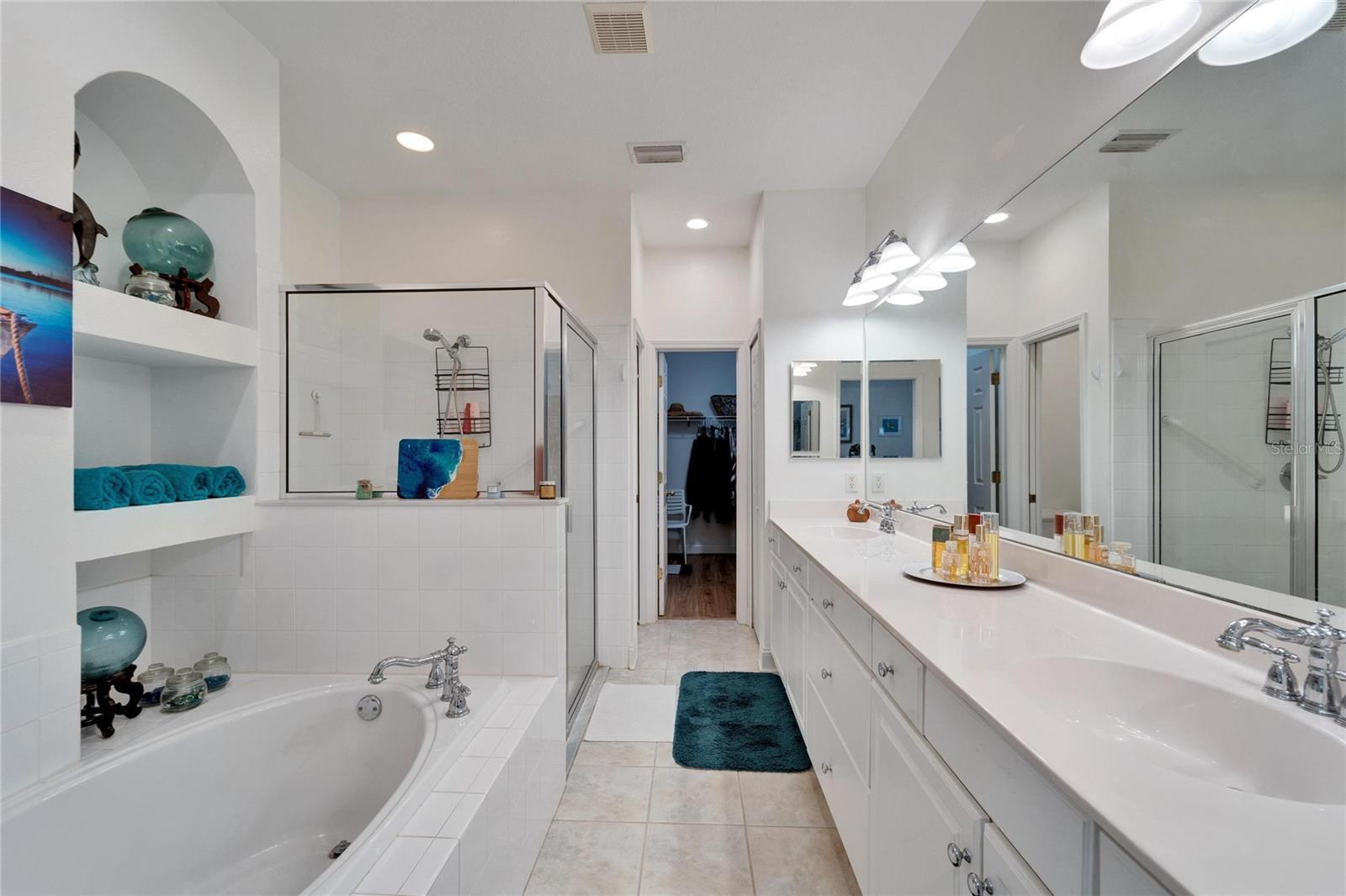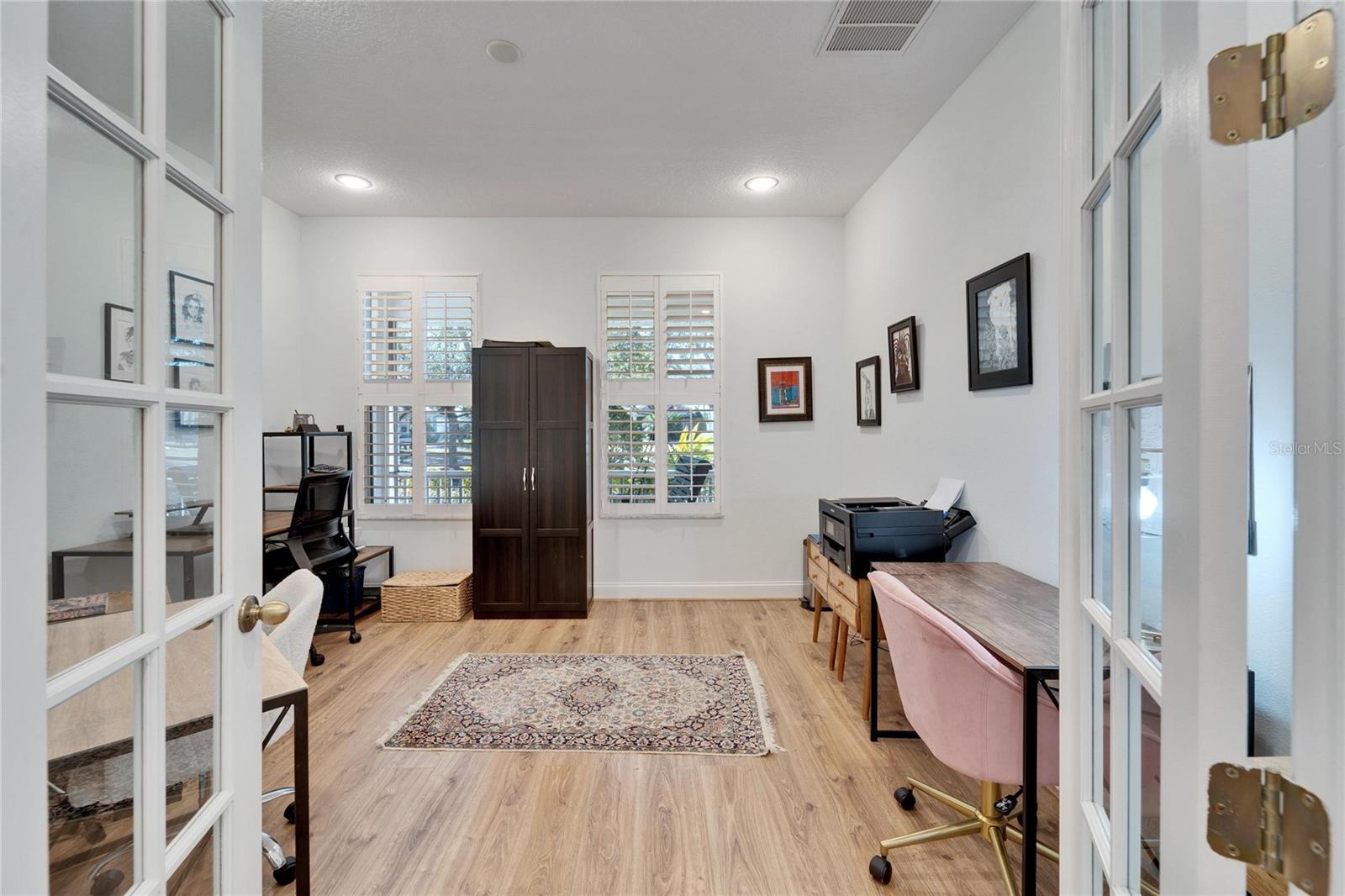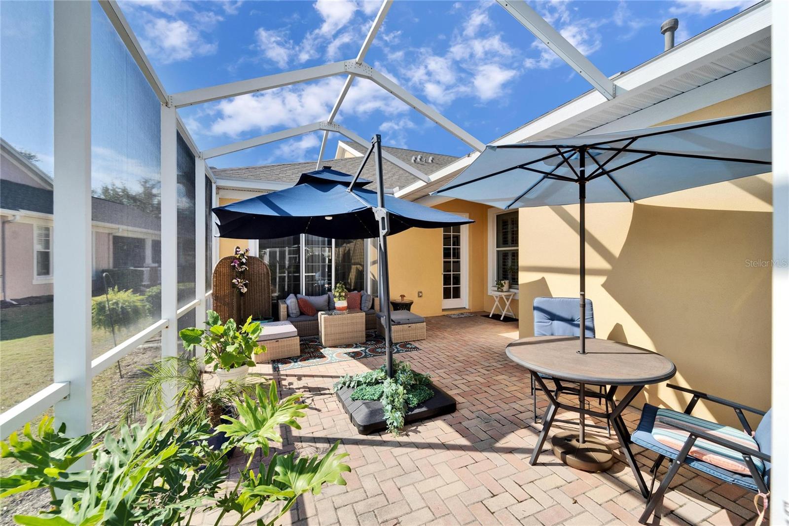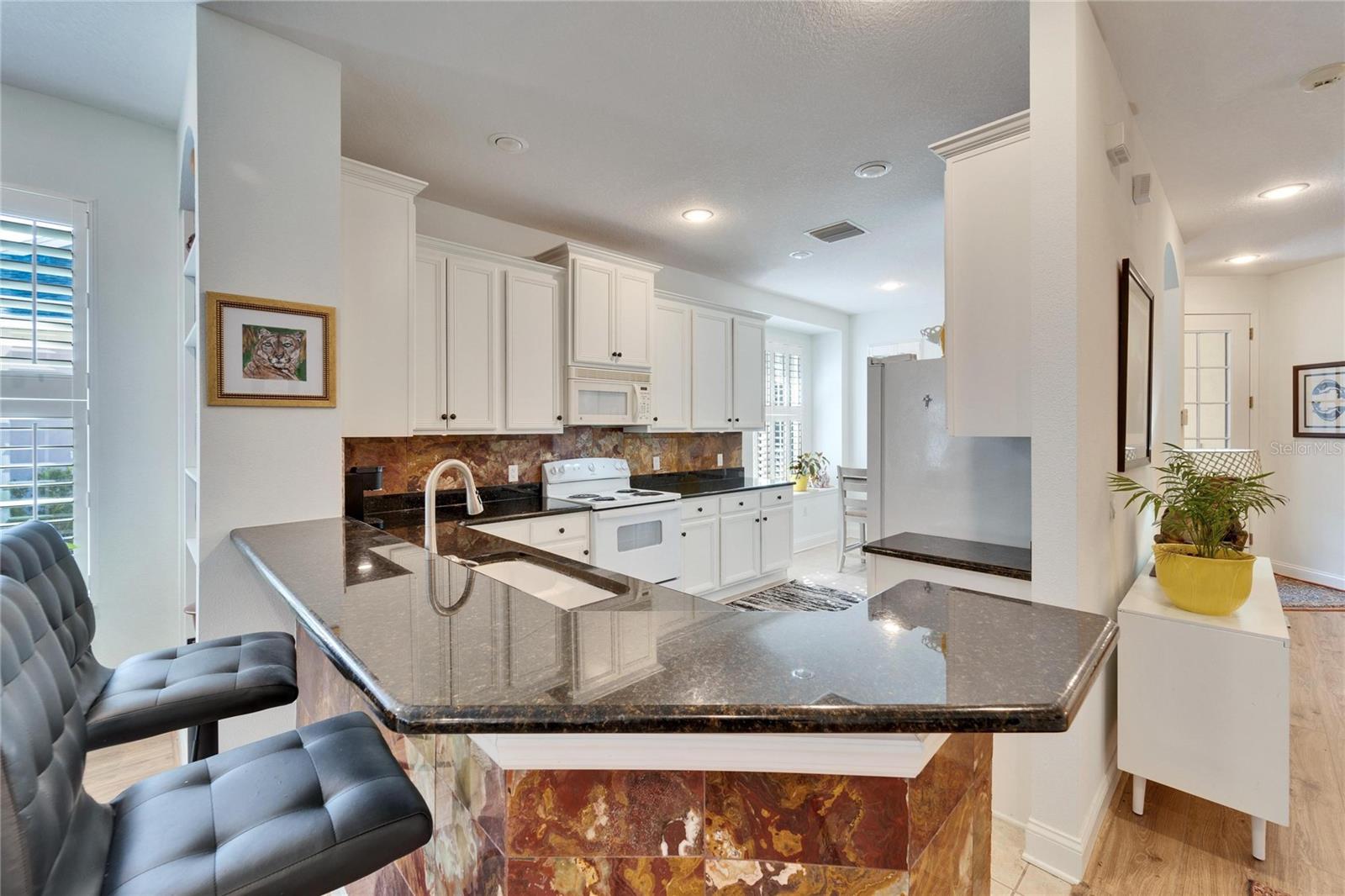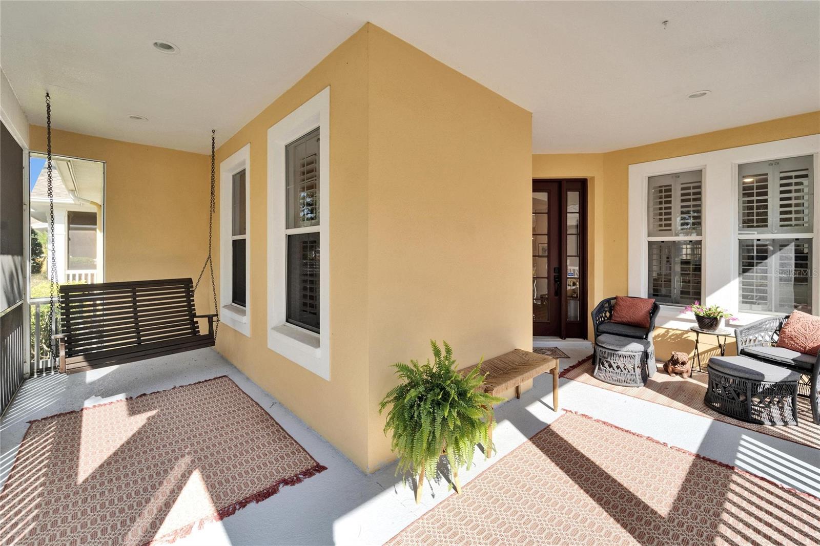Welcome Home to this MiraBay Villa Home with two bedrooms (split floor plan) plus an Office/Study/Den/Bedroom, two bathrooms & attached two car garage with large screened Lanai and screened front porch. Third bedroom is currently being used as an Office. Features include engineered hardwood floors, plantation shutters, tray ceilings in the Owner’s Suite and Dining Room, garden tub in the main bathroom with split vanity and a large walk-in closet plus a shower, NEW roof 2022, NEW range 2024, NEW washer (2024), NEW microwave (3/2025), NEW frameless shower (Bath 2), freshly painted (white) kitchen cabinets, plantation shutters throughout, engineered hardwood except kitchen and bathrooms and more!! New lanai screening (1/2025). Furnishings optional. Move-in ready so you can start enjoying resort style living in gated MiraBay.
