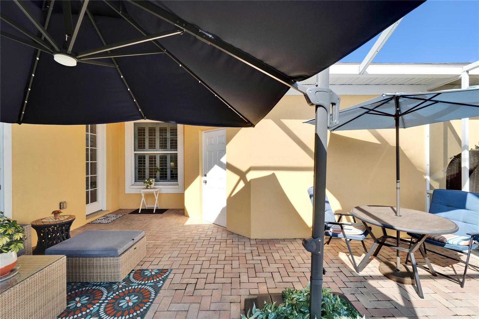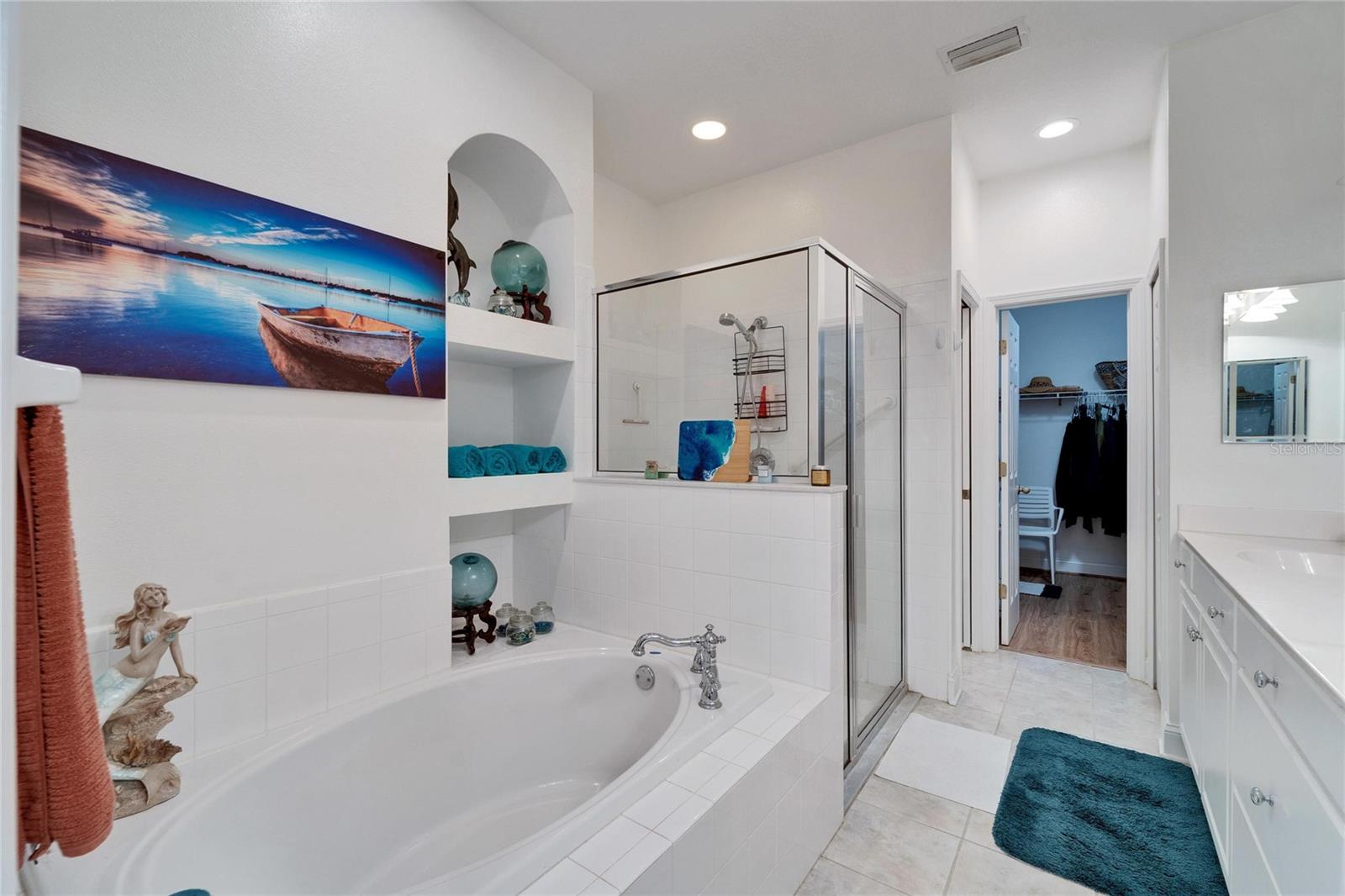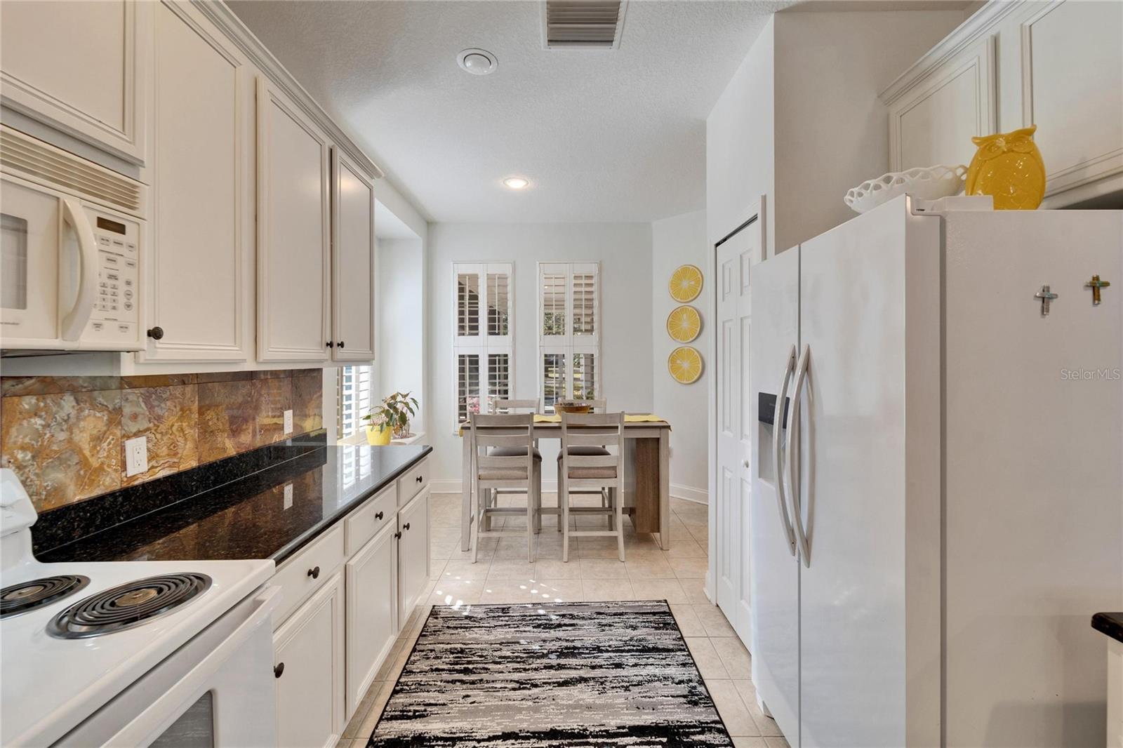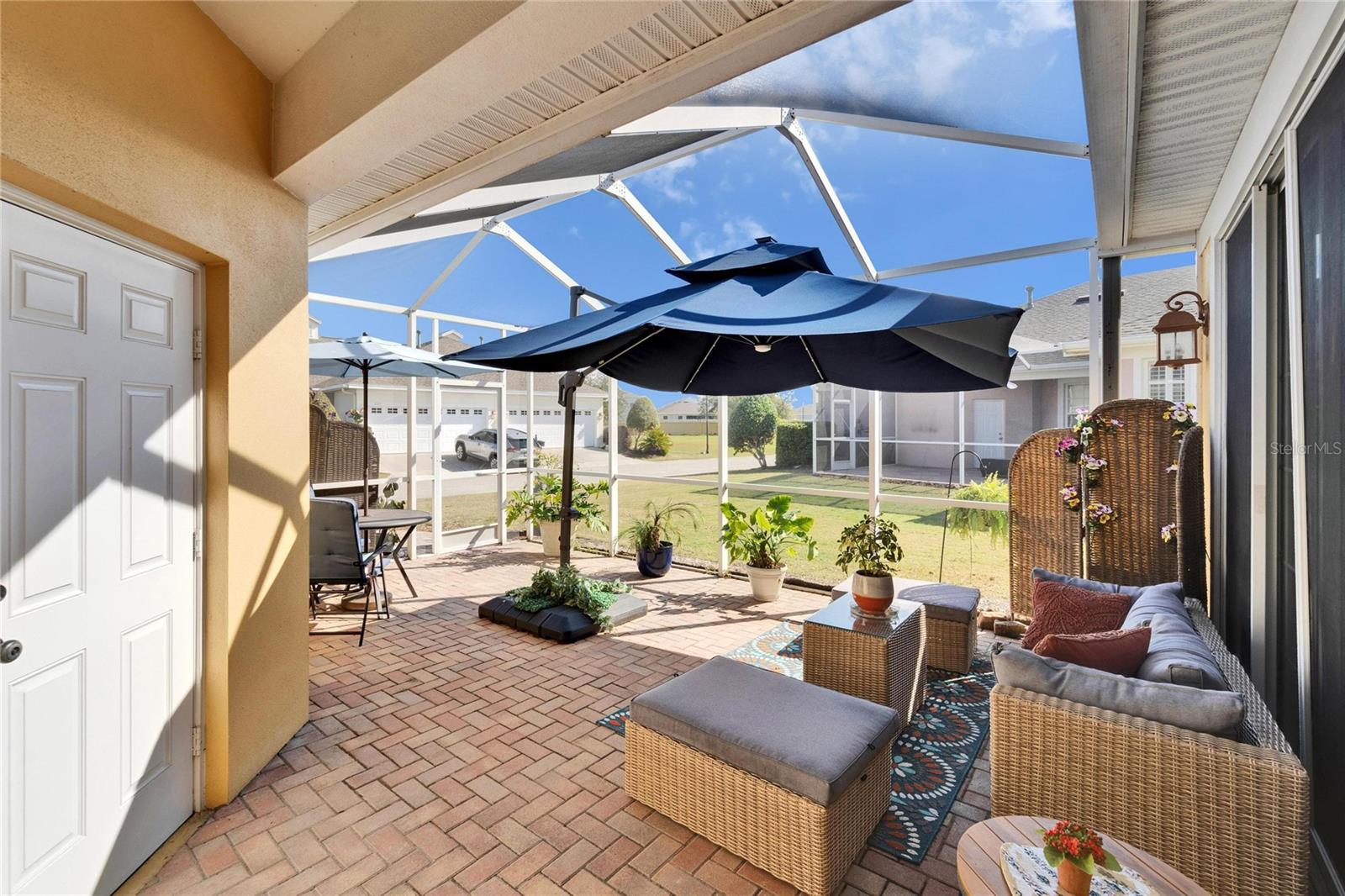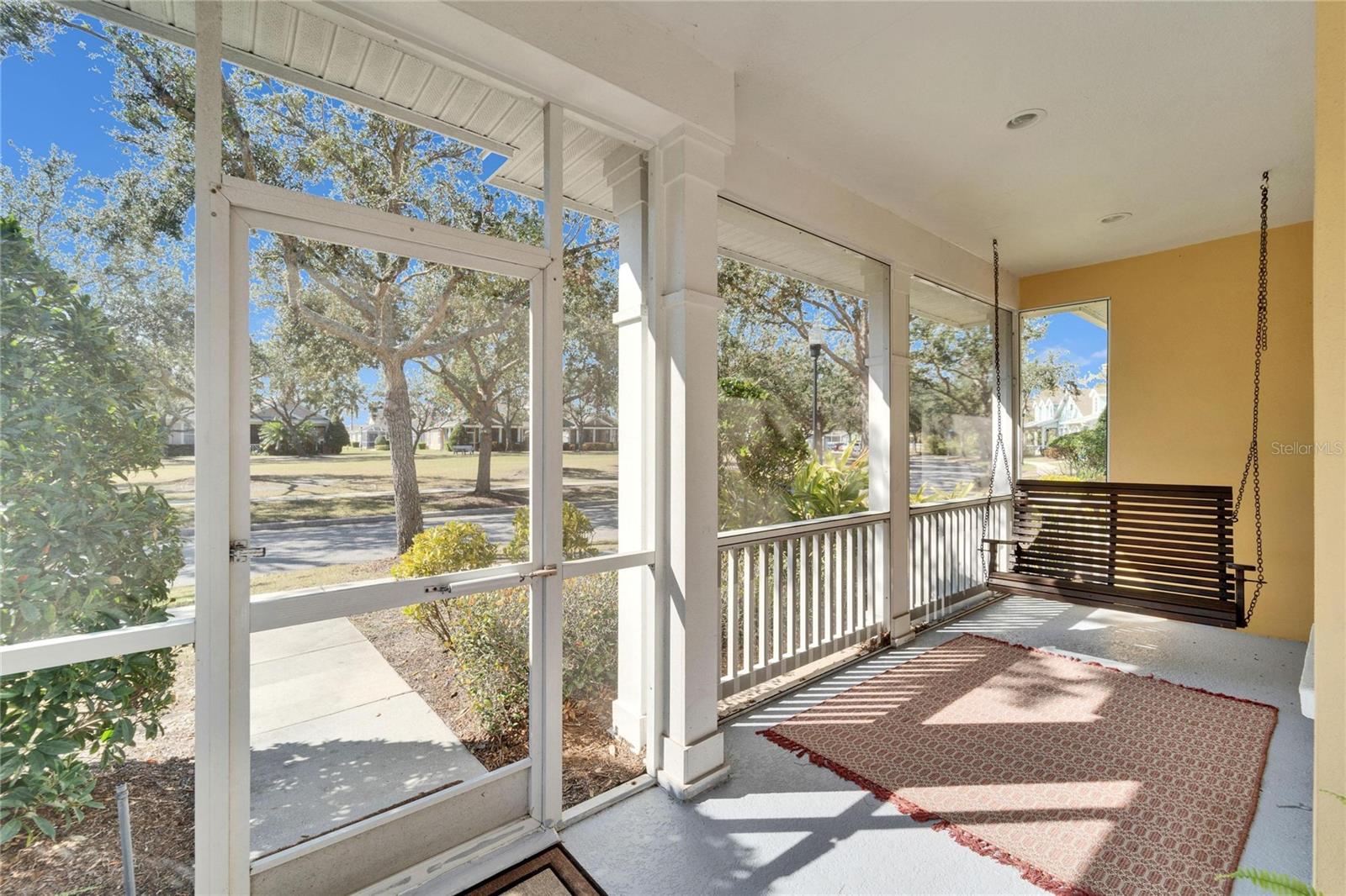 Welcome Home to this MiraBay Villa Home with two bedrooms (split floor plan) plus an Office/Study/Den/Bedroom, two bathrooms & attached two car garage with large screened Lanai and screened front porch. Third bedroom is currently being used as an Office. Features include engineered hardwood floors, plantation shutters, tray ceilings in the Owner’s Suite and Dining Room, garden tub in the main bathroom with split vanity and a large walk-in closet plus a shower, NEW roof 2022, NEW range 2024, NEW washer (2024), NEW microwave (3/2025), NEW frameless shower (Bath 2), freshly painted (white) kitchen cabinets, plantation shutters throughout, engineered hardwood except kitchen and bathrooms and more!! New lanai screening (1/2025). Furnishings optional. Move-in ready so you can start enjoying resort style living in gated MiraBay.