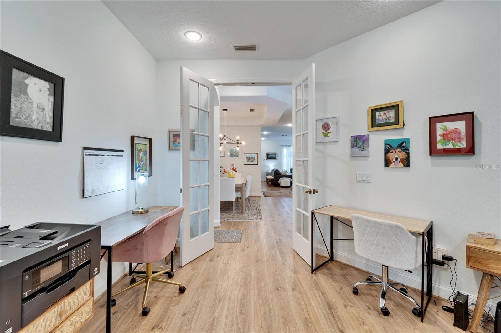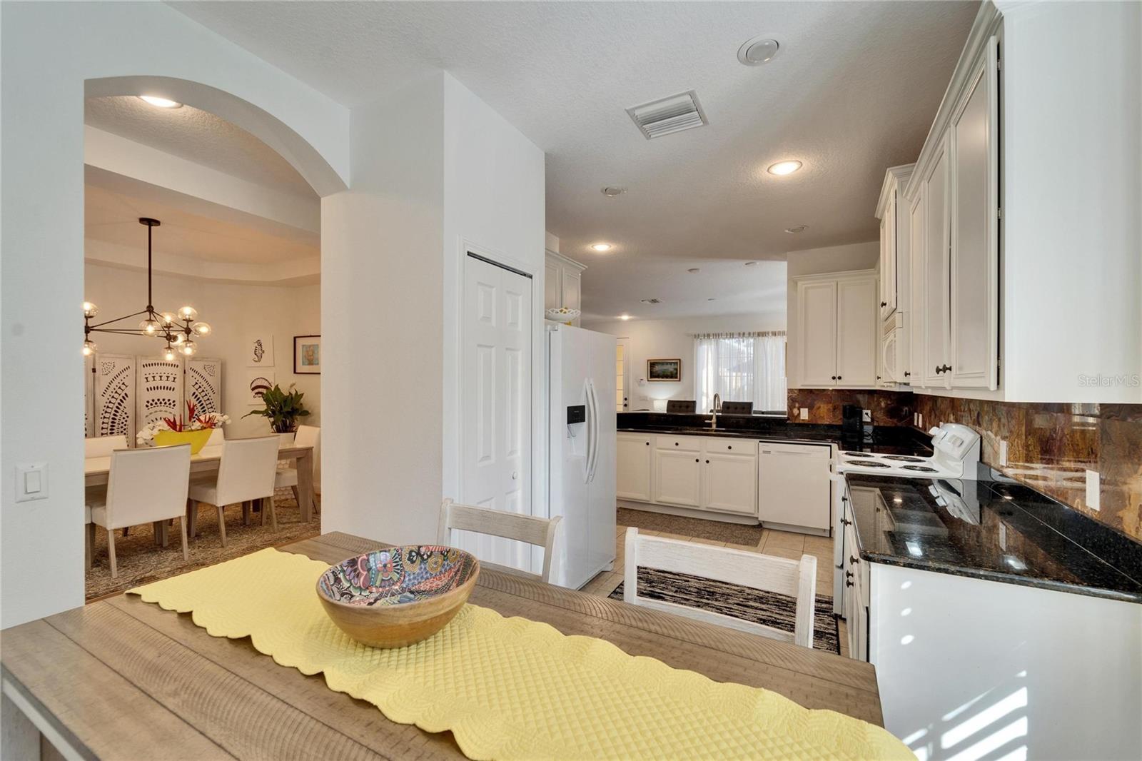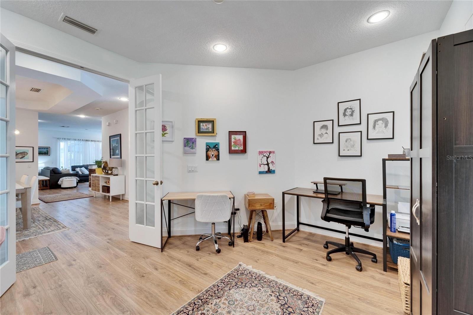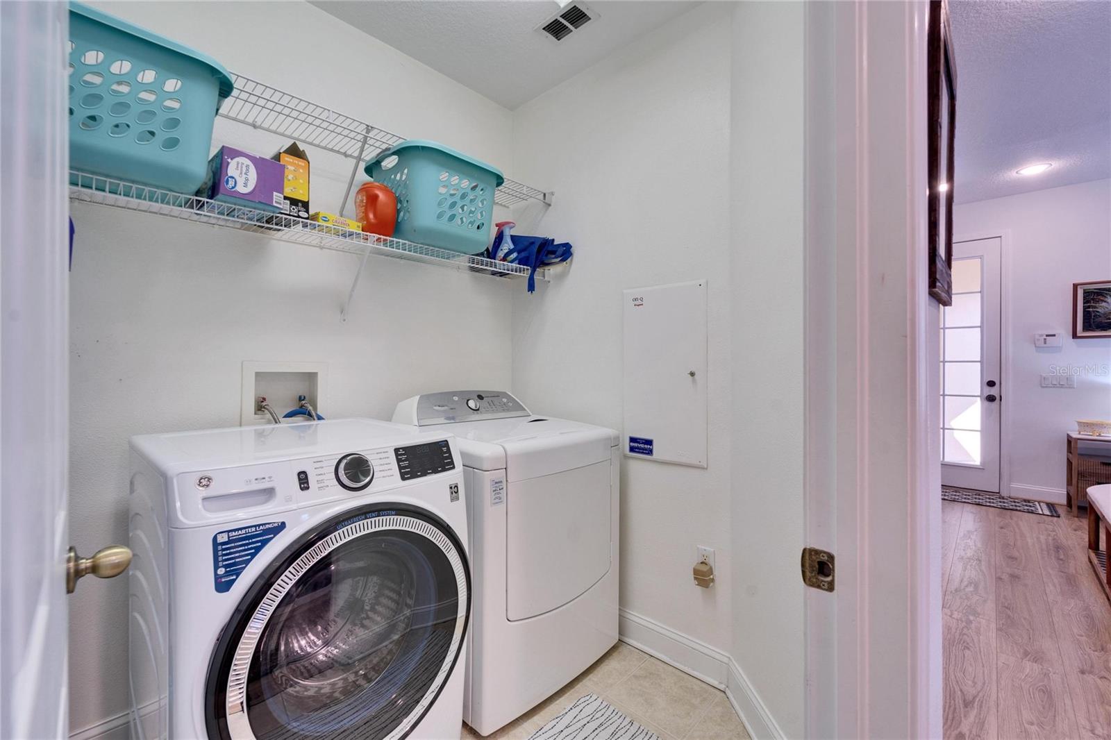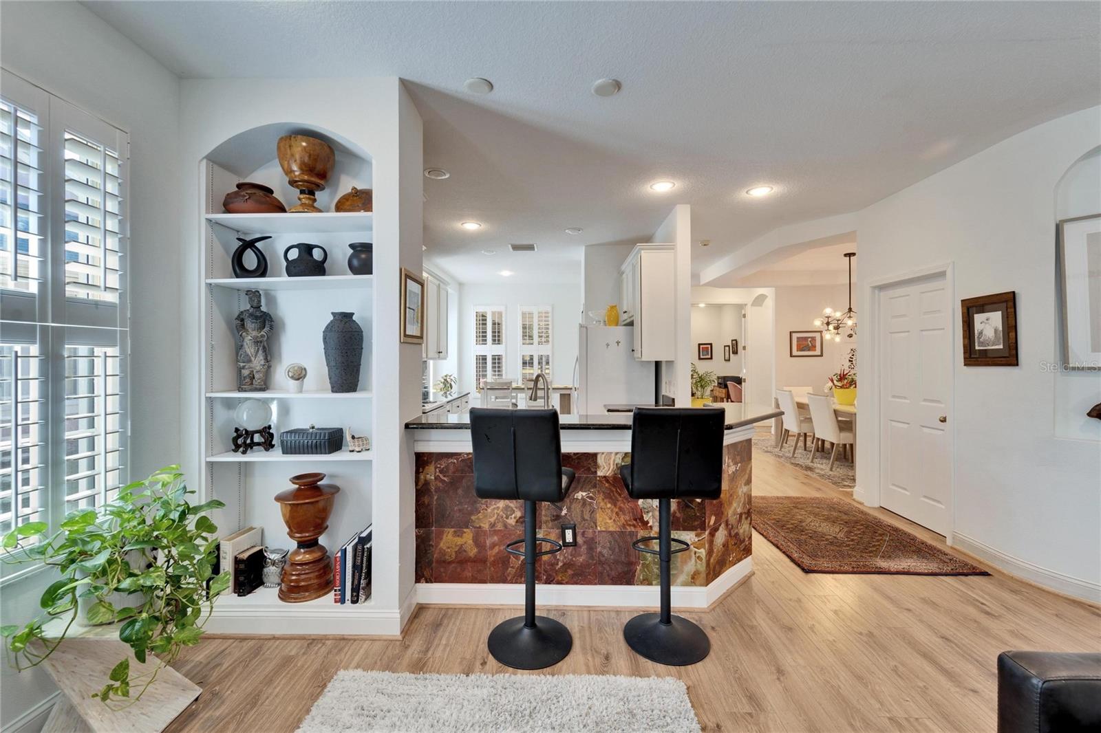 Welcome Home to this MiraBay Villa Home with two bedrooms (split floor plan) plus an Office/Study/Den/Bedroom, two bathrooms & attached two car garage with large screened Lanai and screened front porch. Third bedroom is currently being used as an Office. Features include engineered hardwood floors, plantation shutters, tray ceilings in the Owner’s Suite and Dining Room, garden tub in the main bathroom with split vanity and a large walk-in closet plus a shower, NEW roof 2022, NEW range 2024, NEW washer (2024), NEW microwave (3/2025), NEW frameless shower (Bath 2), freshly painted (white) kitchen cabinets, plantation shutters throughout, engineered hardwood except kitchen and bathrooms and more!! New lanai screening (1/2025). Furnishings optional. Move-in ready so you can start enjoying resort style living in gated MiraBay.