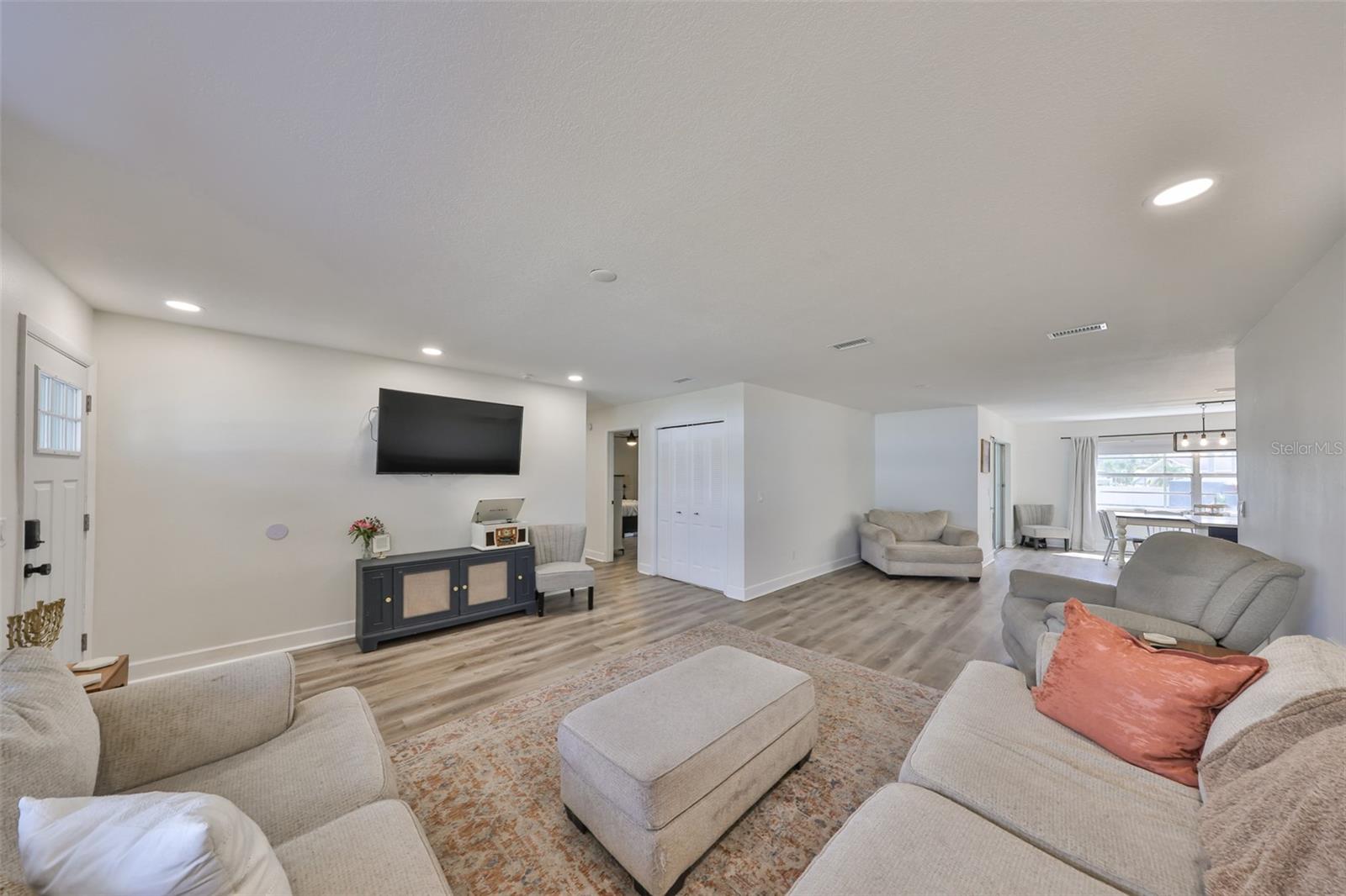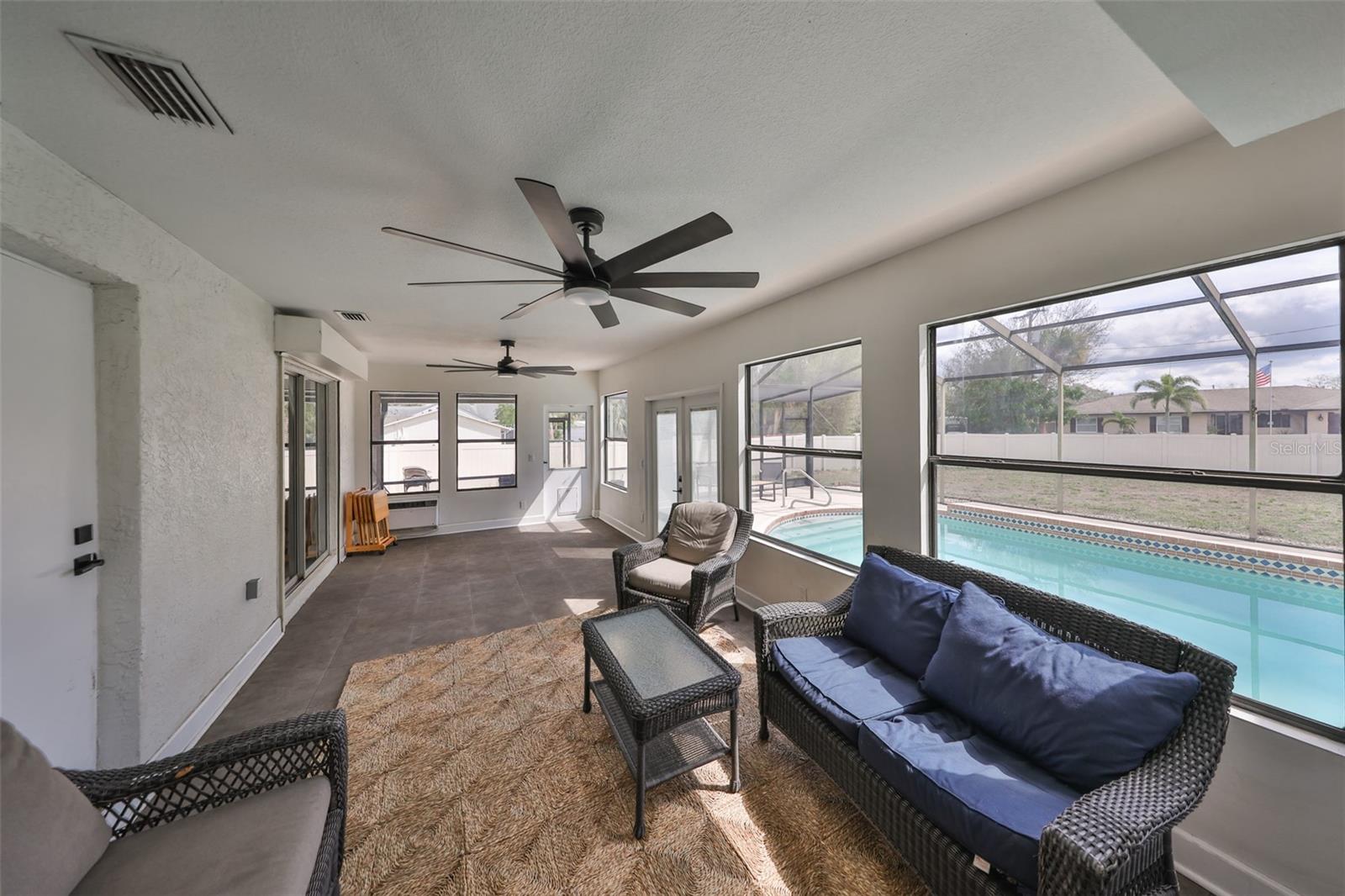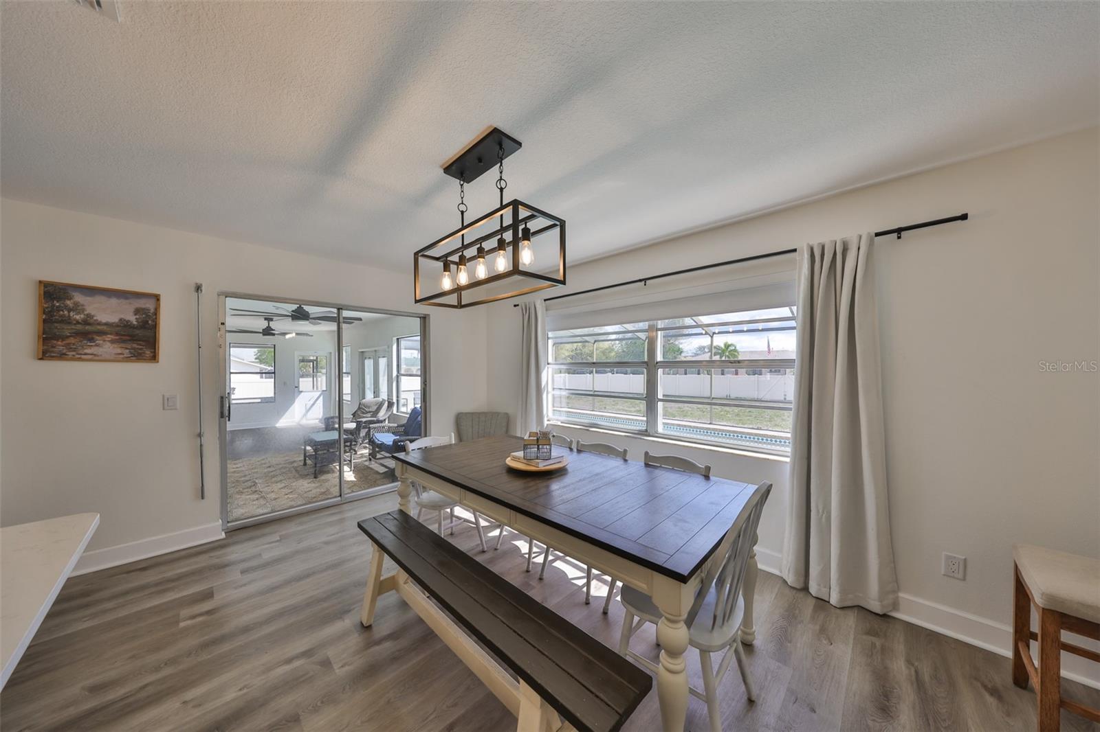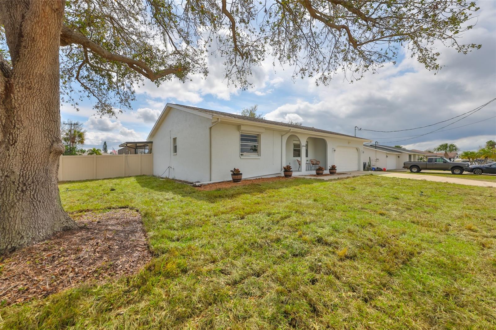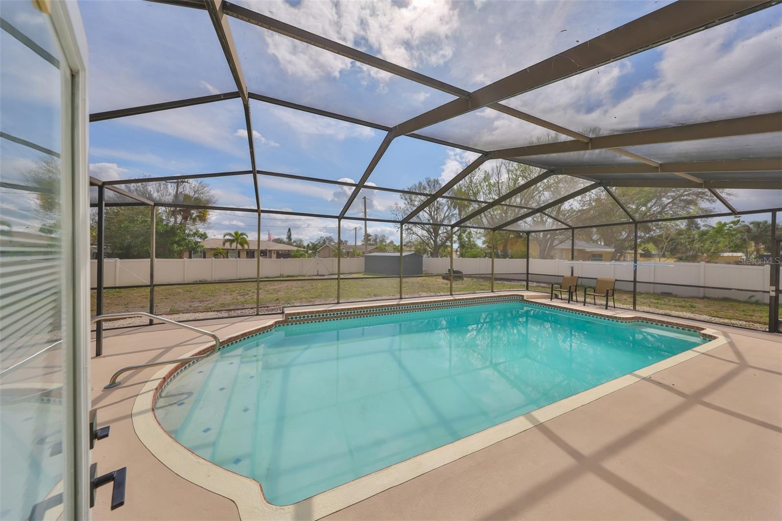SELLER IS OFFERING $10,000 TOWARDS BUYERS CLOSING COSTS! This beautifully updated home combines luxury upgrades with comfortable, open-concept living—all situated on an oversized, FULLY FENCED 0.37-ACRE LOT with a PRIVATE POOL and NO HOA. There was no flooding in the home from recent storms. Renovated in 2023, the 2-bedroom, 2-bath home features a modern kitchen remodel with a large breakfast bar perfect for casual dining and entertaining. Both bathrooms have been thoughtfully redesigned with high-end finishes, including a spa-like primary bath with a spacious walk-in shower. Luxury vinyl plank flooring runs throughout the home, complementing the open layout that seamlessly connects the living, kitchen, and dining areas. A bright and cheerful Florida room adds the perfect spot to unwind and soak up the sun. Additional recent upgrades include new insulation, a new electrical panel, and updated wiring—all completed in 2023 for enhanced energy efficiency and peace of mind. Step outside to your own backyard retreat featuring a beautiful pool and an expansive, fully fenced yard with room to park a boat or RV. The attached two-car garage offers ample storage. Conveniently located just minutes from local dining and amenities, this move-in-ready gem did not flood during recent storms and offers the perfect blend of style, space, and location.