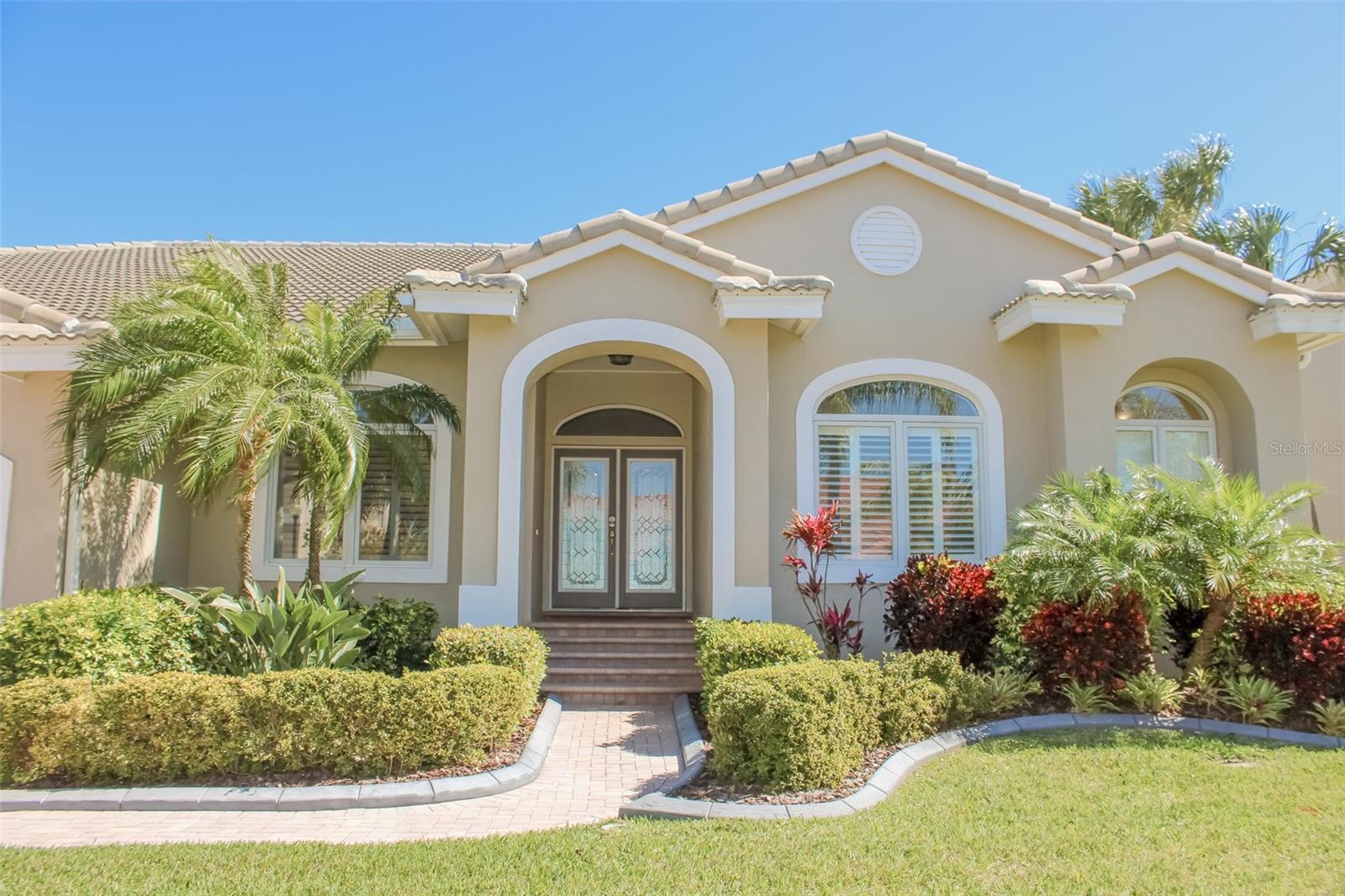 Discover unparalleled coastal elegance in this exquisite Symphony Isles residence. Beyond the grand double-door entry, breathtaking 300-foot canal views set the stage for a premier waterfront lifestyle with seamless yacht access to Tampa Bay and the Gulf. This thoughtfully designed split-bedroom floor plan offers four bedrooms, three baths, and a private den. The chef’s kitchen features granite countertops, custom KraftMaid cabinetry, and premium finishes. Rich porcelain tile and American wood flooring enhance the refined interiors. The master suite is a serene retreat with a spa-inspired bath, dual sinks, granite counters, an upgraded shower, and a garden tub. Outdoors, the expansive, fenced yard is ideal for a future pool, while the private dock includes two lifts: a covered 10,000-lb. lift and a 20,000-lb. lift. Enhanced with a security system for peace of mind, a tankless water heater for endless energy-efficient hot water, and a water softener for better water quality, this home is designed for comfort and convenience. Entertain year-round on the 14’x38’ screened lanai, prepped for an outdoor kitchen. Energy-efficient Pella windows and an oversized, climate-controlled three-car garage with epoxy flooring complete this remarkable home. Move-in ready with impeccable upgrades—schedule your private tour today!