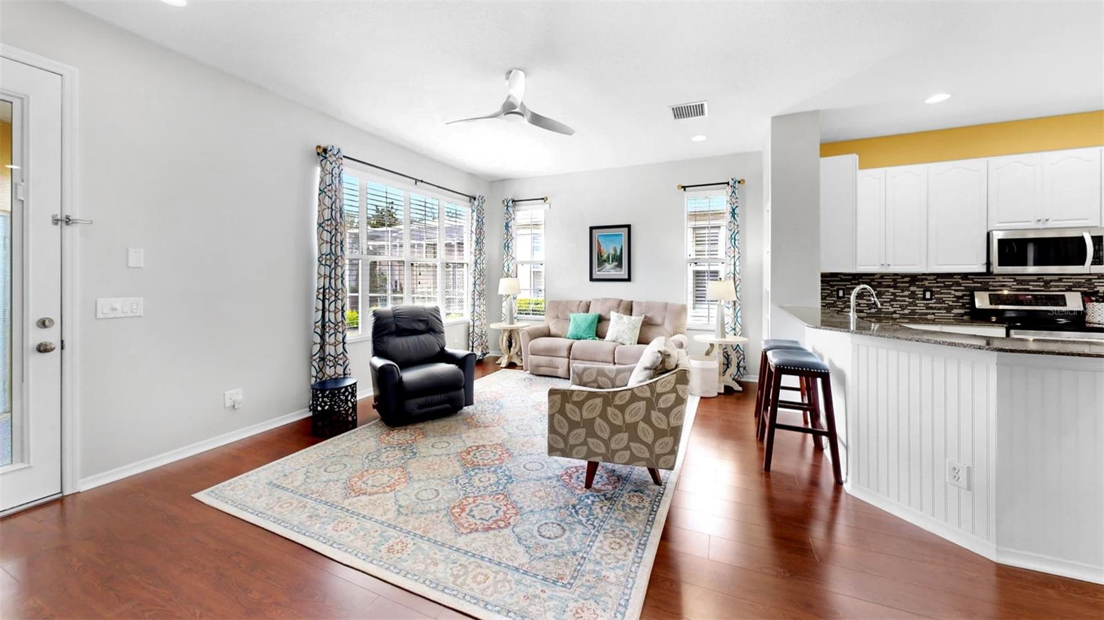 Turnkey 3-Bedroom Villa in the Gated Waterfront Community of MiraBay! Welcome home to this immaculate 3-bedroom, 2-bathroom villa in the highly sought-after MiraBay community of Apollo Beach! Offering 1,750 sq. ft. of beautifully maintained living space, this fully furnished, maintenance-free home is move-in ready. Full roof replacement in 2023. HVAC replacement with high efficiency heat pump in 2024. Step inside to find a flex space/home office with elegant French doors, perfect for remote work, a quiet retreat or a 3rd guest bedroom. The open-concept design showcases wood laminate flooring in the main living areas and office, complemented by ceramic tile in the kitchen and cozy carpeting in the bedrooms. The chef's kitchen is a dream with granite countertops, a decorative backsplash, and 42-inch upper cabinets for ample storage. Enjoy meals in the charming dinette area, with a formal dining space also included. The spacious living room, filled with tons of natural light, is fully furnished and ready for entertaining. Relax in the primary suite, featuring a tray ceiling, a luxurious garden tub, a separate shower and a dual vanity with walk-in closet. The additional guest bedroom offers comfortable accommodations for family or guests. Outdoor living is a delight with a spacious screened front porch, ideal for morning coffee or evening relaxation. The attached two-car garage boasts epoxy flooring, adding durability and style. This villa is truly turnkey, with furnishings included in two bedrooms, the dining and dinette areas, and the living room. Plus, enjoy hassle-free maintenance, including pest control, so you can spend more time enjoying the resort-style amenities of MiraBay, a gated, waterfront community with a clubhouse, pool, fitness center, pickleball, tennis and basketball courts and more! The community of Mirabay is strategically located near major highways, such as I-75 and US-41, ensures convenient access to Tampa and surrounding areas. For travelers, Tampa International Airport and St. Petersburg-Clearwater International Airport are within a reasonable driving distance. Sports enthusiasts will appreciate the proximity to major arenas, including Raymond James Stadium, home to the Tampa Bay Buccaneers, offering a variety of professional sports and entertainment events. This well-appointed and meticulously clean villa won't last long! Schedule your private showing today!