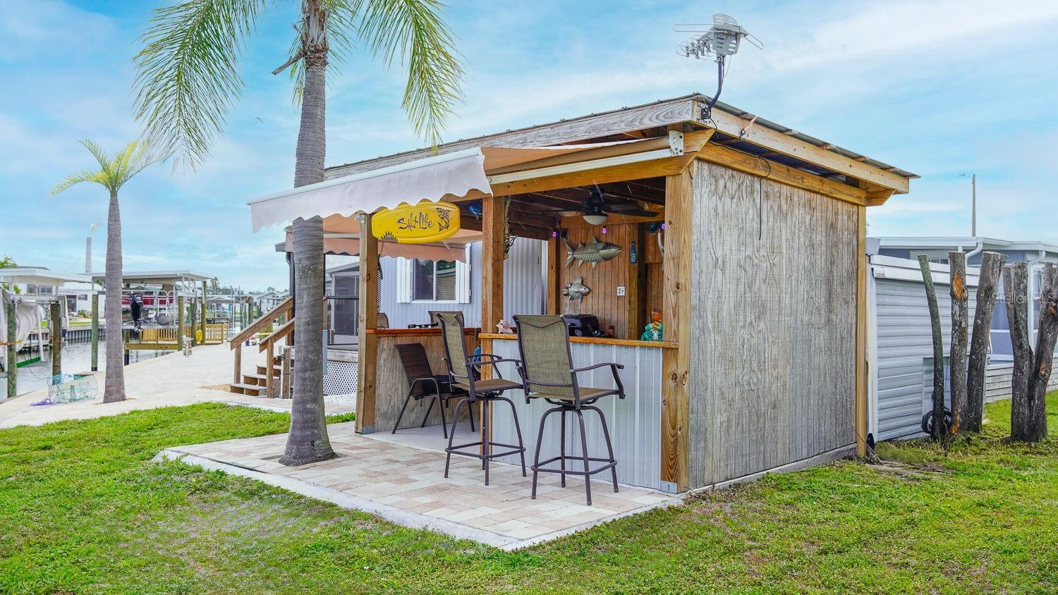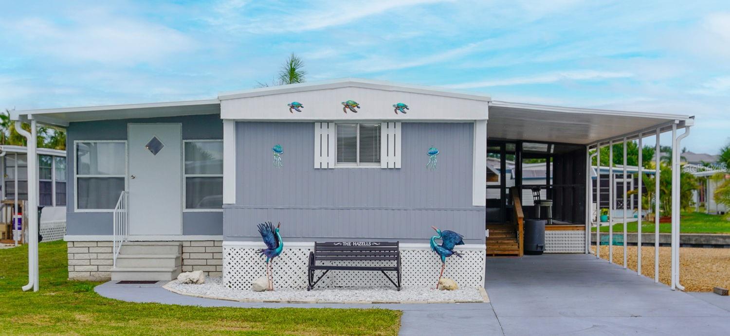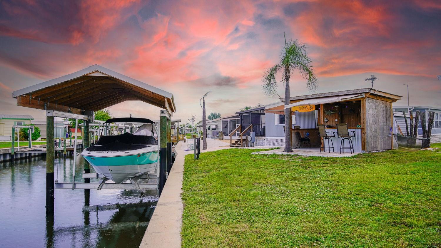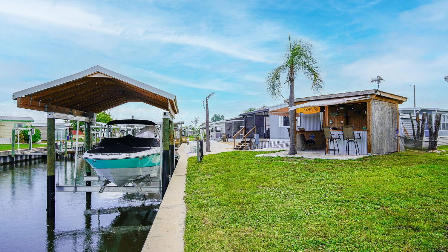Welcome to waterfront living in the highly sought-after 55+ gated community of Caribbean Isles! This meticulously maintained 2 bed, 1.5 bath, 1 carport (2 Spaces) home offers 998 square feet of comfort and upgrades throughout. Enjoy peace of mind with a new roof (2022), new 3.5-ton HVAC with ductwork (2025). The home also features a new shower (2023), updated flooring, doors, and windows in the Florida room, perfect as a sunny bonus space or playroom for the grandkids. Boaters will love the new 13,000 lb boat lift with metal roof (2024), offering easy access with just a 25-minute idle-speed ride to Tampa Bay. Relax outdoors with a 10x20 screened-in deck overlooking the water, or entertain at your very own tiki bar with pavers (2023). Fresh exterior paint (2025) gives the home a crisp, updated look. Plenty of boat and trailer storage is available for just $120/year, and community amenities include 3 secure entry gates, a heated pool, boat ramp, clubhouse, library, and vibrant social calendar. Monthly HOA is just $242. Whether you're a seasonal snowbird or full-time Florida dreamer, this home offers it all.