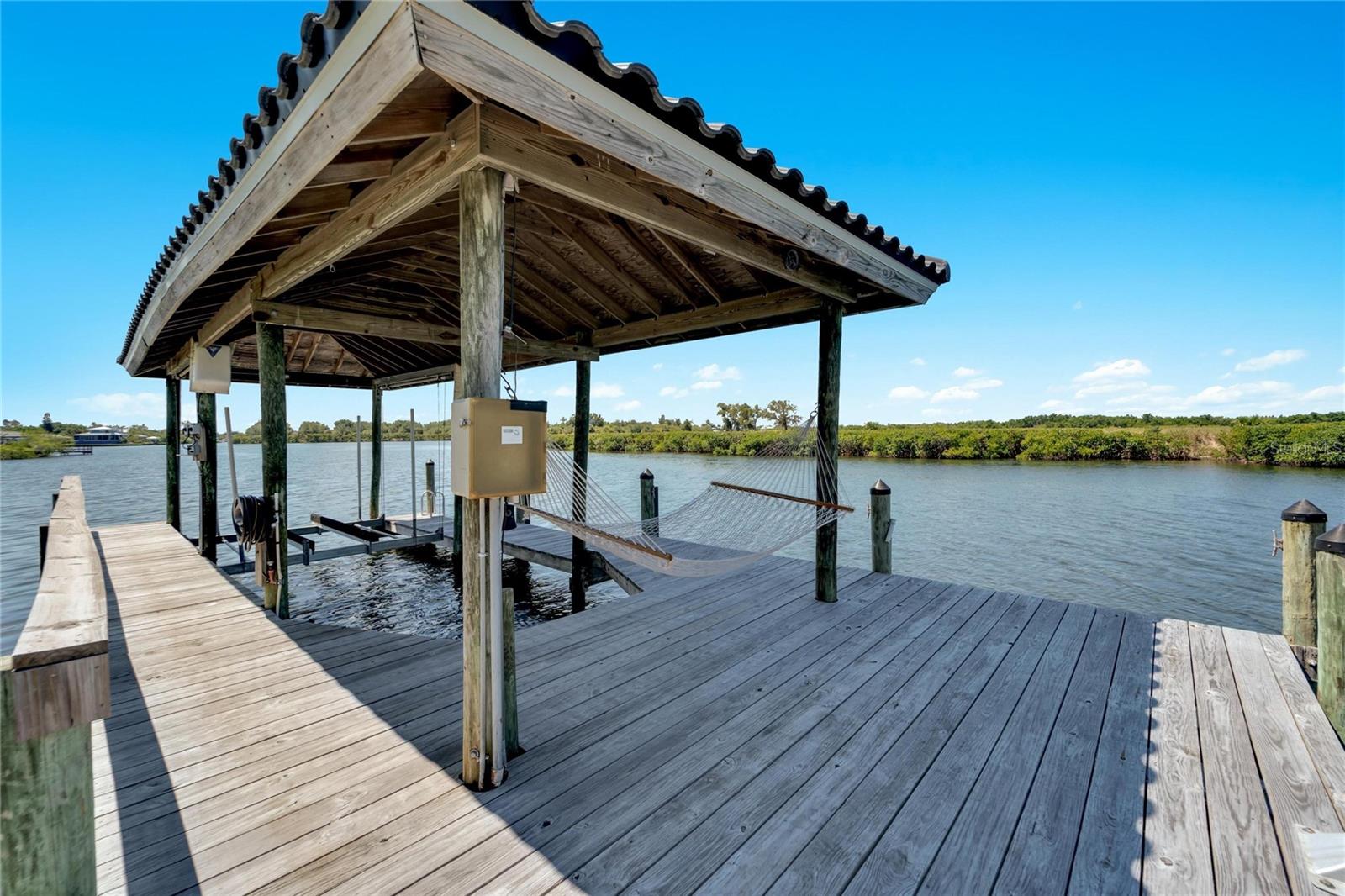 Check out your views from this coastal luxury waterfront POOL home with 140 feet of water shoreline! This exquisite property features 4 bedrooms and 3 full and one half bathrooms with wraparound water views including stunning views of Tampa Bay and the St. Petersburg skyline. Prepare to be captivated by the breathtaking sunset views. As you enter this coastal paradise, you're greeted by panoramic water views, 13 foot ceilings, travertine flooring throughout, an inviting great room with gas fireplace and dining area open to the kitchen with an additional seating area. This home is an entertainer's dream. Sliders from living area lead out to your heated salt water pool and covered lanai area. This makes for a perfect set up for all your gatherings. When its time to unwind head to the primary bedroom with ensuite and 2 walk-in closets, plus sliders that lead out to the lanai area. The primary bath includes double sink vanity, separate soaking tub and walk-in shower. Opposite side of the home you will find a guest bedroom with ensuite, plus 2 additional bedrooms and full hallway bathroom. The attractive staircase leads to laundry room with sink and work area. From here you will enter into your garage with 5 panel doors for boat and lifted truck clearance. Garage space includes 2,900 sq. ft., workshop area and half bath. This space can hold up to 6 cars. This kind of storage is hard to find! Outside is where you will be spending most of your time. Enjoy your own private dolphin and manatee show from your covered boat dock with water, electric, fishing station, and 12,000 pound boat lift that can house a 35 foot boat. Plenty of dock space to sit and relax and watch the show! Leaving from your dock you are minutes away from the open waters of Tampa Bay. This is truly a boater's paradise! Feel safe and secure with home security system and 24 hour gated community of Symphony Isles. Home and dock tile roof installed 2023. This home also includes well water for affordable lawn irrigation. The community of Symphony Isles features 24 hour guard security at gate, community clubhouse for all social gatherings, community pool, playground, boat ramp and private beach for residents. Get to know your neighbors and make lasting memories at the vibrant community events throughout the year-from lively casino and Miami Vice nights to end-of-school-year party, and the dazzling Christmas lights that transform the entire neigborhood into a holiday wonderland all this and NO CDD!! Travel time to Tampa International Airport is 25 miles (35 minutes) MacDill Air Force Base is 27 miles (40 minutes) 1 hour to the beautiful beaches of Tampa Bay. This is the one!! Property taxes reflect no homestead.