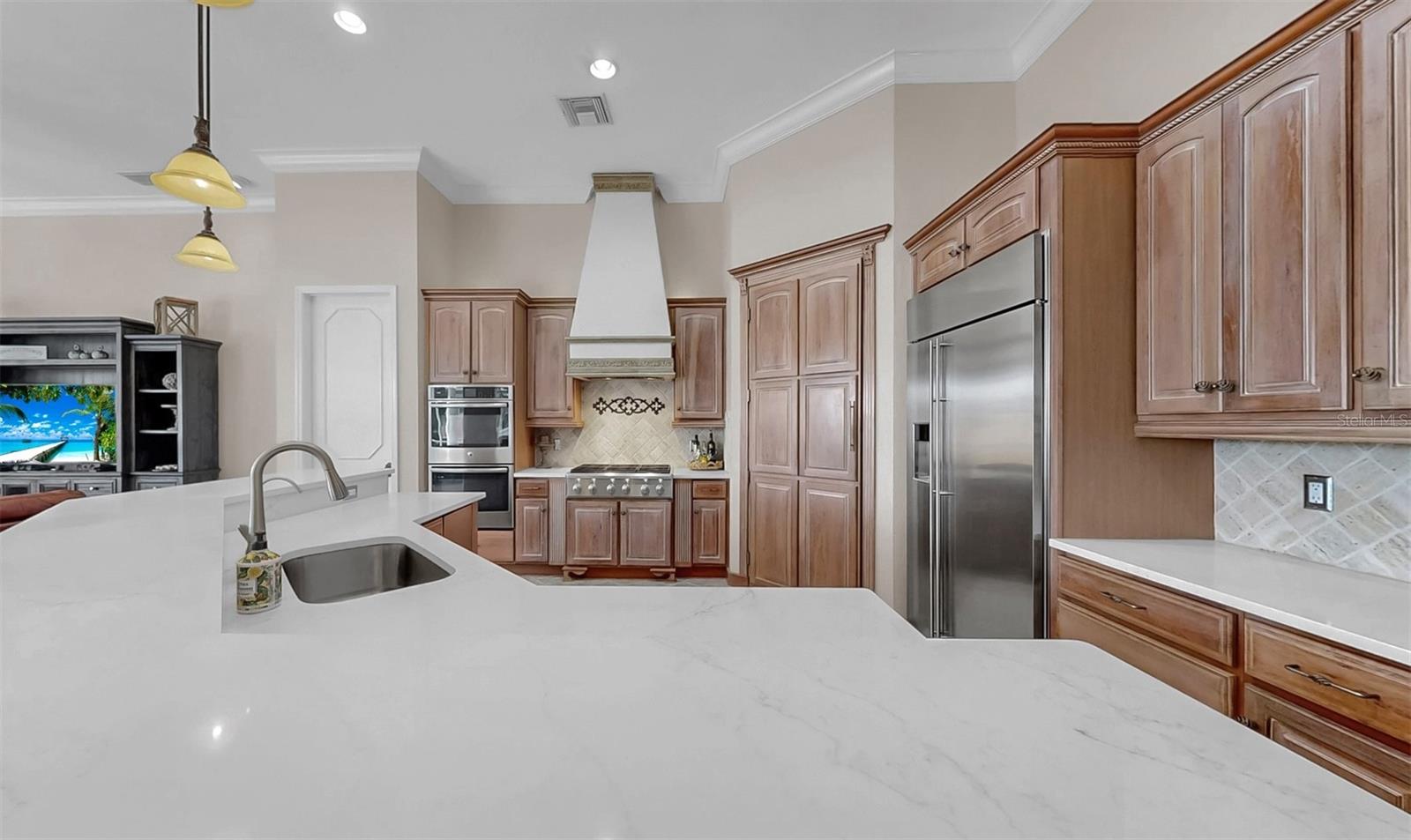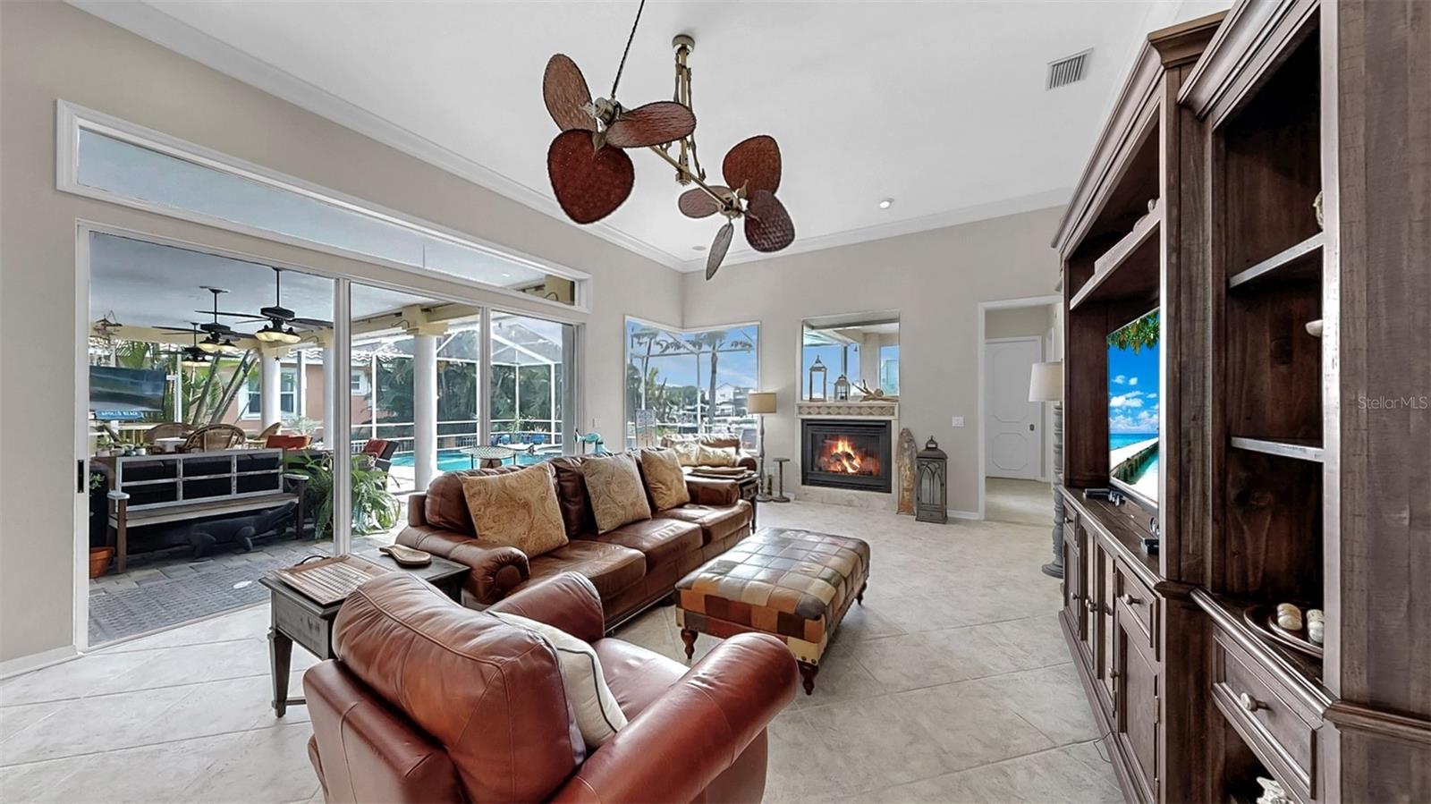 Experience the epitome of luxurious waterfront living in this elegant Spanish-Mediterranean residence, boasting a grand circular driveway and coveted canal-front access. From the moment you arrive, you're greeted by lush landscaping framed by over 19 tall palms. Step through brand-new double doors into a refined formal living and dining space, featuring marble floor accents and serene pool oasis views. A custom-built wet bar and abundant formal seating set the tone for sophisticated entertaining. The gourmet kitchen is a culinary masterpiece, opening to a spacious family room with a gas fireplace. It showcases custom cabinetry, brand-new quartz countertops, a large island, stainless steel appliances, wall-mounted oven, gas cooktop, and a premier reverse osmosis water filtration system. A walk-in pantry and breakfast nook offer canal and pool views, while the windows flood the home with natural light. High ceilings, crown molding, plantation shutters, and tile throughout create a cohesive, luxurious atmosphere, complemented by a comprehensive in-home and outdoor surround-sound system. Retreat to the master suite, which opens directly to the pool area and features expansive walk-in closets and a spa-inspired bath. Revel in travertine walls, custom cabinetry with dual vessel sinks, a granite-topped vanity, a clawfoot bathtub, a separate shower, bay windows, and exquisite lighting. The split-bedroom floor plan ensures privacy, with three additional bedrooms and baths on the opposite wing, all finished with custom cabinetry, travertine details, and stylish vessel sinks. Key updates include a new roof (2025), all new windows in the front of the house, a recently upgraded water heater, and a seawall with vinyl sheet piling and a reinforced concrete cap designed for 30+ years of life. Outside, enjoy a heated saltwater pool with LED multi-color lighting, self-cleaning equipment, and a spa set within a gorgeous paver patio. The brand-new dock rebuilt in 2024 accommodates a 10,000 lb. boat lift, inviting effortless seafaring adventures. A dream location, in just five minutes you're in the open bay, perfect for boating, kayaking, dolphin watching, and fishing. This home sits in Symphony Isles, a gated community offering 24-hour manned security, a private beach with a gazebo, beach volleyball, a community pool, a boat ramp, playground, and a vibrant recreational building for celebrations. Fun fact; this remarkable home was once owned by Nick Carter of the Backstreet Boys, adding a touch of Hollywood provenance to an already exceptional property. Call to schedule your private tour today and experience the luxury of waterfront living at its finest.