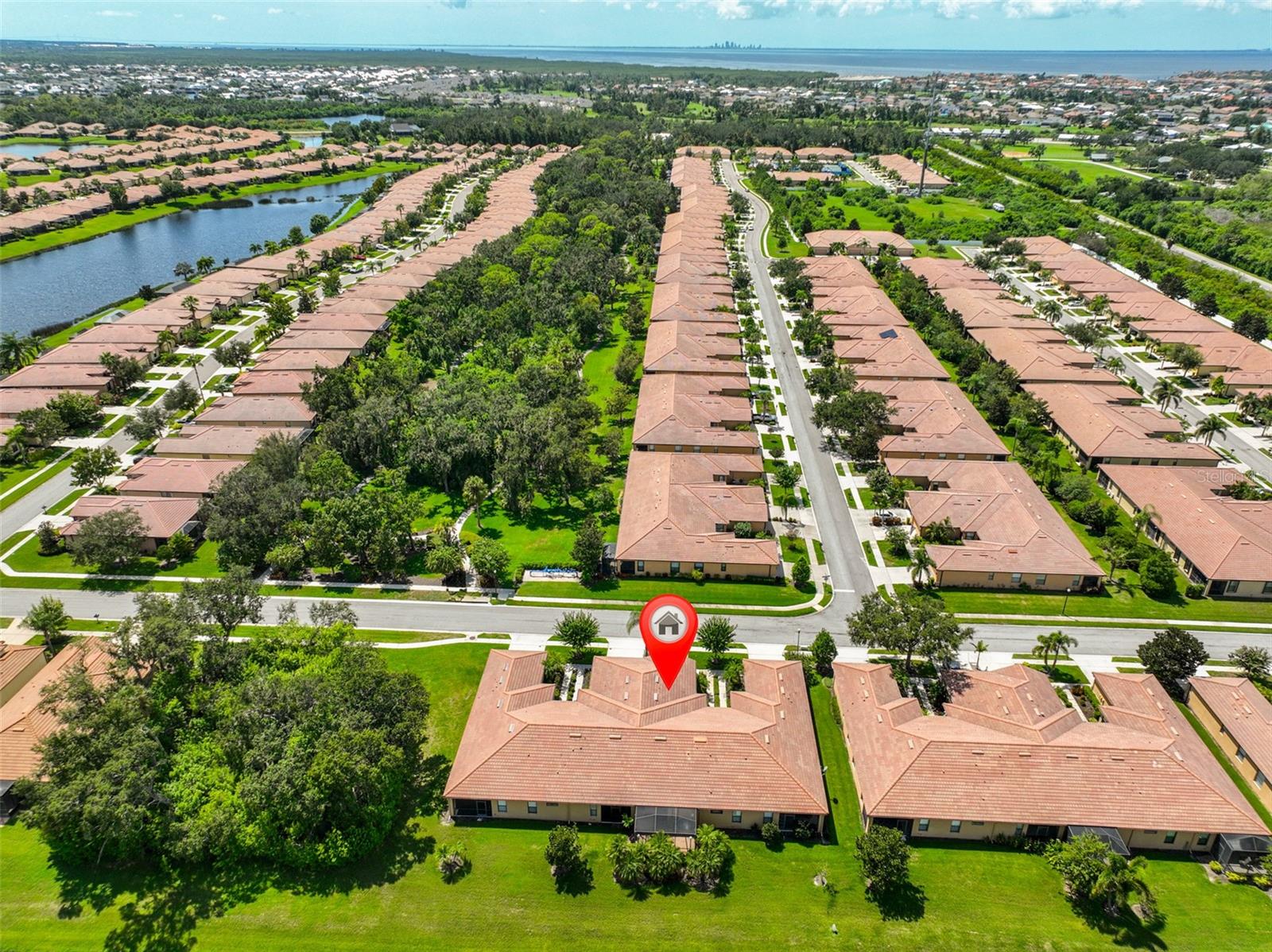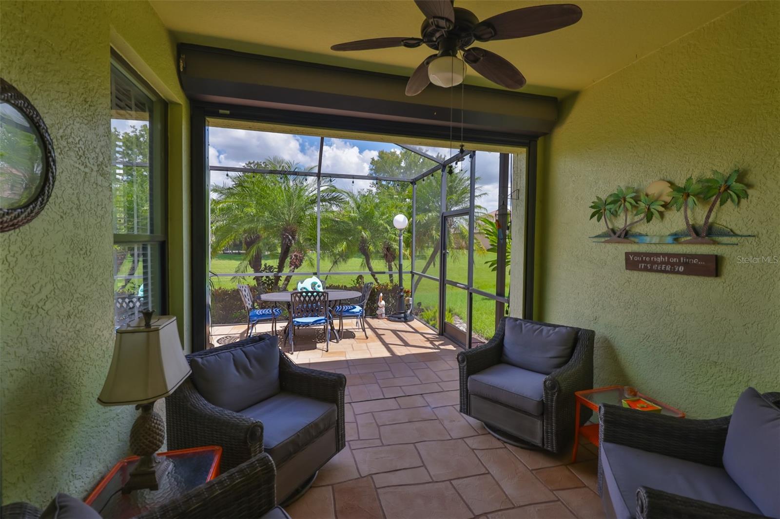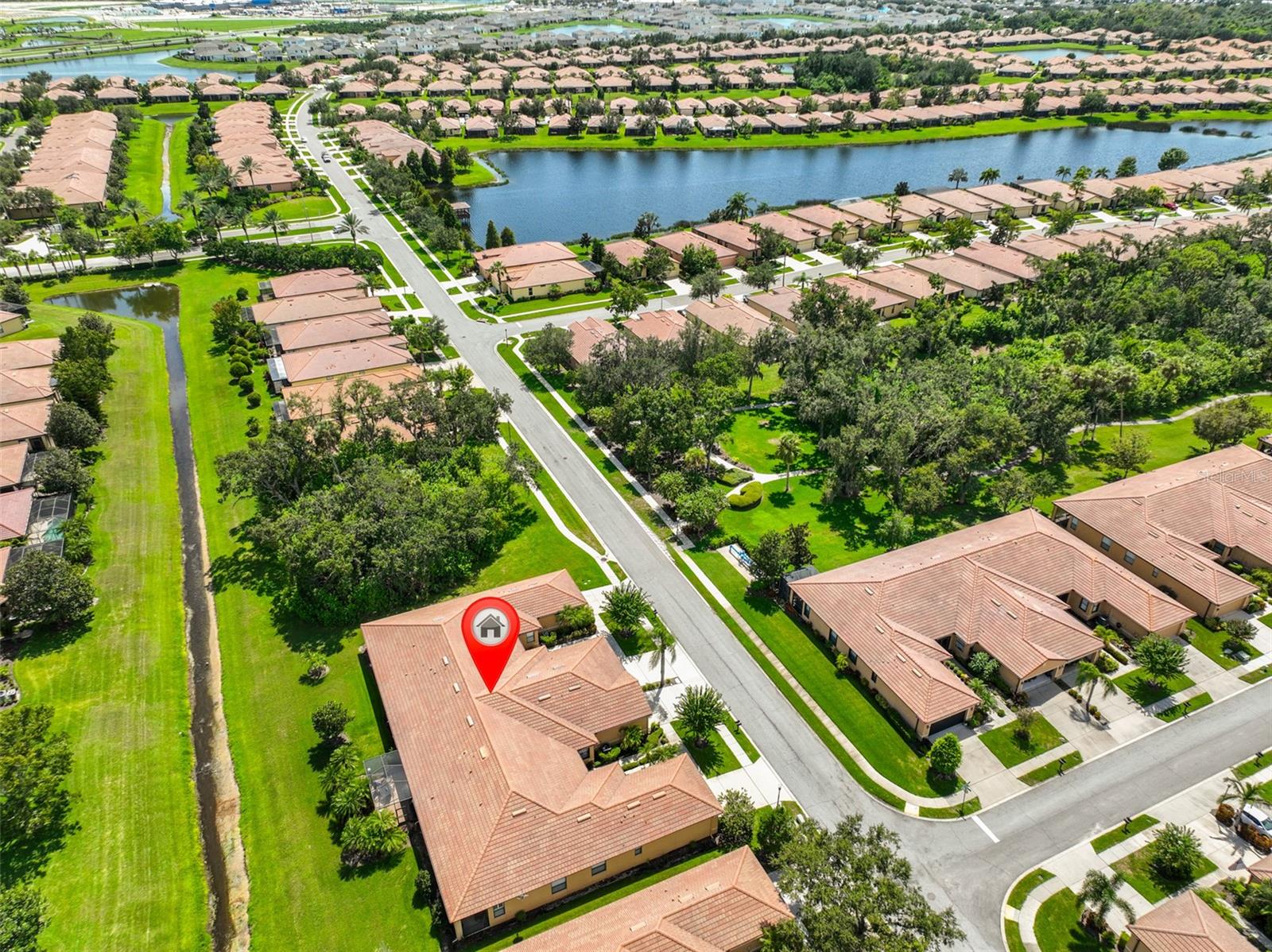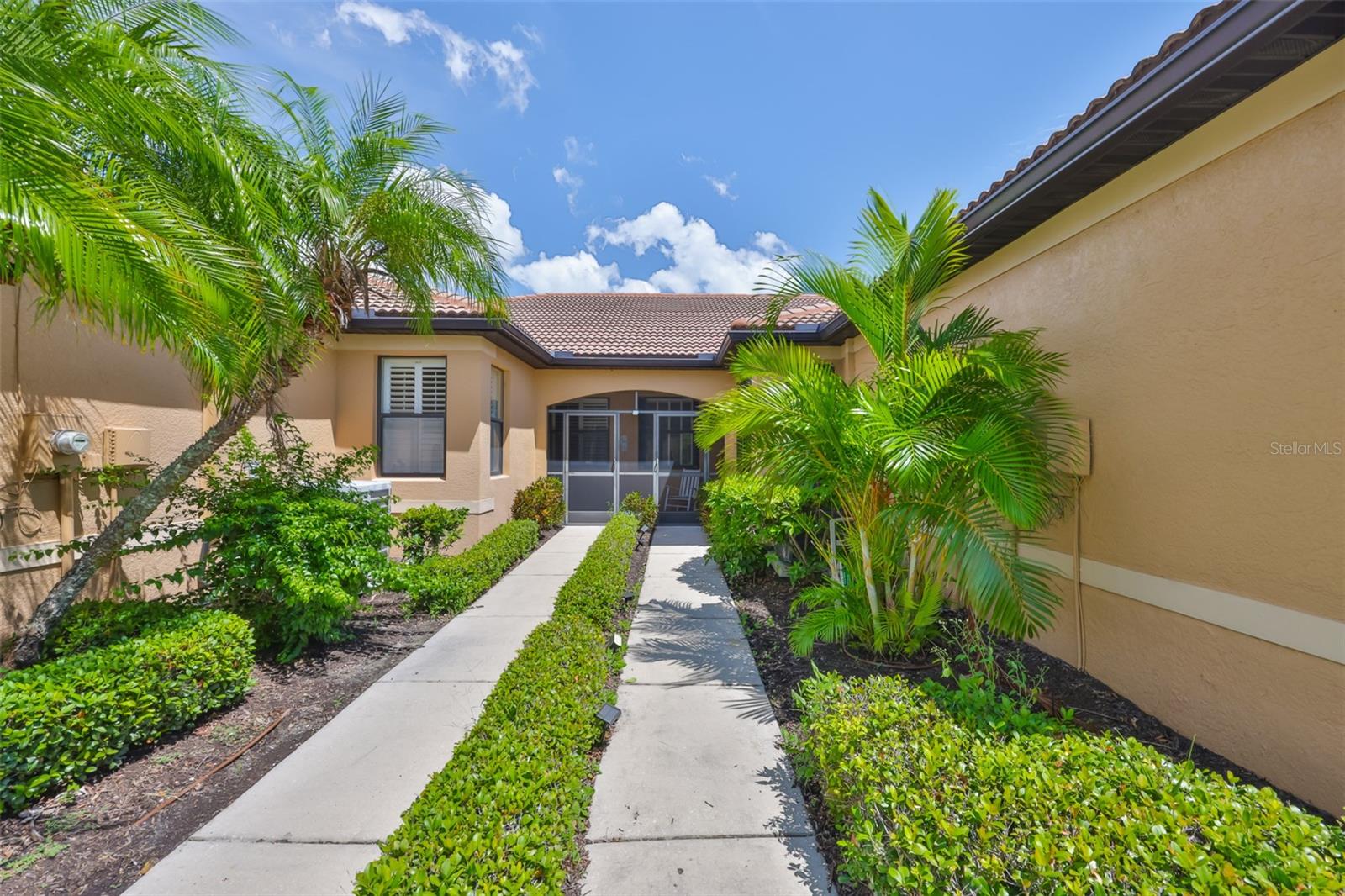 Welcome to your Oasis in the Paradise of SouthShore Falls... the Premiere 55+ Community on the West Coast of Florida! This Meticulously maintained home has it ALL with NEW A/C unit(2024), Freshly painted interior(2025), a 2 year Choice Home Warranty, Huge extended Lanai surrounded by Palm Trees and ALL windows have carefree Roll Shield Accordion Storm Shutters and a remote control Roll down Shutter on the lanai! As you step through the screened porch and enter through the front door of this stunning 2b, 2b, PLUS Flex room(optional 3rd bdrm), you will see all the beautiful upgrades: Beautiful inlaid tile entry and diagonally set tile giving the home a rich feeling throughout, arched doorways and rounded wall corners, and BONUS... All 4 TV'S ARE INCLUDED! The gourmet kitchen features bright white cabinetry, white appliances, large pantry and breakfast bar with beautiful pendant lighting above. There is a kitchen nook PLUS a dining room area that leads to the spacious Great Room overlooking the huge extended lanai and plush greenery! The Primary Suite is very spacious with a huge Walk-in Closet and En-Suite bathroom with Dual Sinks and Step-in Shower. The 2nd bedroom is very spacious near the guest bath, with tub and shower just steps away and the split floor plan affords your guests privacy. The Flex room makes a great office or 3rd bedroom! There is an inside laundry closet with washer dryer hookups, but this seller preferred setting up laundry in the spacious 2 car garage, however you can move the washer and dryer back inside home if you prefer! (Seller liked having the closet to use for storage and an additional pantry. The extended lanai is the ultimate dream of all patios, completely tiled, remote controlled roll down storm shutter and surrounded by palm trees and foliage. This home is located near the beautiful paved walking trail that meanders through the lush woods that take you to the rear pool and pickleball courts! Other features include: Ceiling Fans throughout, 2 car Garage with auto opener, utility sink & Storage cabinets, Pest Service monthly by Home Team, 2 year Choice home warranty included/transferrable and the list goes on! This is a must see above and beyond all the rest! Enjoy Resort-style living in this 24-hour Gated Community...Florida's Best Kept Secret Beyond Compare... Very low HOAs (NO CDDs) Pets Welcome! Spectacular recreation area in a Vacation-Style setting with Lagoon Heated pool, Resistance Pool, Spa, state-of-the-art Fitness Center, Water Aerobics, Bike Club, Walking Trails, Golf putting greens, Bocce & Pickle Ball & Tennis courts, Arts and Crafts, Billiards, Library, Card Clubs, Internet café and so many daily activities and Entertainment in the Expansive Clubhouse! Very close to World Renowned Sugar Sand beaches in any direction, Golf Courses, a public boat launch, Freedom Boat Club, Tampa Bay City Life, International Airports and Hospitals. So, Come on, get away from it all at Del Webb SouthShore Falls Paradise and Live, Laugh, and Love Life!