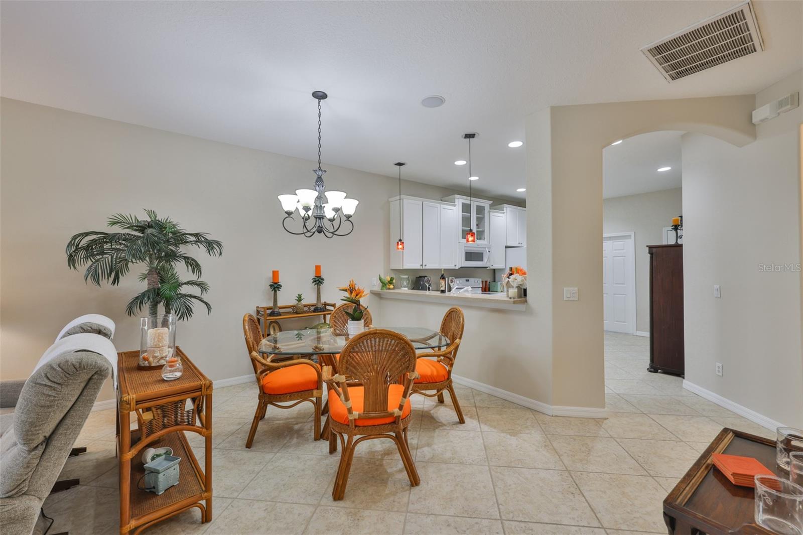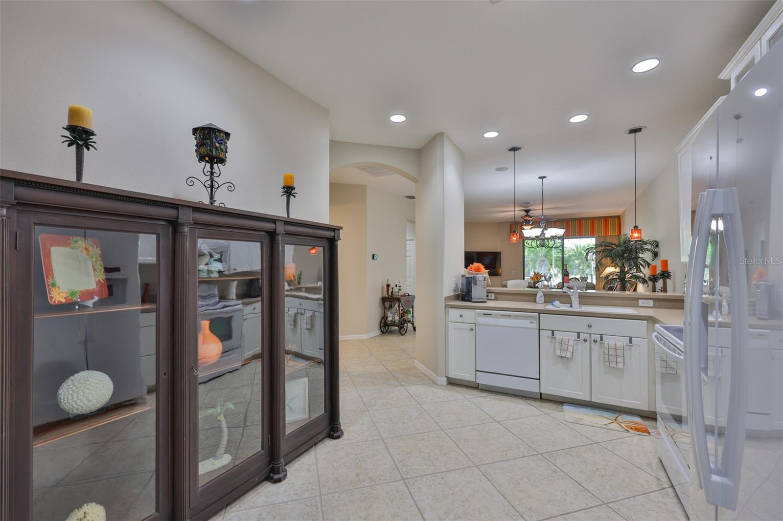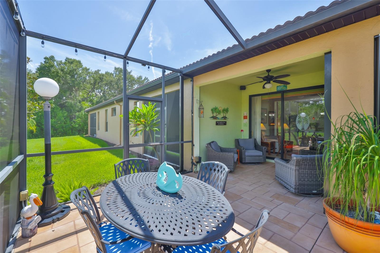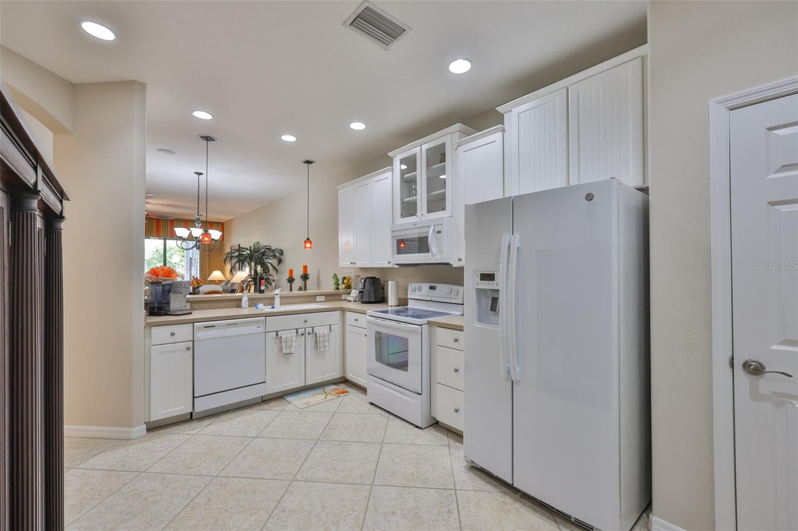 Welcome to your Oasis in the Paradise of SouthShore Falls... the Premiere 55+ Community on the West Coast of Florida! This Meticulously maintained home has it ALL with NEW A/C unit(2024), Freshly painted interior(2025), a 2 year Choice Home Warranty, Huge extended Lanai surrounded by Palm Trees and ALL windows have carefree Roll Shield Accordion Storm Shutters and a remote control Roll down Shutter on the lanai! As you step through the screened porch and enter through the front door of this stunning 2b, 2b, PLUS Flex room(optional 3rd bdrm), you will see all the beautiful upgrades: Beautiful inlaid tile entry and diagonally set tile giving the home a rich feeling throughout, arched doorways and rounded wall corners, and BONUS... All 4 TV'S ARE INCLUDED! The gourmet kitchen features bright white cabinetry, white appliances, large pantry and breakfast bar with beautiful pendant lighting above. There is a kitchen nook PLUS a dining room area that leads to the spacious Great Room overlooking the huge extended lanai and plush greenery! The Primary Suite is very spacious with a huge Walk-in Closet and En-Suite bathroom with Dual Sinks and Step-in Shower. The 2nd bedroom is very spacious near the guest bath, with tub and shower just steps away and the split floor plan affords your guests privacy. The Flex room makes a great office or 3rd bedroom! There is an inside laundry closet with washer dryer hookups, but this seller preferred setting up laundry in the spacious 2 car garage, however you can move the washer and dryer back inside home if you prefer! (Seller liked having the closet to use for storage and an additional pantry. The extended lanai is the ultimate dream of all patios, completely tiled, remote controlled roll down storm shutter and surrounded by palm trees and foliage. This home is located near the beautiful paved walking trail that meanders through the lush woods that take you to the rear pool and pickleball courts! Other features include: Ceiling Fans throughout, 2 car Garage with auto opener, utility sink & Storage cabinets, Pest Service monthly by Home Team, 2 year Choice home warranty included/transferrable and the list goes on! This is a must see above and beyond all the rest! Enjoy Resort-style living in this 24-hour Gated Community...Florida's Best Kept Secret Beyond Compare... Very low HOAs (NO CDDs) Pets Welcome! Spectacular recreation area in a Vacation-Style setting with Lagoon Heated pool, Resistance Pool, Spa, state-of-the-art Fitness Center, Water Aerobics, Bike Club, Walking Trails, Golf putting greens, Bocce & Pickle Ball & Tennis courts, Arts and Crafts, Billiards, Library, Card Clubs, Internet café and so many daily activities and Entertainment in the Expansive Clubhouse! Very close to World Renowned Sugar Sand beaches in any direction, Golf Courses, a public boat launch, Freedom Boat Club, Tampa Bay City Life, International Airports and Hospitals. So, Come on, get away from it all at Del Webb SouthShore Falls Paradise and Live, Laugh, and Love Life!