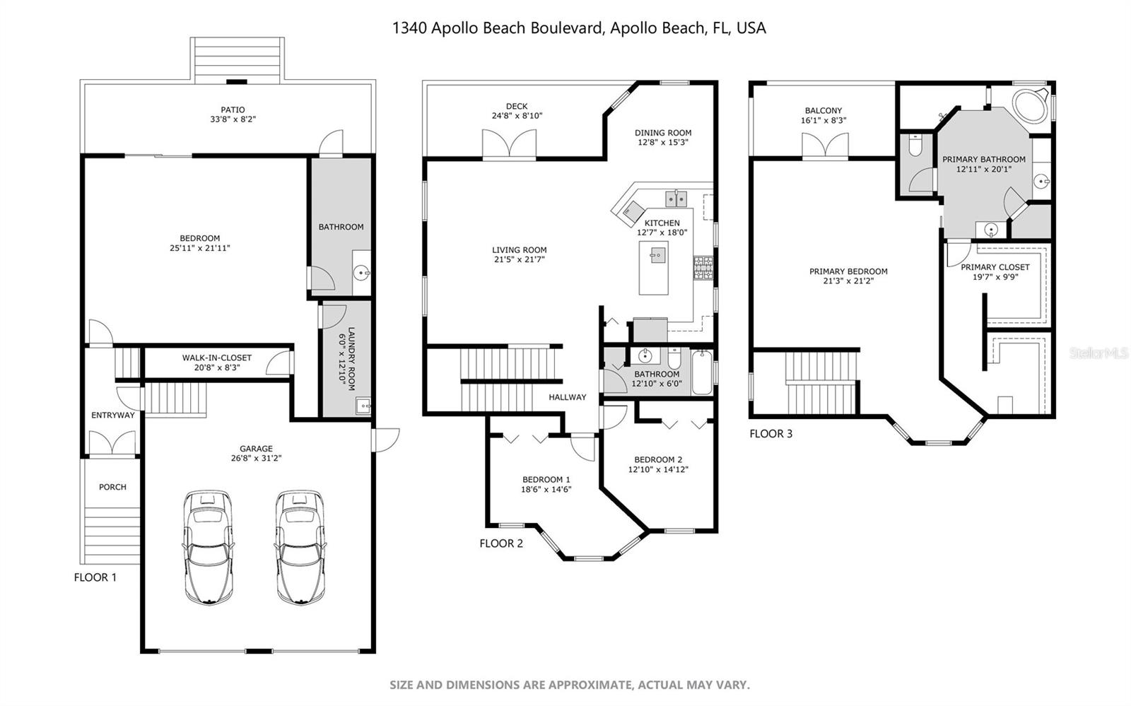 LOCATION!!! LOCATION!!! Welcome to this beautiful Key West style Apollo Beach Pool home. This property extends over three levels and offers ample space including 4 bedrooms, 3 baths, and a 2-car garage. A wood laid staircase greets you in the foyer and leads up into the main level. Hardwood flooring flows throughout this well-maintained home. The main living space has ample lighting and great views of the water and Apollo Beach. The large master bedroom has access to the balcony, two-person walk-in closet, and a luxurious bath with garden tub, separate shower, water closet and double vanities. The oversized fourth bedroom located on the bottom level can easily serve as a mother-in-law suite and has two direct access points to the pool, with one being the ensuite bath making it the perfect pool bath. Custom laundry chute adds extra convenience located on each level leading to the bottom floor indoor laundry room. There are water views from both the front and back of the home. The property is a tropical paradise with extensive landscaping and your own private fenced in pool. Just a short walk or bicycle ride to "Apollo Beach Nature Preserve" and local restaurants. Join in racquetball, team & individual sports, and swim at nearby Spurlino YMCA, Apollo Beach Racquet Club, and County Park and Rec Centers. Several golf courses in Riverview and Sun City Center. Apollo Beach is conveniently located close to Major Highways, Shopping, Doctors & Restaurants, and is a just a Boat Trip across the Bay to Downtown Tampa, St. Pete, and the gorgeous Gulf Beaches. No HOA or CDD. A/C Replaced 07/2022