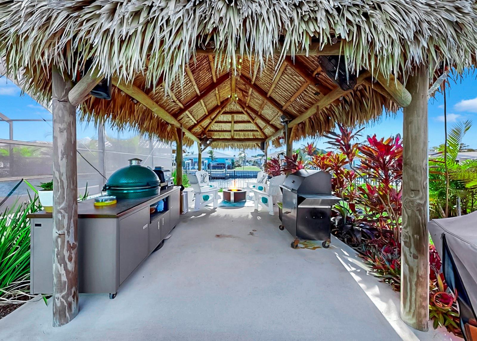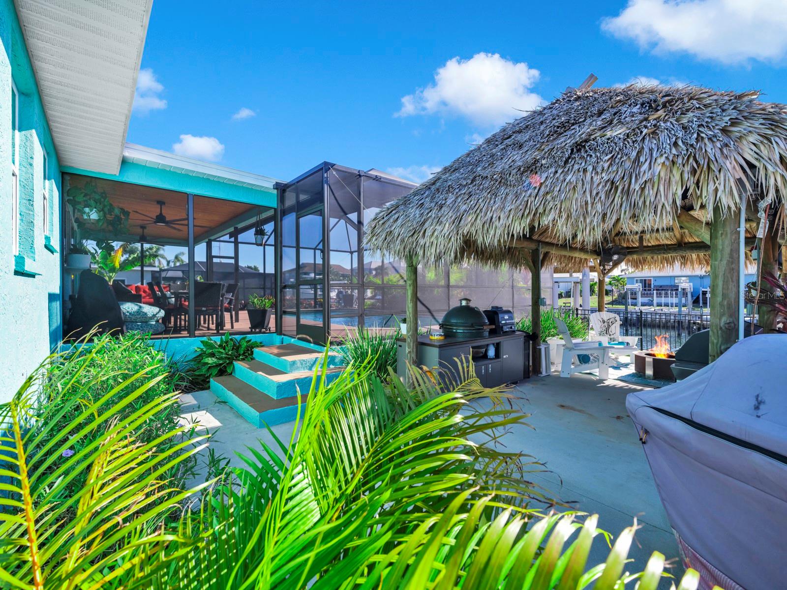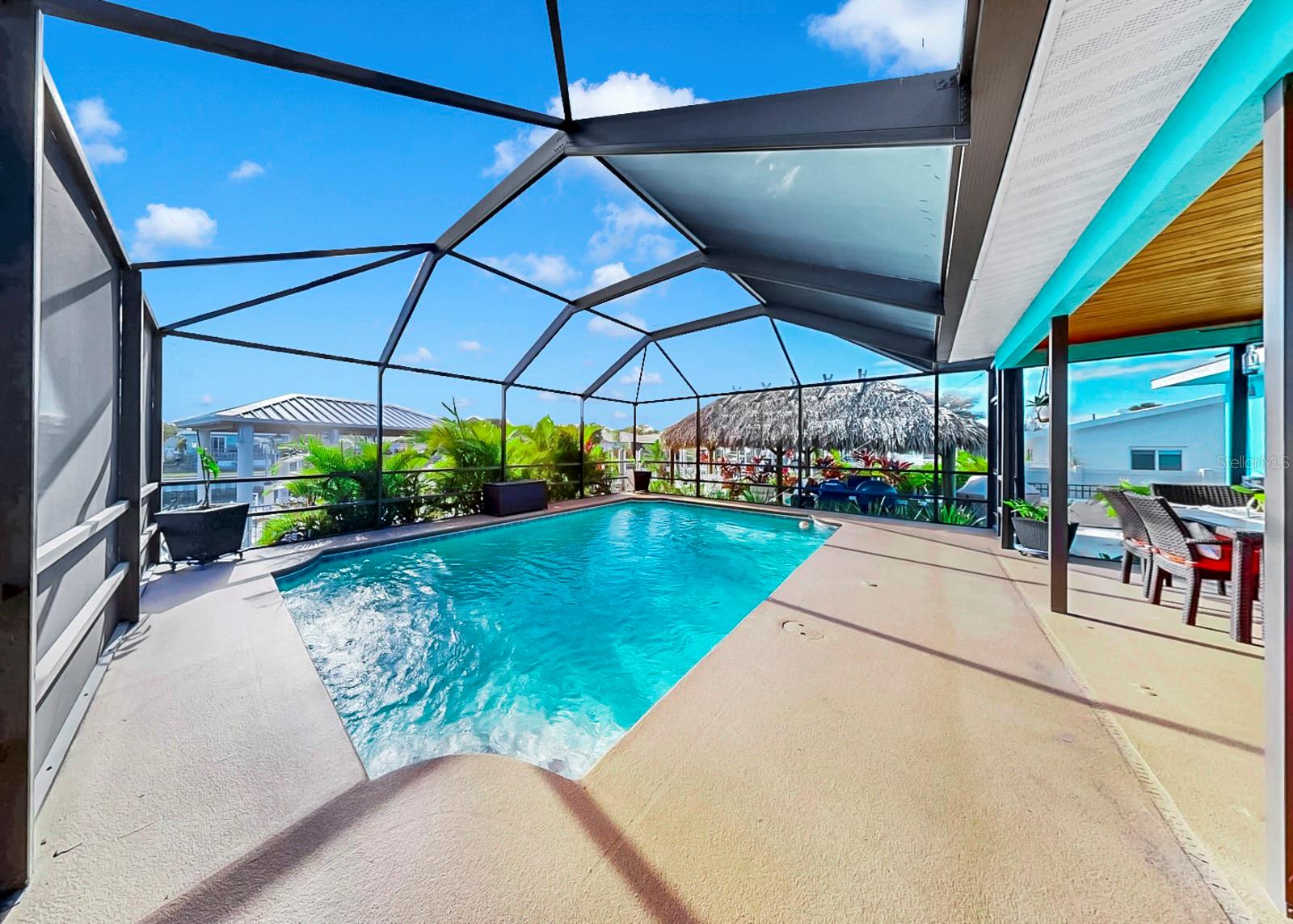 A TRUE Waterfront Style of Living! Immerse yourself in this sun-drenched oasis nestled high and dry where Tiki time, volleyball in the pool, and boating are integrated joyfully into everyday life! Upon entering, every corner invites relaxation and connection to a Tropical outdoor haven. Modern and like brand new, this home has been thoughtfully remodeled and modernized. Upgraded are all the major components of the home, but also hard to find features have been implemented! Garage with AC, RV Parking pad with hooks up and trailer tie downs, whole home surge protection, Gem exterior lighting, extra insulation and garage door screen, a massive tiki hut with power and shade! Lush landscaping, sod, solar, saltwater pool, Nebula lighted pool cage, newer composite seawall, and massive walk around dock with a 14K lift. Inside you will find a flare unlike any other home that will WOW your friends and family and is truly magazine worthy! Bosch Appliances, automated window shades, Toto commodes, pex plumbing, freshly painted and a cool garage space with ceiling storage and gear walls. This unique home is not in an HOA, did not flood, and has a new roof! Dock up and tour this remarkable home where island time vibes and modern features create a magically timeless sanctuary. You will love the privacy and sunsets!