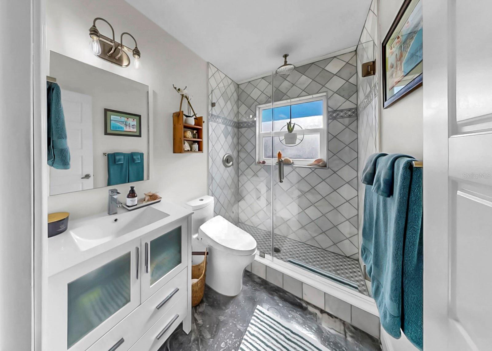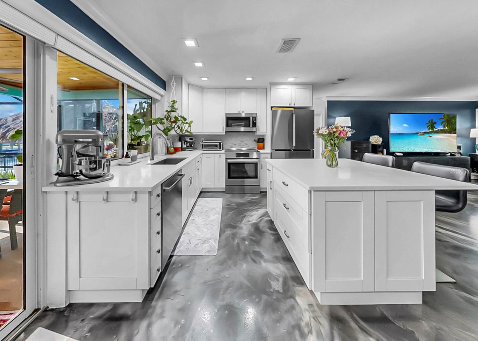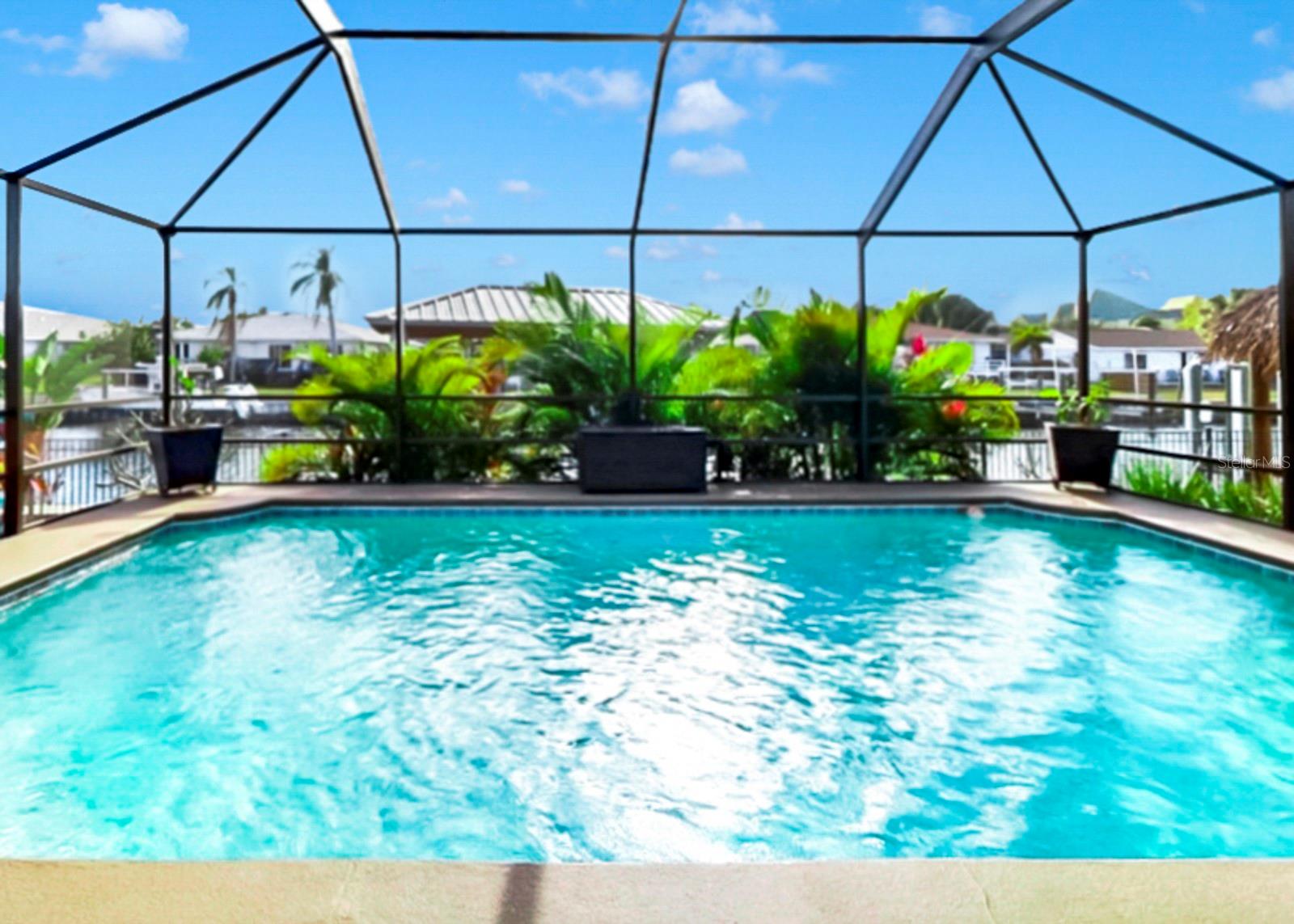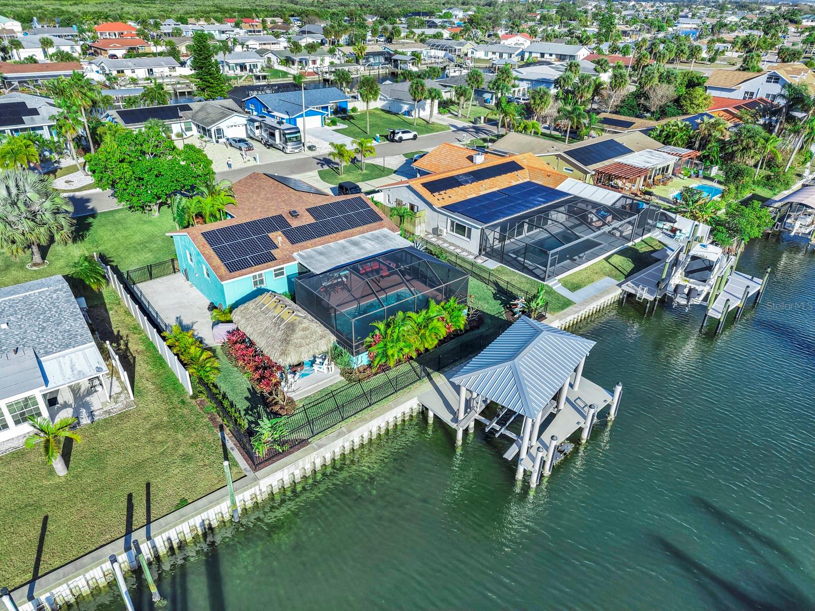 A TRUE Waterfront Style of Living! Immerse yourself in this sun-drenched oasis nestled high and dry where Tiki time, volleyball in the pool, and boating are integrated joyfully into everyday life! Upon entering, every corner invites relaxation and connection to a Tropical outdoor haven. Modern and like brand new, this home has been thoughtfully remodeled and modernized. Upgraded are all the major components of the home, but also hard to find features have been implemented! Garage with AC, RV Parking pad with hooks up and trailer tie downs, whole home surge protection, Gem exterior lighting, extra insulation and garage door screen, a massive tiki hut with power and shade! Lush landscaping, sod, solar, saltwater pool, Nebula lighted pool cage, newer composite seawall, and massive walk around dock with a 14K lift. Inside you will find a flare unlike any other home that will WOW your friends and family and is truly magazine worthy! Bosch Appliances, automated window shades, Toto commodes, pex plumbing, freshly painted and a cool garage space with ceiling storage and gear walls. This unique home is not in an HOA, did not flood, and has a new roof! Dock up and tour this remarkable home where island time vibes and modern features create a magically timeless sanctuary. You will love the privacy and sunsets!