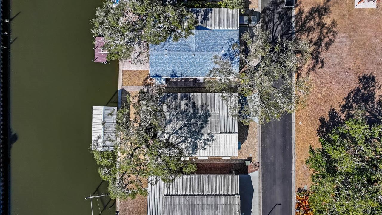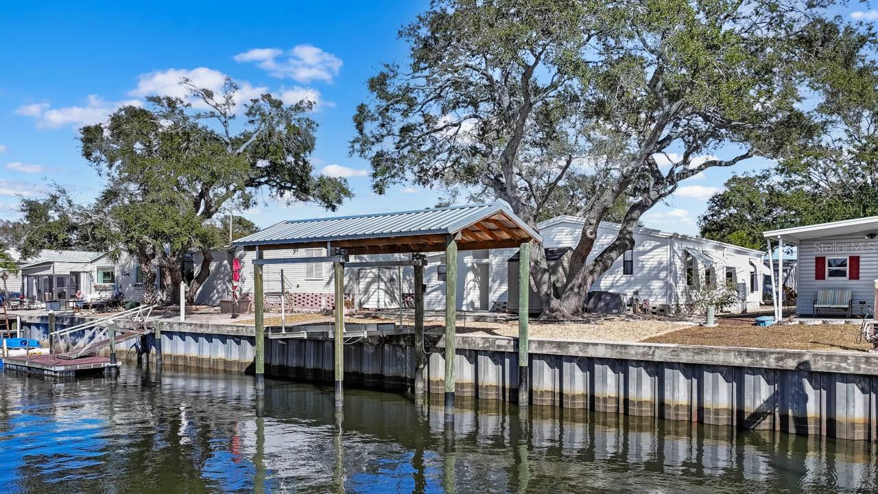 One or more photo(s) has been virtually staged. Wake up to the gentle rhythm of life on the water with 50 feet of WATERFRONT frontage on Saint Georges Canal! With direct access to Tampa Bay, launch your boat from your backyard, as the home includes an 8,000 pound Sea Mount BOAT LIFT that was added in 2023. As a shareholder you will pay NO LOT RENT or CDD, just an affordable $242.00 a month Maintenance Fee. Shaded by mature trees, this 2-bedroom, 2-bath home offers a peaceful waterfront patio where mornings often begin with coffee and end with watching manatee and dolphin glide by. The home features a comfortable layout with a primary bedroom and en-suite bath, plus a second full bath—both with WALK-IN SHOWERS. Just off the living area, a 156-square-foot partially enclosed BONUS ROOM provides flexible space for a cozy den, home office, or creative retreat. And a whole house exhaust fan is an additional feature many homeowners love to have. A large storage shed includes the washer and dryer and offers plenty of room for tools, hobbies, or fishing and boating gear. Located in Caribbean Isles Residential Cooperative, a resident-owned, GATED 55+ waterfront community, life here moves at a relaxed, coastal pace. Residents enjoy a heated pool, clubhouse, indoor and outdoor shuffleboard, horseshoes, game and craft rooms, and a library. A full calendar of activities includes coffee and donuts, bingo, water aerobics, exercise and craft classes, movie nights, pool parties, and more. Launch your boat, then spend your days exploring mangroves, fishing local waters, or cruising toward Florida’s famous sunsets. Golf carts are welcome throughout the community’s approximately four miles of paved private roads. Pet friendly too? Yes, with restrictions. With a low monthly maintenance fee, this waterfront home offers true ownership, low monthly costs, and an easygoing lifestyle where every day feels a little more like vacation.