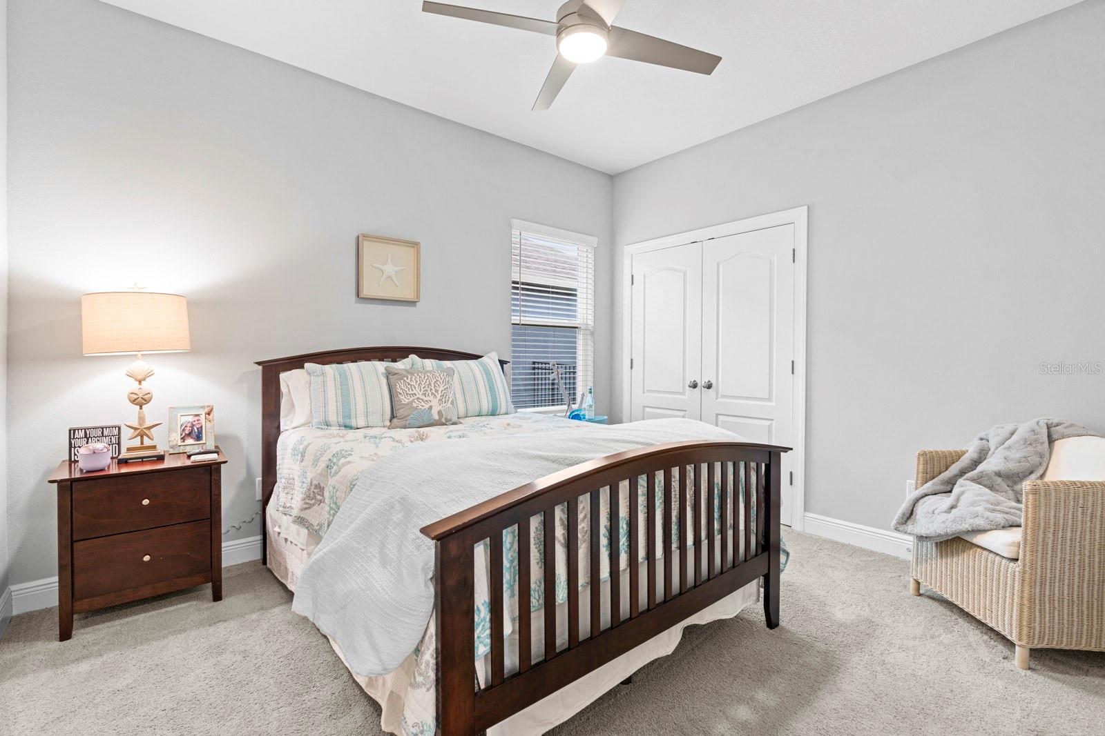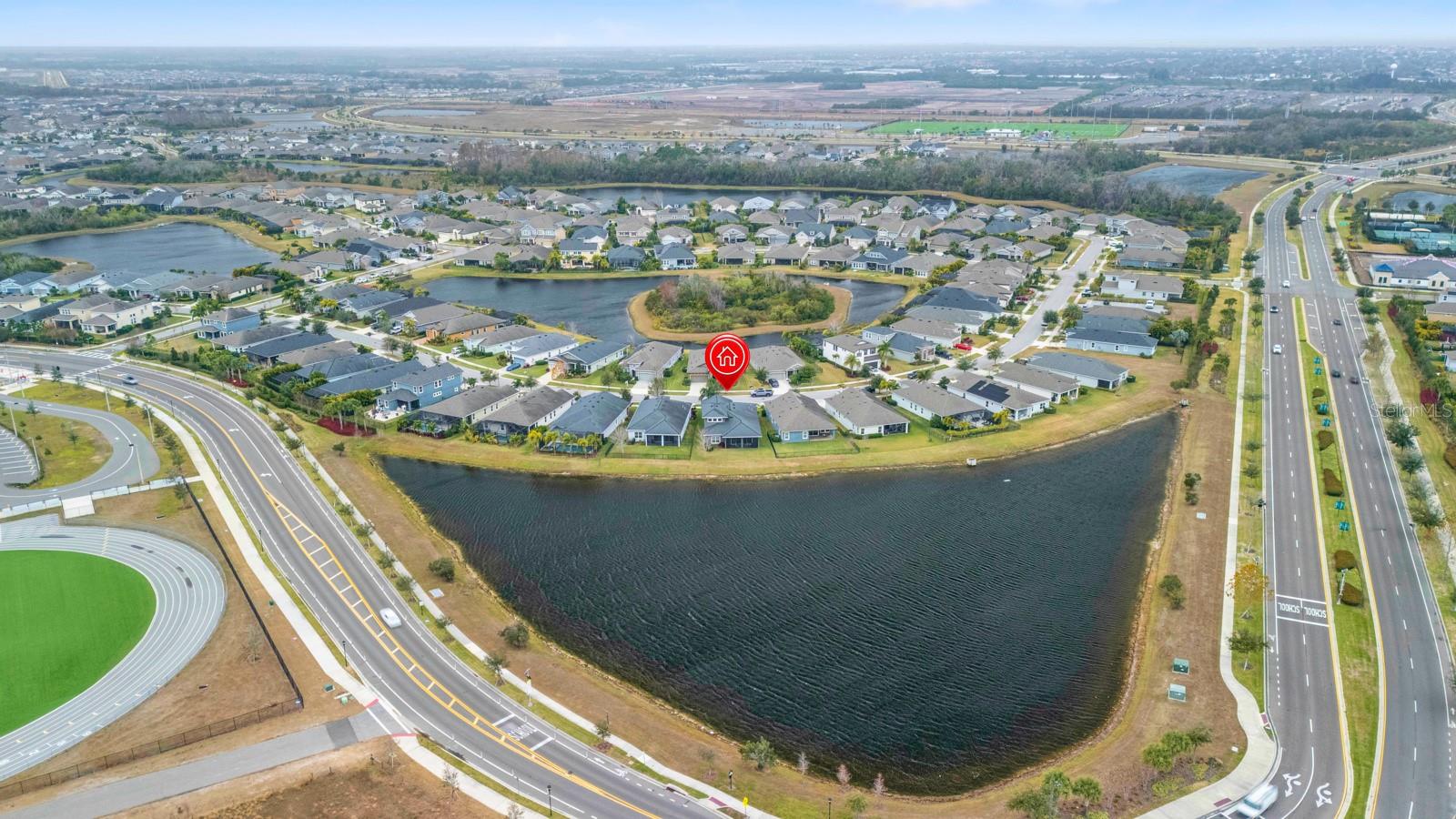 Beautiful water views and no backyard neighbors create a serene backdrop for this well-appointed Cardel Northwood II offering 4 bedrooms, 3 full baths, and a spacious bonus room. A tray-ceiling foyer welcomes you with immediate pond views and designer finishes throughout, including wood-look plank ceramic tile, upgraded lighting and fans, added windows, and a custom built-in fireplace feature wall. The thoughtfully designed layout features two secondary bedrooms and a shared bath at the front of the home, along with a flex room behind French doors—ideal for a guest room, office, or study. An oversized laundry room with utility sink and custom cabinetry adds everyday convenience. Upstairs, a large room with full bath provides the perfect space for guests, a media room, or work-from-home needs. The upgraded kitchen showcases stainless steel appliances, including a Samsung smart refrigerator, built-in oven, 5-burner gas cooktop, quartz countertops, soft-close cabinetry, a walk-in pantry, and a large island overlooking the dining and great room. A 16' pocket slider opens to the screened lanai, seamlessly blending indoor and outdoor living while maximizing the peaceful pond views. The private owner’s suite overlooks the water and features a spa-like bath with dual vanities, tiled walk-in shower, private water closet, and an oversized walk-in closet. Fresh interior and exterior paint, a whole-home water softener and filtration system, reverse osmosis, and an extended driveway complete the home. Residents enjoy access to Waterset’s pools, clubhouse, fitness centers, trails, sports courts, dog parks, and more.