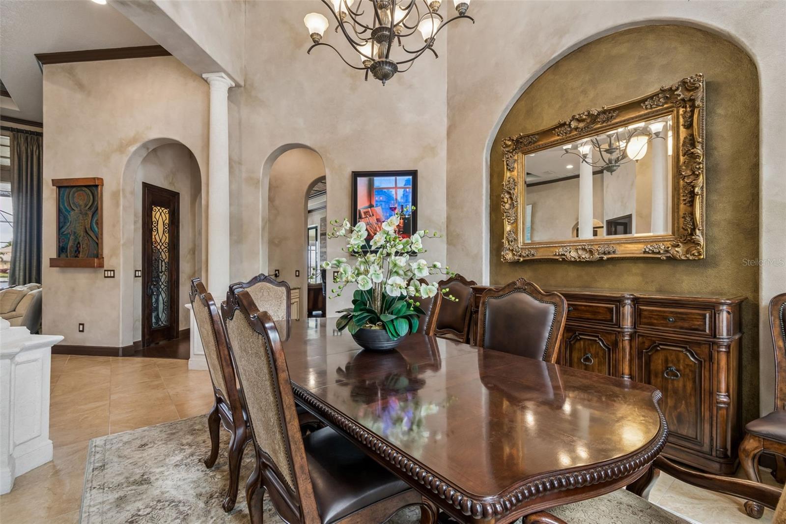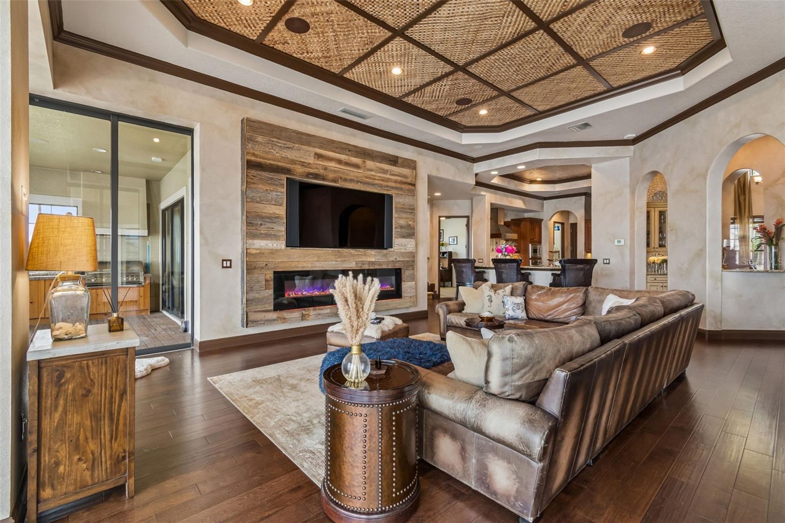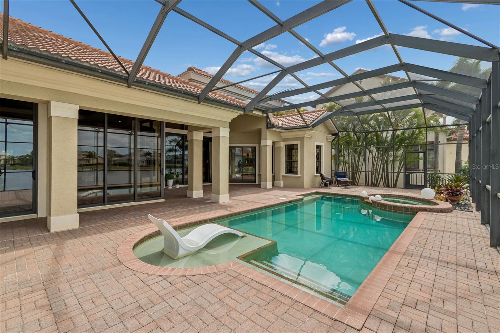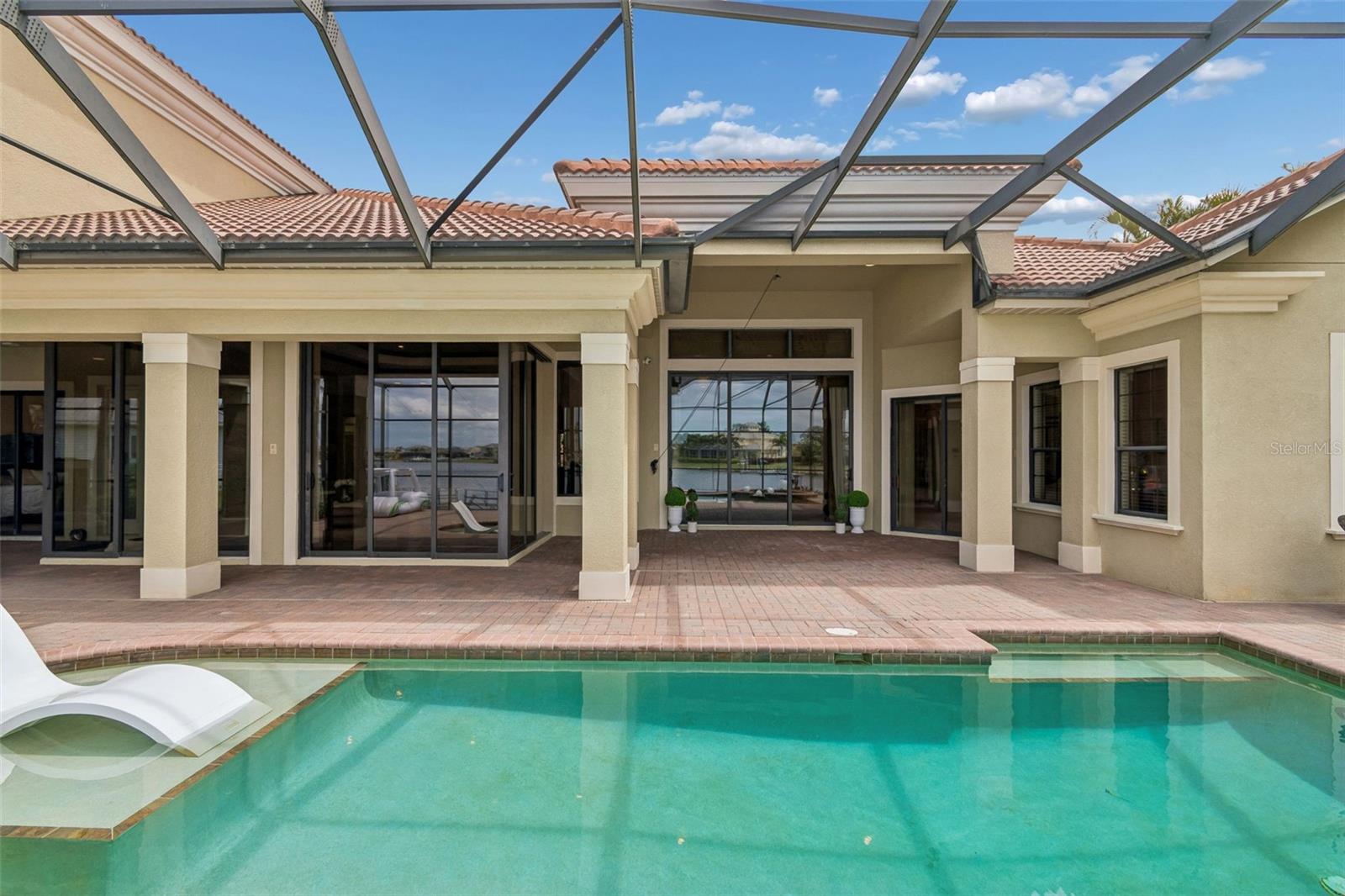 Welcome to a residence where thoughtful design, modern comfort, and timeless character come together in perfect harmony. From the moment you step inside, a soaring foyer draws your eye straight through the living room to the sparkling pool and the tranquil lagoon beyond, a breathtaking first impression that sets the tone for the entire home. Sunset views from the screened-in pool area are nothing short of spectacular. Inside, tall ceilings, custom finishes, and curated textures create a warm, inviting atmosphere that never feels cavernous despite the home’s generous scale. The wine closet, framed by a custom-carved wood detail over glass, pairs beautifully with the striking bar area featuring a mirror-mosaic wall treatment. The family room, kitchen, and eat-in space flow seamlessly together, anchored by an incredible barnwood feature wall with hidden storage, a 77" TV, and an LED fireplace. A woven bamboo ceiling and softly glazed walls add depth and sophistication. The chef’s kitchen is a dream workspace, equipped with Viking appliances, a gas cooktop, a pantry closet, a butler’s pantry, a prep sink, granite countertops, and abundant storage. A mica-accented ceiling inset adds a subtle glow. Nearby, the large laundry room offers a sink and additional storage. Three bedrooms are located on the main level, including the serene primary suite. Overlooking the pool and lagoon, it features a raised sitting area, a massive custom closet, and beautiful lighting. The spa-inspired primary bath includes a walk-in shower facing an outdoor water feature, dual vanities, a makeup area, and a private water closet. The second bedroom includes an ensuite bath and walk-in closet, while the third bedroom offers a large walk-in closet and peaceful water views. The screened-in pool area features brick decking, a gas fireplace, and a fully equipped outdoor kitchen with a brand-new built-in gas grill, tile countertops, and ample storage. The 15,000-square-foot lot includes 100 feet along the lagoon — one of Mirabay’s premier waterfront addresses. A low-maintenance riprap shoreline and a wood dock with power and water make it easy to enjoy kayaking, canoeing, or simply watching the sunset. Upstairs, you’ll find a private fourth bedroom with a walk-in closet, a full bath, and a spacious multipurpose room ideal for a home theater, fitness studio, or game room. Hand-painted ceiling details, textured walls, and a balcony overlooking the water add charm and character. Recent updates include three new AC units (2024 and 2026). The exterior is equally impressive, with lush tropical landscaping, split garages (one-car and two-car), and a wide paver driveway perfect for guests. A custom vertical fountain near the entry sets a soothing tone before you even step inside. There are custom decorative finishes throughout the home. Control4 home automation (multi-room audio, home theater, HVAC, partial interior lighting, monitored security, video surveillance, garage door control) provides comfort, convenience, and peace of mind. Located within a private gated enclave inside Mirabay, residents enjoy world-class amenities: pickleball, tennis, and basketball courts; a resort-style pool; a community restaurant; gym and sauna; playgrounds; yoga, stretch, and Zumba classes; plus complimentary kayaks, sailboats, and paddleboards. You truly never have to leave. And when you do, you’re just 30 minutes from downtown Tampa or St. Pete, and under an hour to Sarasota.