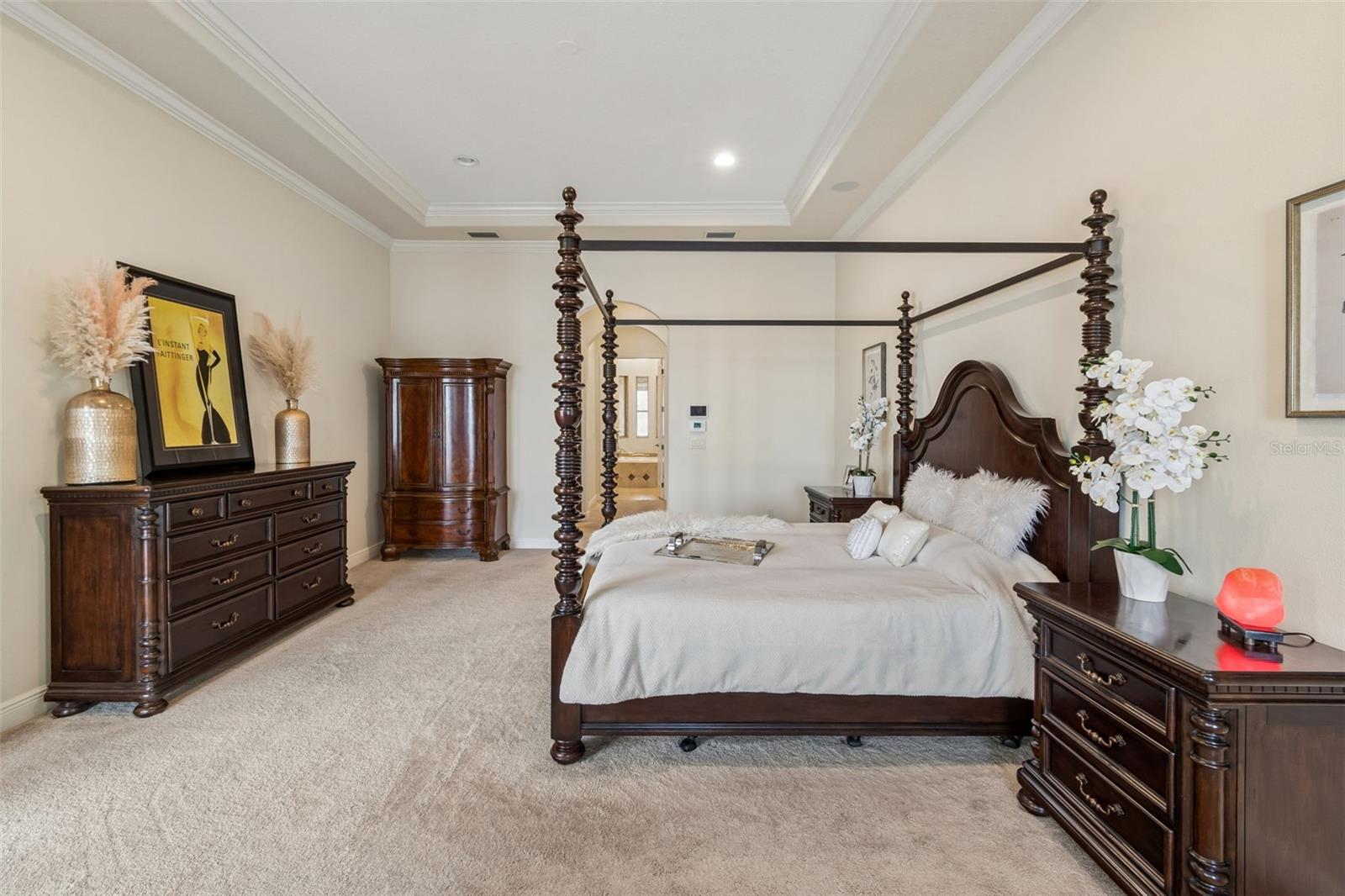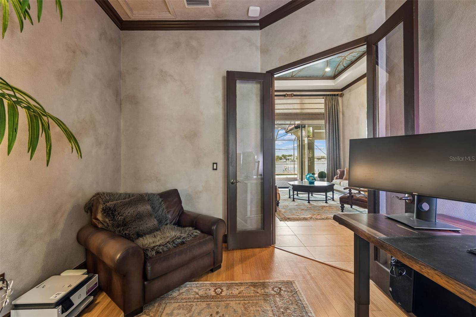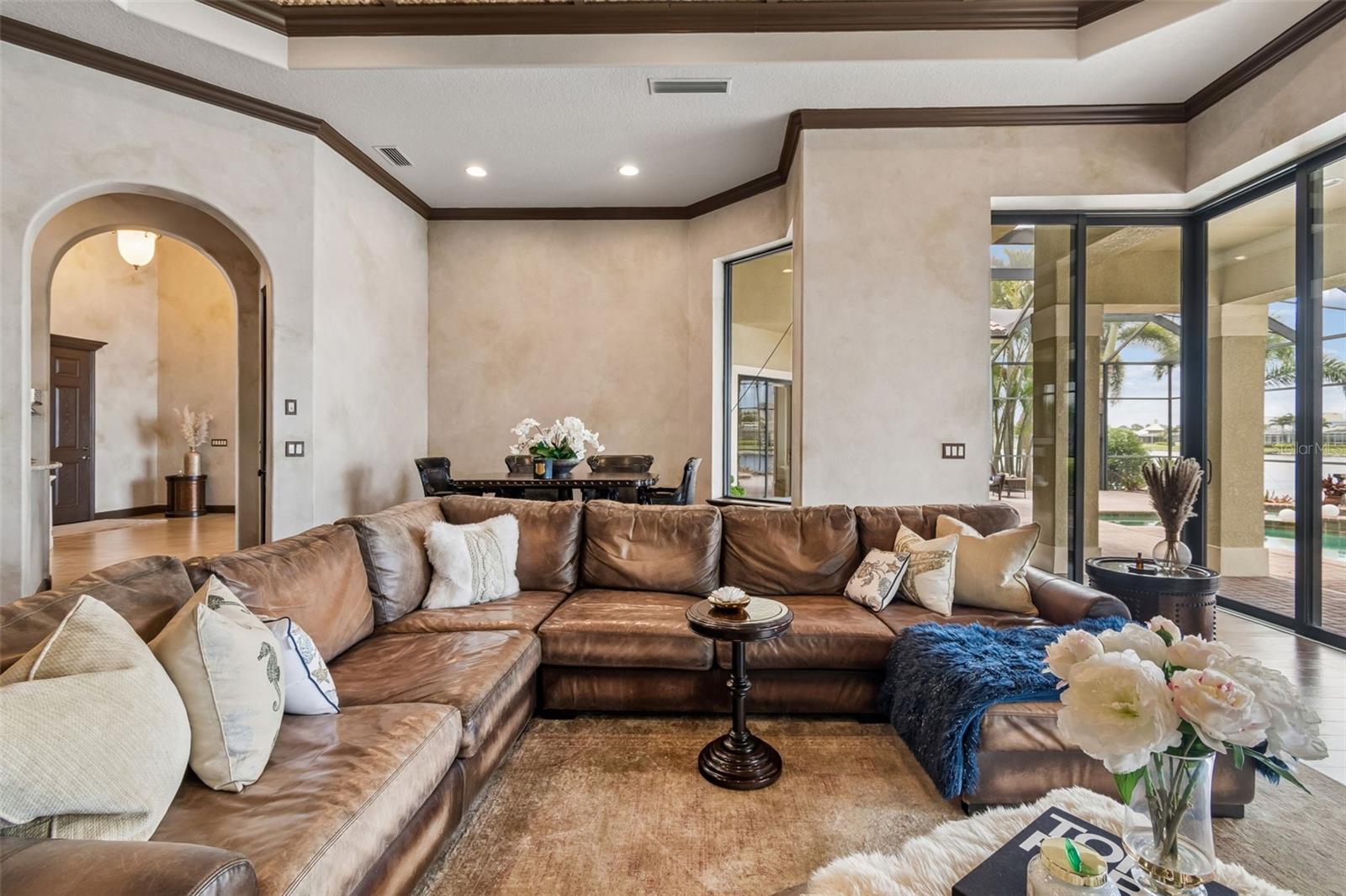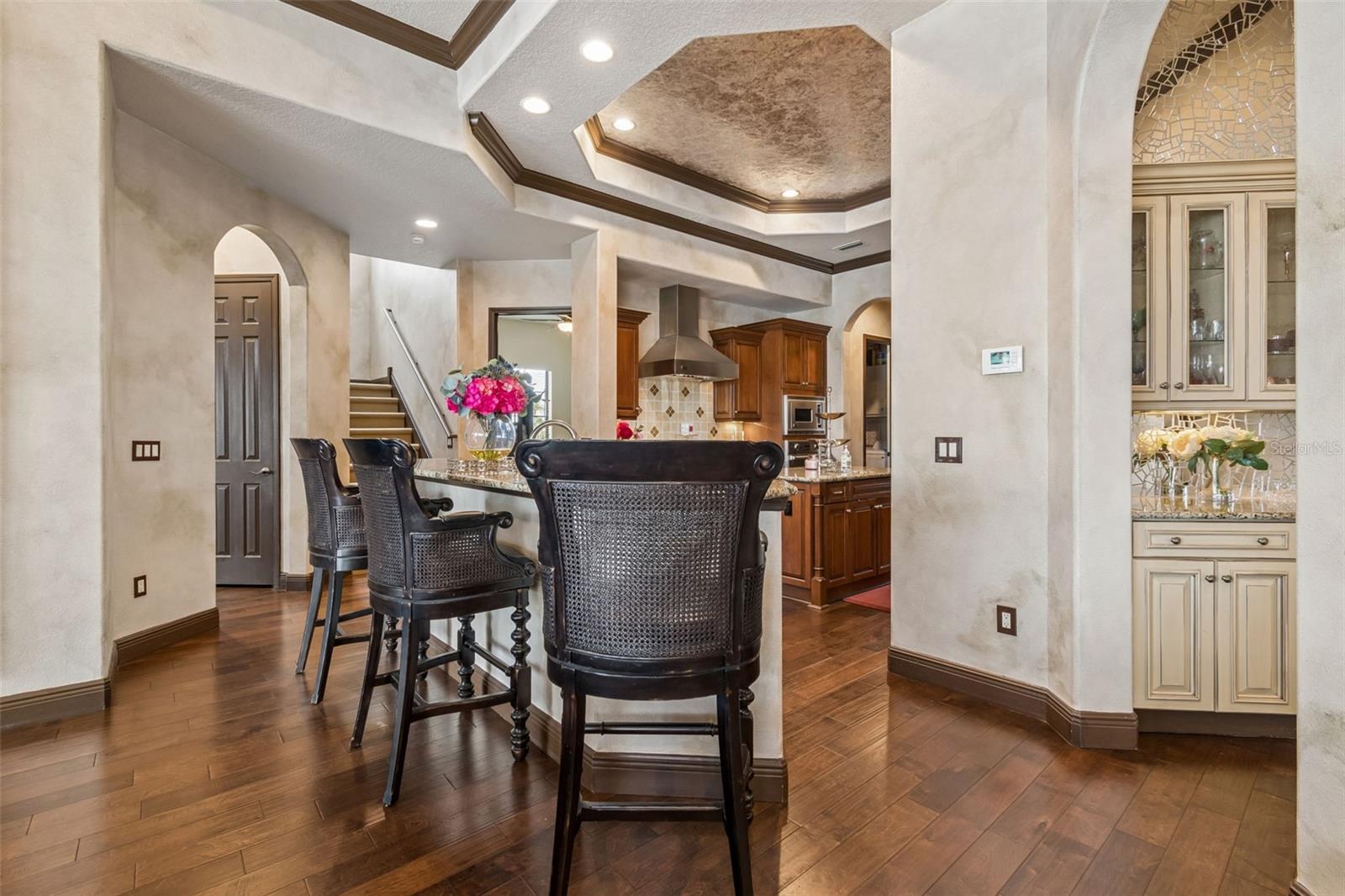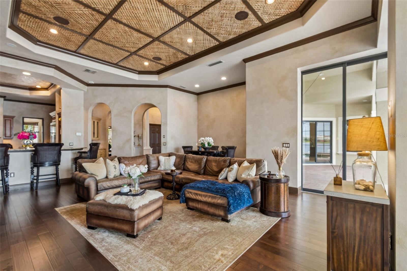 Welcome to a residence where thoughtful design, modern comfort, and timeless character come together in perfect harmony. From the moment you step inside, a soaring foyer draws your eye straight through the living room to the sparkling pool and the tranquil lagoon beyond, a breathtaking first impression that sets the tone for the entire home. Sunset views from the screened-in pool area are nothing short of spectacular. Inside, tall ceilings, custom finishes, and curated textures create a warm, inviting atmosphere that never feels cavernous despite the home’s generous scale. The wine closet, framed by a custom-carved wood detail over glass, pairs beautifully with the striking bar area featuring a mirror-mosaic wall treatment. The family room, kitchen, and eat-in space flow seamlessly together, anchored by an incredible barnwood feature wall with hidden storage, a 77" TV, and an LED fireplace. A woven bamboo ceiling and softly glazed walls add depth and sophistication. The chef’s kitchen is a dream workspace, equipped with Viking appliances, a gas cooktop, a pantry closet, a butler’s pantry, a prep sink, granite countertops, and abundant storage. A mica-accented ceiling inset adds a subtle glow. Nearby, the large laundry room offers a sink and additional storage. Three bedrooms are located on the main level, including the serene primary suite. Overlooking the pool and lagoon, it features a raised sitting area, a massive custom closet, and beautiful lighting. The spa-inspired primary bath includes a walk-in shower facing an outdoor water feature, dual vanities, a makeup area, and a private water closet. The second bedroom includes an ensuite bath and walk-in closet, while the third bedroom offers a large walk-in closet and peaceful water views. The screened-in pool area features brick decking, a gas fireplace, and a fully equipped outdoor kitchen with a brand-new built-in gas grill, tile countertops, and ample storage. The 15,000-square-foot lot includes 100 feet along the lagoon — one of Mirabay’s premier waterfront addresses. A low-maintenance riprap shoreline and a wood dock with power and water make it easy to enjoy kayaking, canoeing, or simply watching the sunset. Upstairs, you’ll find a private fourth bedroom with a walk-in closet, a full bath, and a spacious multipurpose room ideal for a home theater, fitness studio, or game room. Hand-painted ceiling details, textured walls, and a balcony overlooking the water add charm and character. Recent updates include three new AC units (2024 and 2026). The exterior is equally impressive, with lush tropical landscaping, split garages (one-car and two-car), and a wide paver driveway perfect for guests. A custom vertical fountain near the entry sets a soothing tone before you even step inside. There are custom decorative finishes throughout the home. Control4 home automation (multi-room audio, home theater, HVAC, partial interior lighting, monitored security, video surveillance, garage door control) provides comfort, convenience, and peace of mind. Located within a private gated enclave inside Mirabay, residents enjoy world-class amenities: pickleball, tennis, and basketball courts; a resort-style pool; a community restaurant; gym and sauna; playgrounds; yoga, stretch, and Zumba classes; plus complimentary kayaks, sailboats, and paddleboards. You truly never have to leave. And when you do, you’re just 30 minutes from downtown Tampa or St. Pete, and under an hour to Sarasota.