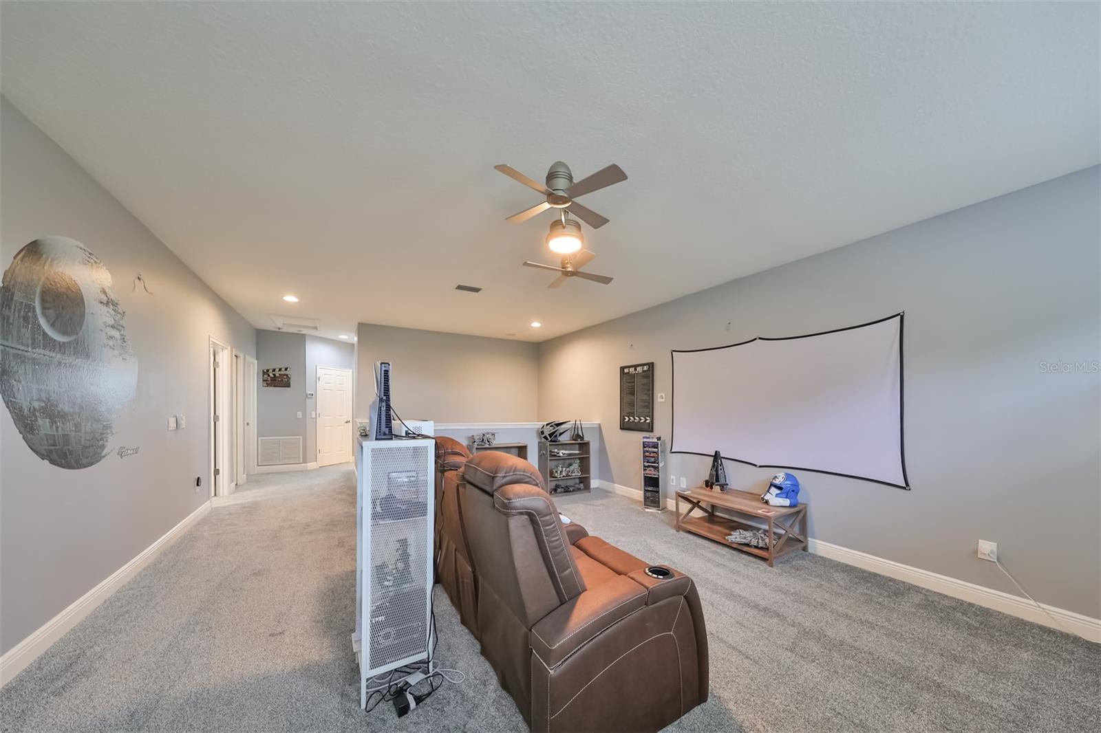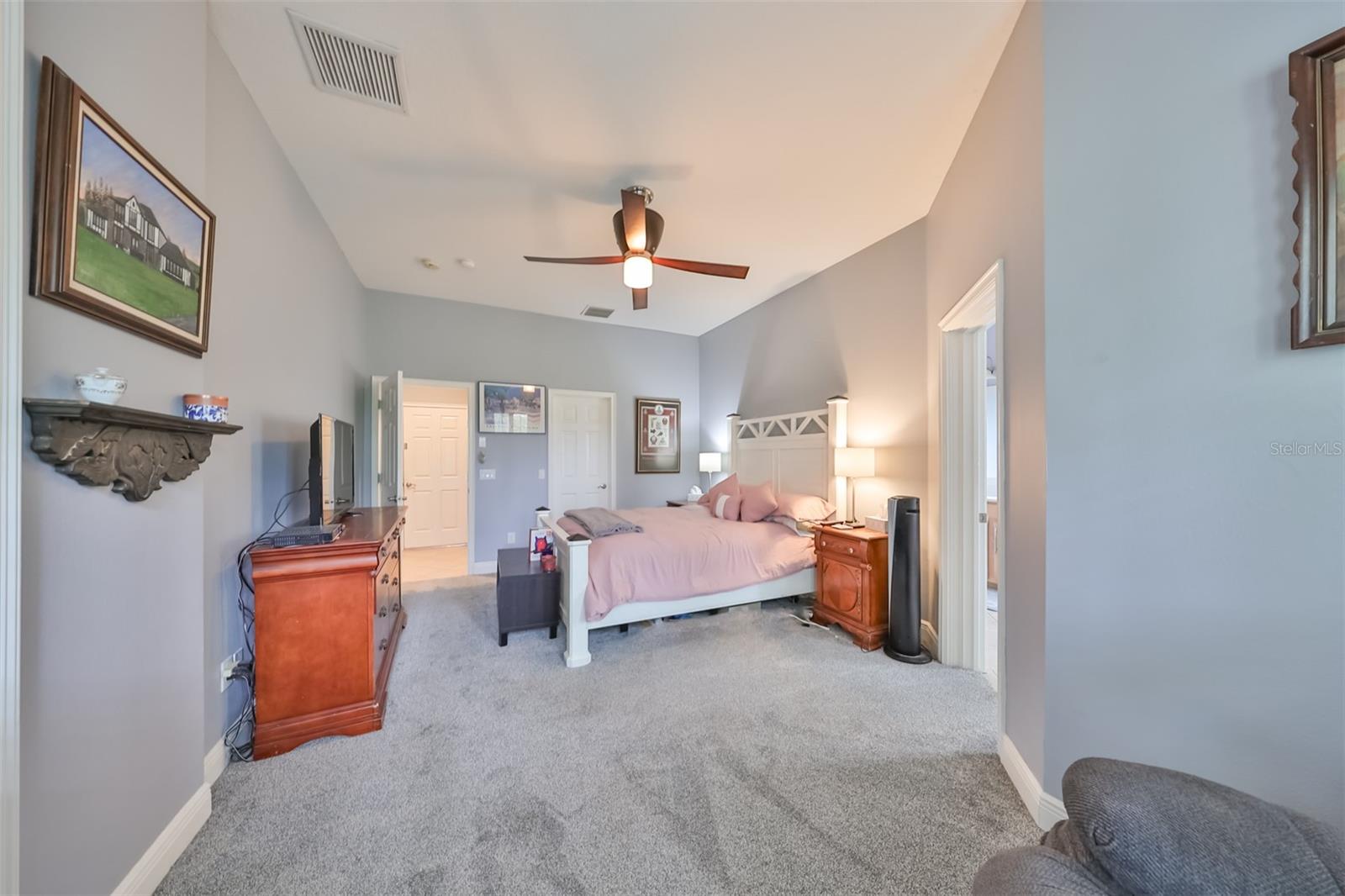 Just in time for summer, this inviting home has a spacious and well-thought-out floorplan to meet many needs: whether working from home, entertaining friends/family, or spending a quiet evening in. A paver walkway leads to the expanded front porch which is a perfect spot to relax and enjoy the tropical landscaping including several mature palm trees. Directly above the porch is a second balcony, a spot to take in the Florida sunsets. Upon entering the home, find a private office/den as well as the dining room, an eat-in kitchen with bench seating in the breakfast area, open to the large living room, and the convenient downstairs master which has its own access to the backyard. The kitchen features granite counters, double ovens, and a gas cooktop. The living room features two pairs of french doors leading to a screened lanai as well as a paver patio for the further enjoyment of the outdoors. Upstairs showcases a huge bonus area and the three additional bedrooms, plus a full bath. The metal roof will provide peace of mind for years to come and the plantation shutters throughout the home combine style and privacy. Located in close proximity to MiraBay's main clubhouse and resort-style pool with lap lanes & waterslide, this home makes it easy to enjoy the many amenities the neighborhood offers: fitness center, tennis, basketball, pickleball courts, holiday events, cafe/bar, kayak/SUP on the lagoon, sporting event watch parties, and many other clubs & activities. Don't wait, schedule a showing today!