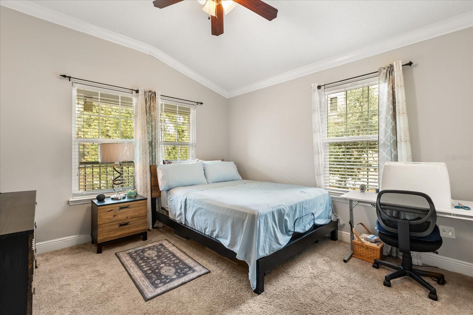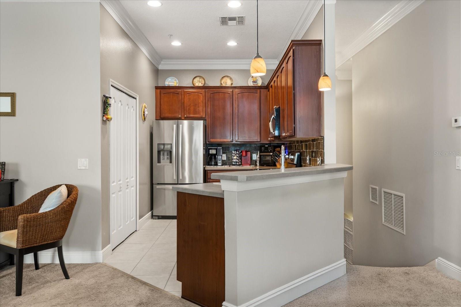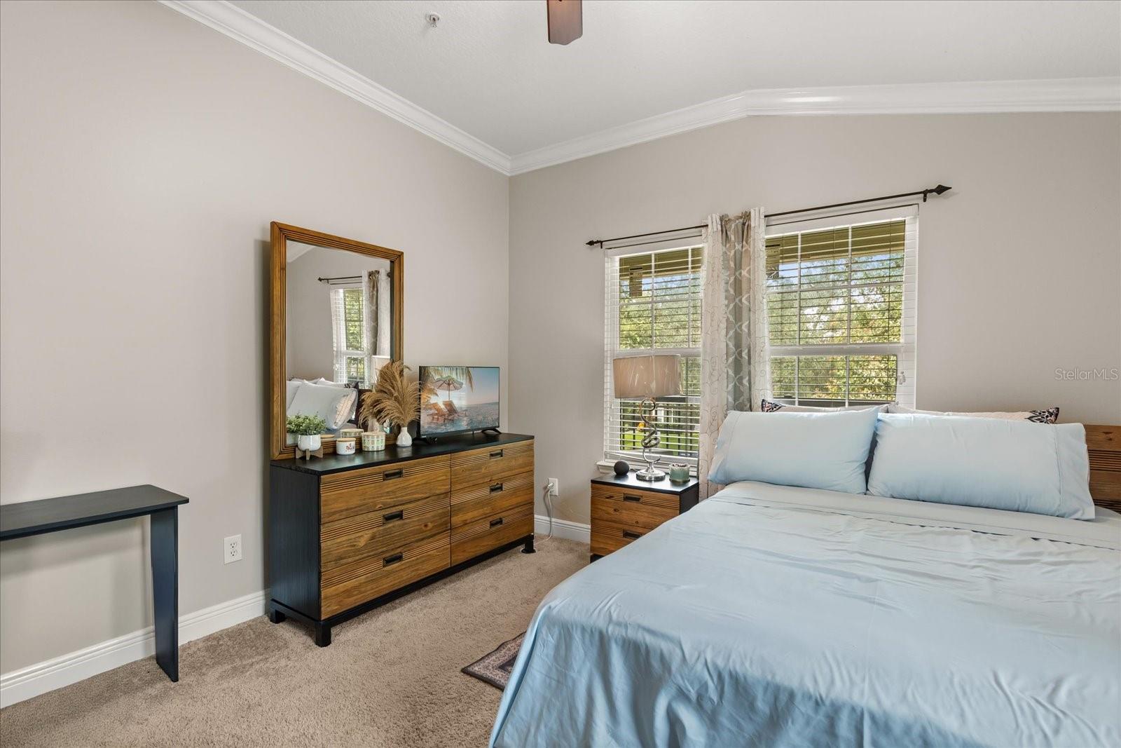 Bright and well-maintained 2-bedroom, 2-bath end-unit condo located in the gated Overlooks at Parkside community. Open-concept floor plan with high ceilings and large windows. Recent updates include fresh interior paint, professionally cleaned carpet, 5-inch crown molding, upgraded baseboards, energy-efficient storm-rated windows installed in 2021, and a new roof in 2025. The AC system was replaced in 2021 and all major systems have been updated for peace of mind. Kitchen offers solid wood cabinets, pantry closet, and premium stainless steel appliances. Primary suite features a walk-in closet, dual sinks, and a tub/shower combo. Additional features include an indoor laundry room with washer and dryer hookups, ceiling fans, window treatments, private balcony, and private attached 1-car garage with opener. HOA covers exterior maintenance, roof, paint, cable, internet, and exterior pest control. Community amenities include pool and recreation facilities. Conveniently located near shopping, dining, and major highways SR 441, SR 429, and SR 436.