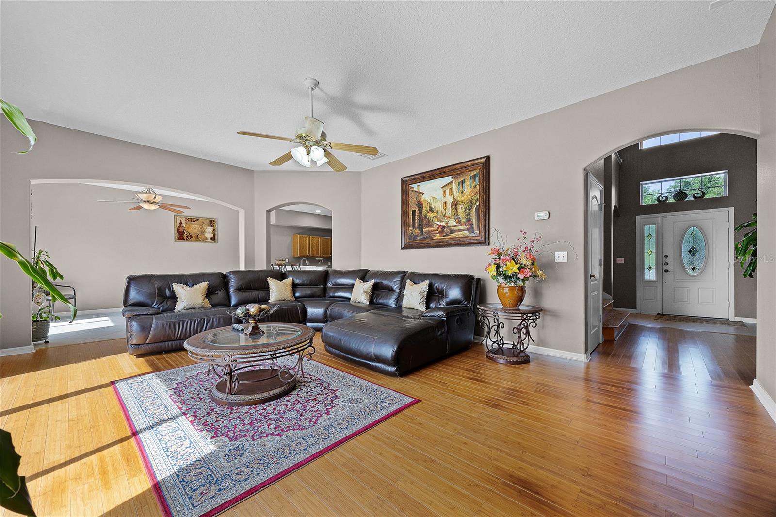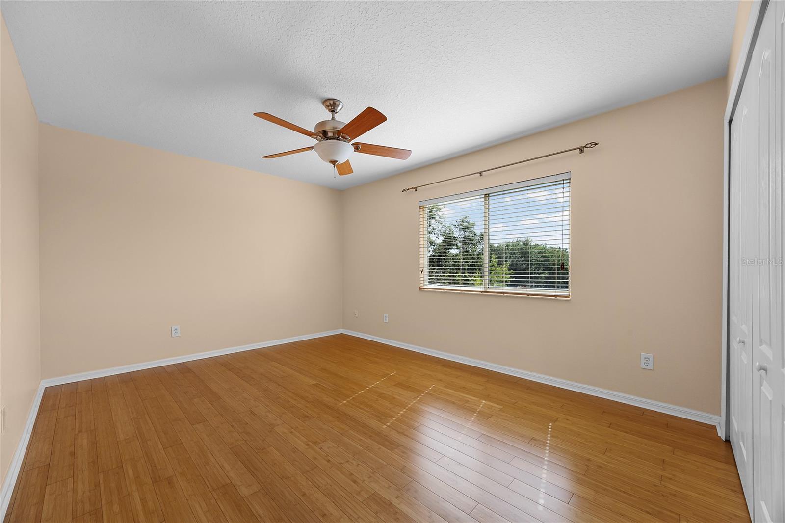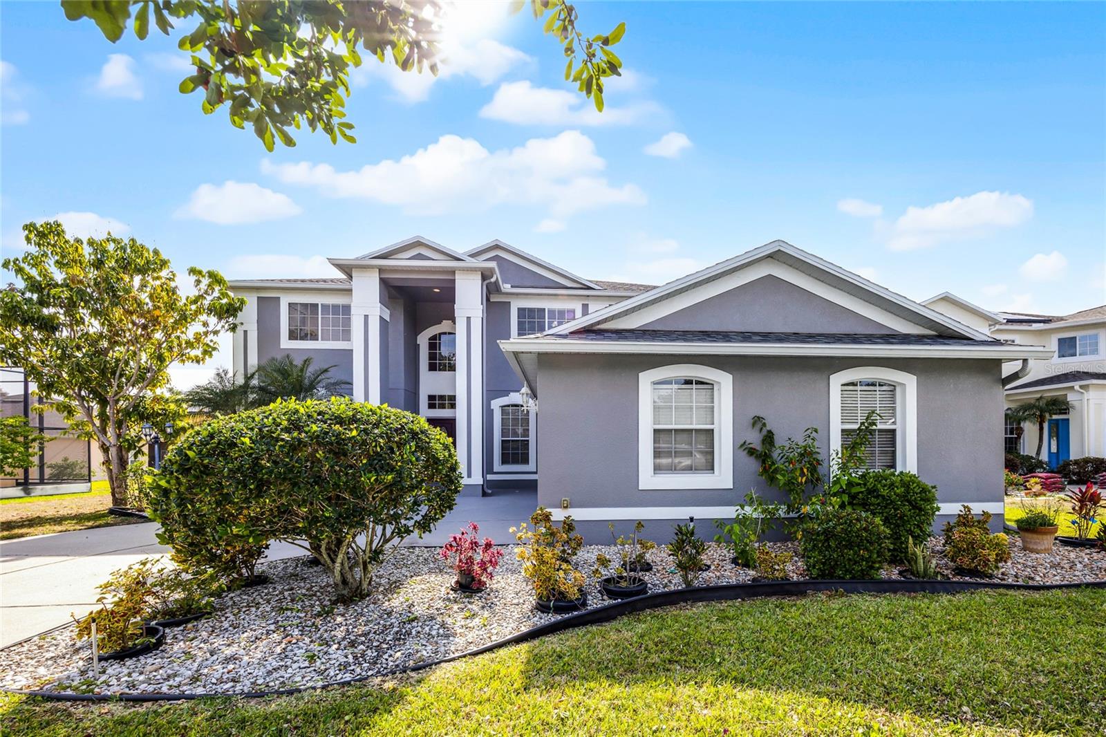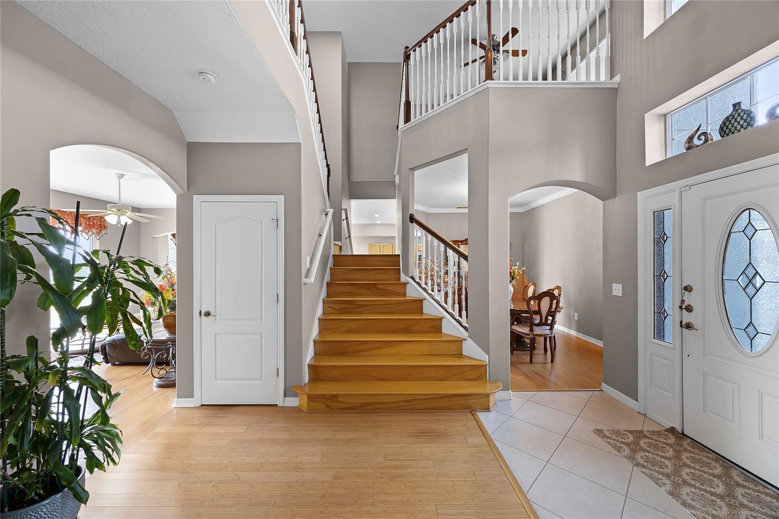Welcome to your dream retreat—this stunning five-bedroom, three-bathroom home sits on a premium lot with serene views and no rear neighbors, offering the ultimate in seclusion and relaxation. Venture into the grand foyer and be greeted by soaring ceilings, rich bamboo floors and an airy, elegant layout designed for both comfort and entertaining. The formal living and dining areas flow into a spacious, open-concept kitchen and family room, great for gatherings big or small. A first-floor guest suite with exterior access makes an ideal setup. Upstairs, a double staircase leads to a versatile loft, three additional bedrooms and a luxurious primary suite with dual walk-in closets and a spa-inspired bath. At the rear of the home, your oversized yard opens to tranquil views—your own secluded escape. With a newer roof (2024) and meticulous upkeep, this home is move-in ready and built to impress. Minutes from major highways and Orlando's top attractions, this rare gem blends location, luxury and lifestyle. Don’t miss your chance—homes like this don’t come around often!