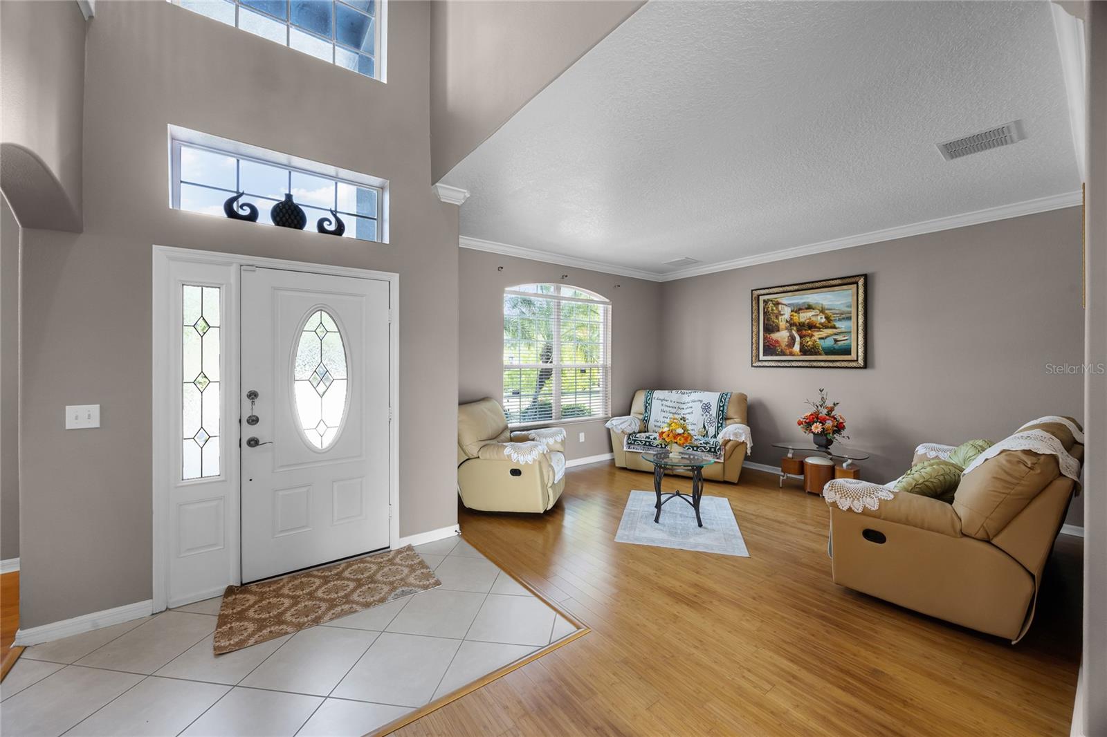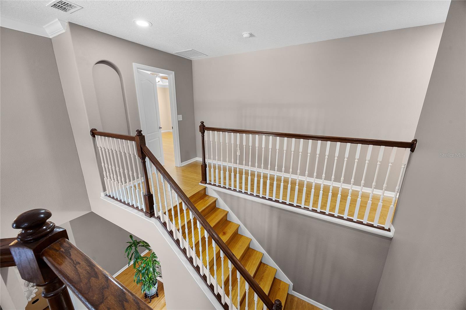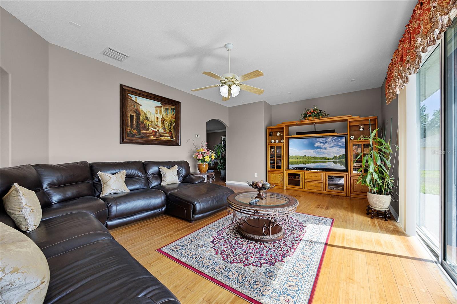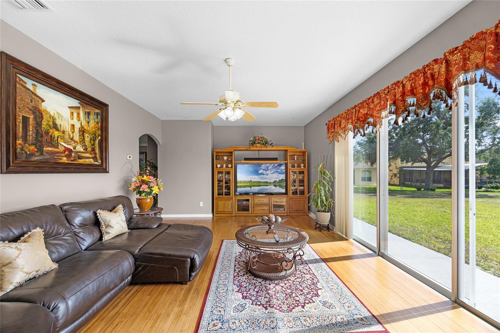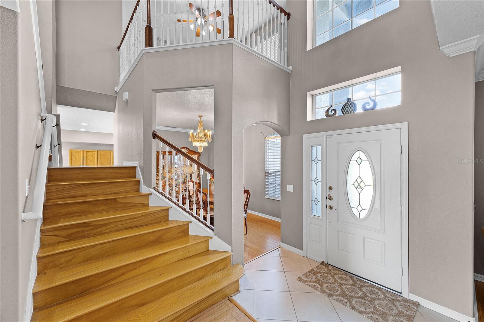 Welcome to your dream retreat—this stunning five-bedroom, three-bathroom home sits on a premium lot with serene views and no rear neighbors, offering the ultimate in seclusion and relaxation. Venture into the grand foyer and be greeted by soaring ceilings, rich bamboo floors and an airy, elegant layout designed for both comfort and entertaining. The formal living and dining areas flow into a spacious, open-concept kitchen and family room, great for gatherings big or small. A first-floor guest suite with exterior access makes an ideal setup. Upstairs, a double staircase leads to a versatile loft, three additional bedrooms and a luxurious primary suite with dual walk-in closets and a spa-inspired bath. At the rear of the home, your oversized yard opens to tranquil views—your own secluded escape. With a newer roof (2024) and meticulous upkeep, this home is move-in ready and built to impress. Minutes from major highways and Orlando's top attractions, this rare gem blends location, luxury and lifestyle. Don’t miss your chance—homes like this don’t come around often!