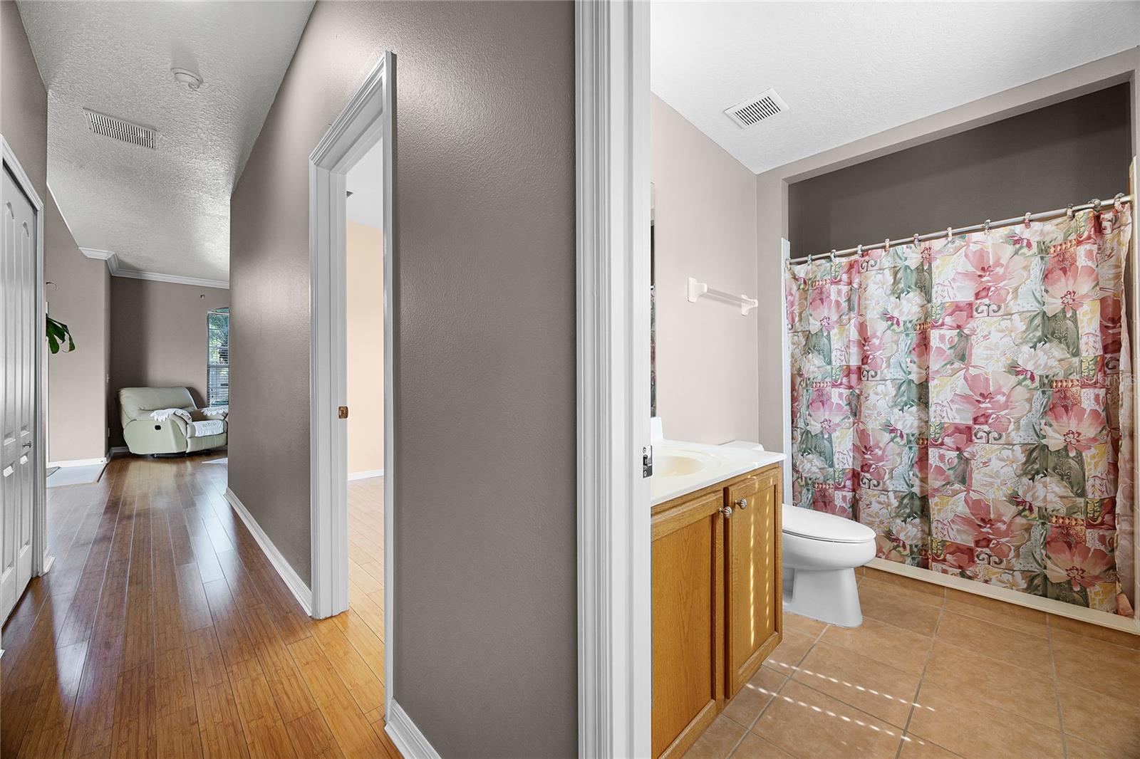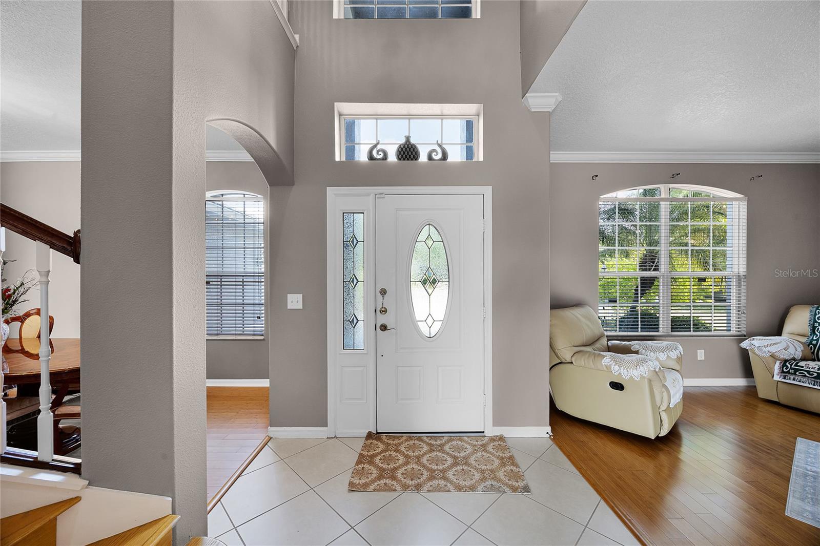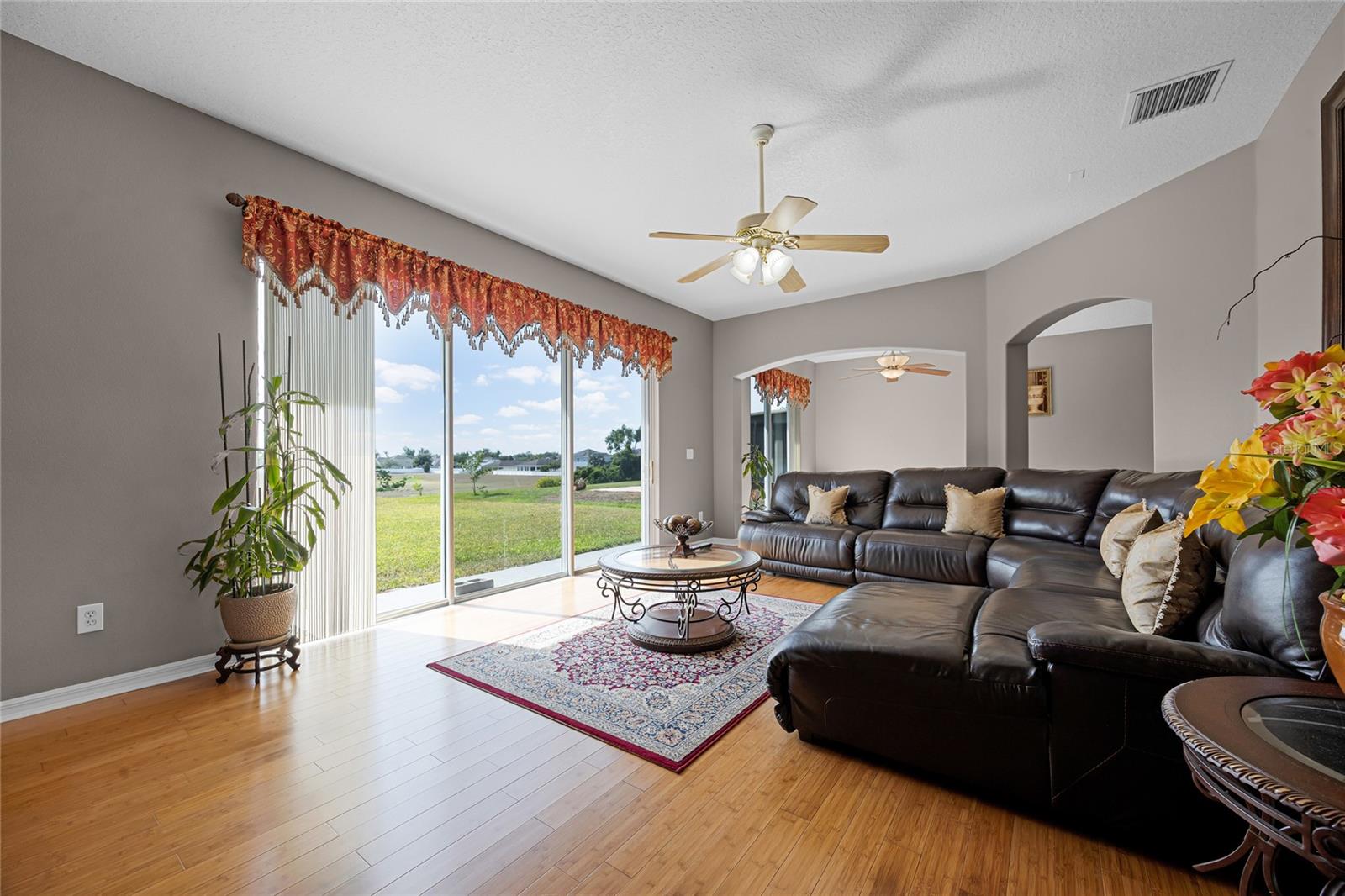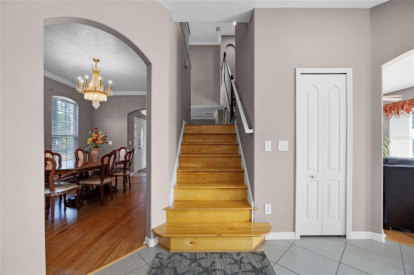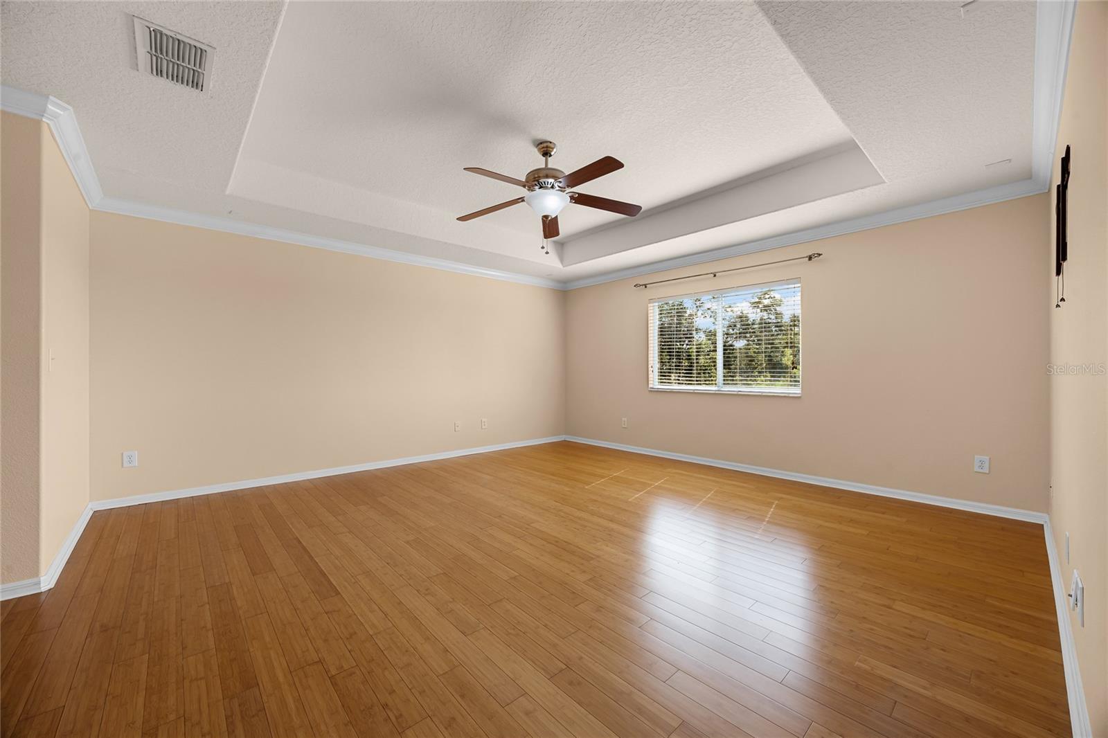 Welcome to your dream retreat—this stunning five-bedroom, three-bathroom home sits on a premium lot with serene views and no rear neighbors, offering the ultimate in seclusion and relaxation. Venture into the grand foyer and be greeted by soaring ceilings, rich bamboo floors and an airy, elegant layout designed for both comfort and entertaining. The formal living and dining areas flow into a spacious, open-concept kitchen and family room, great for gatherings big or small. A first-floor guest suite with exterior access makes an ideal setup. Upstairs, a double staircase leads to a versatile loft, three additional bedrooms and a luxurious primary suite with dual walk-in closets and a spa-inspired bath. At the rear of the home, your oversized yard opens to tranquil views—your own secluded escape. With a newer roof (2024) and meticulous upkeep, this home is move-in ready and built to impress. Minutes from major highways and Orlando's top attractions, this rare gem blends location, luxury and lifestyle. Don’t miss your chance—homes like this don’t come around often!