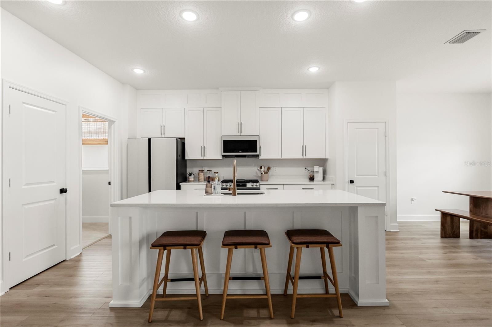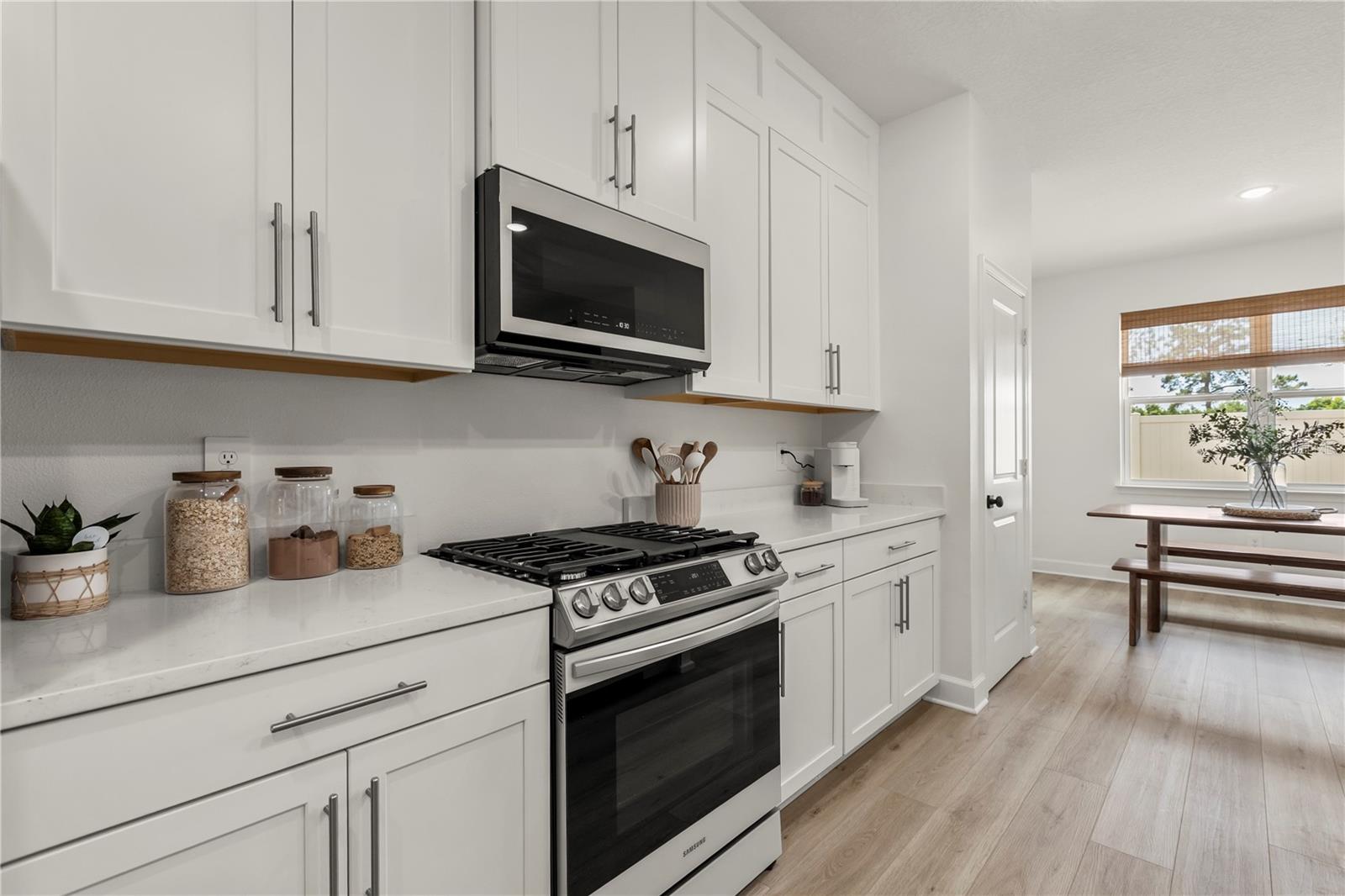Why wait for new construction? This move-in ready 3-bedroom, 2-bath home with a versatile FLEX space is loaded with high-end upgrades—better than builder grade! Enjoy luxury vinyl flooring throughout, with like-new carpet in the two secondary bedrooms. With neutral tones throughout and a flexible layout, the bonus space is perfect for a home office, playroom, or can easily be enclosed to create a 4th bedroom. The gourmet kitchen features custom island siding, two pantry closets, custom cabinet extenders reaching to the ceiling, and upgraded Samsung appliances—including a gas stove. The laundry room includes a convenient added shelf, and the newly installed vinyl fence offers privacy in the backyard. Freshly finished garage flooring adds even more value to complete this home. Relax on the welcoming covered front porch, perfect for your morning coffee or evening unwinding. Out back, enjoy Florida living year-round on the covered and screened-in lanai. Neighborhood amenities include scenic walking trails, a pool with a cabana, and a dedicated dog park. Situated just minutes from the upcoming Wyld Oaks development—a 215-acre mixed-use destination featuring retail, dining, entertainment, and green spaces—this home offers both comfort and convenience. Plus a newer Publix just down the road. This home is the total package—style, upgrades, and no waiting!