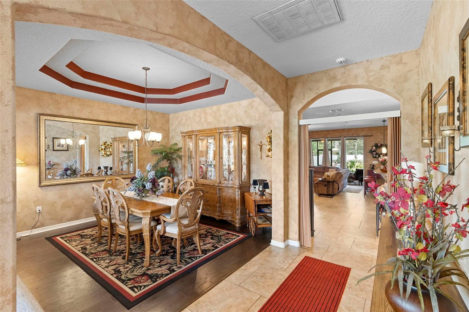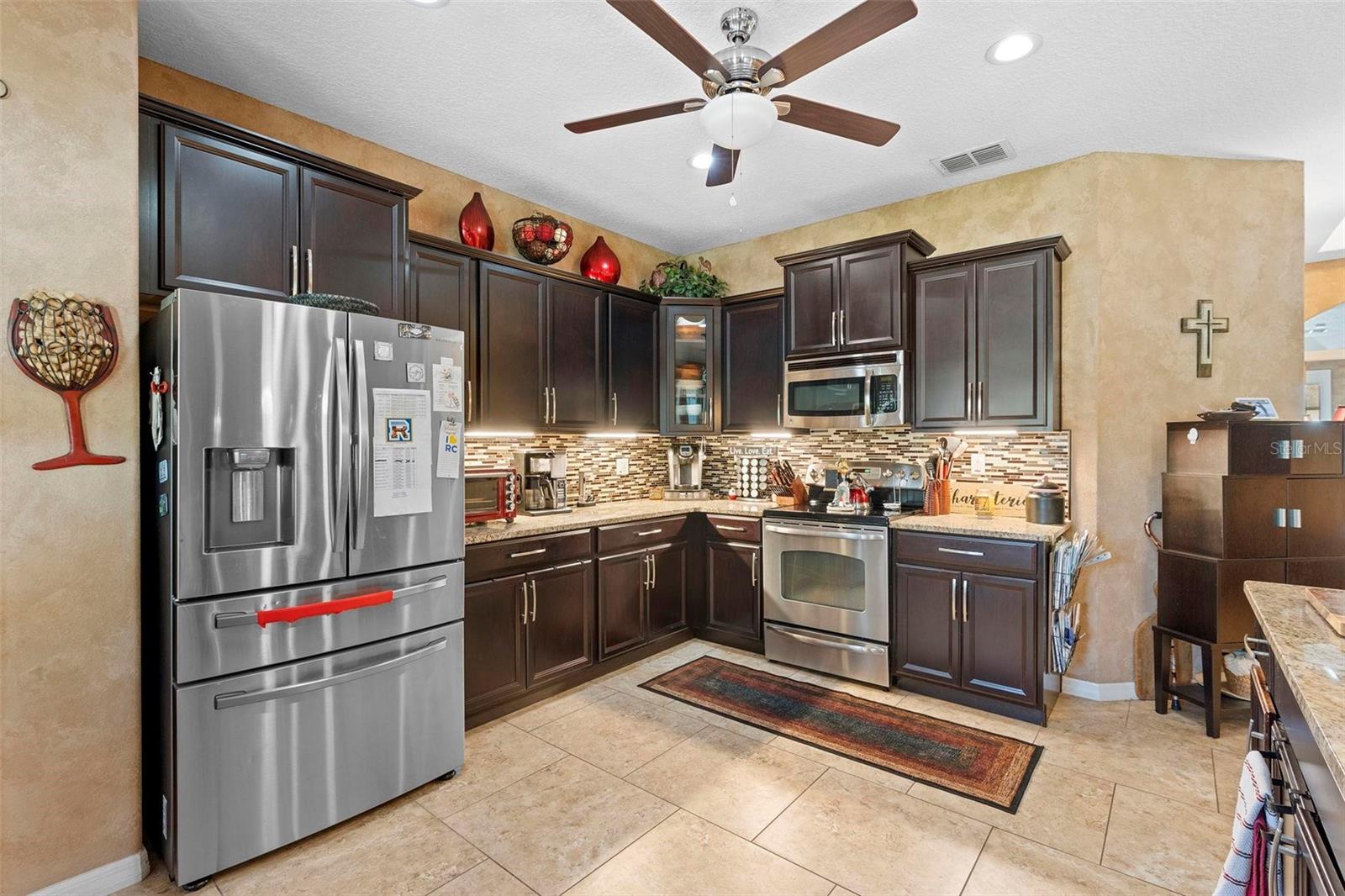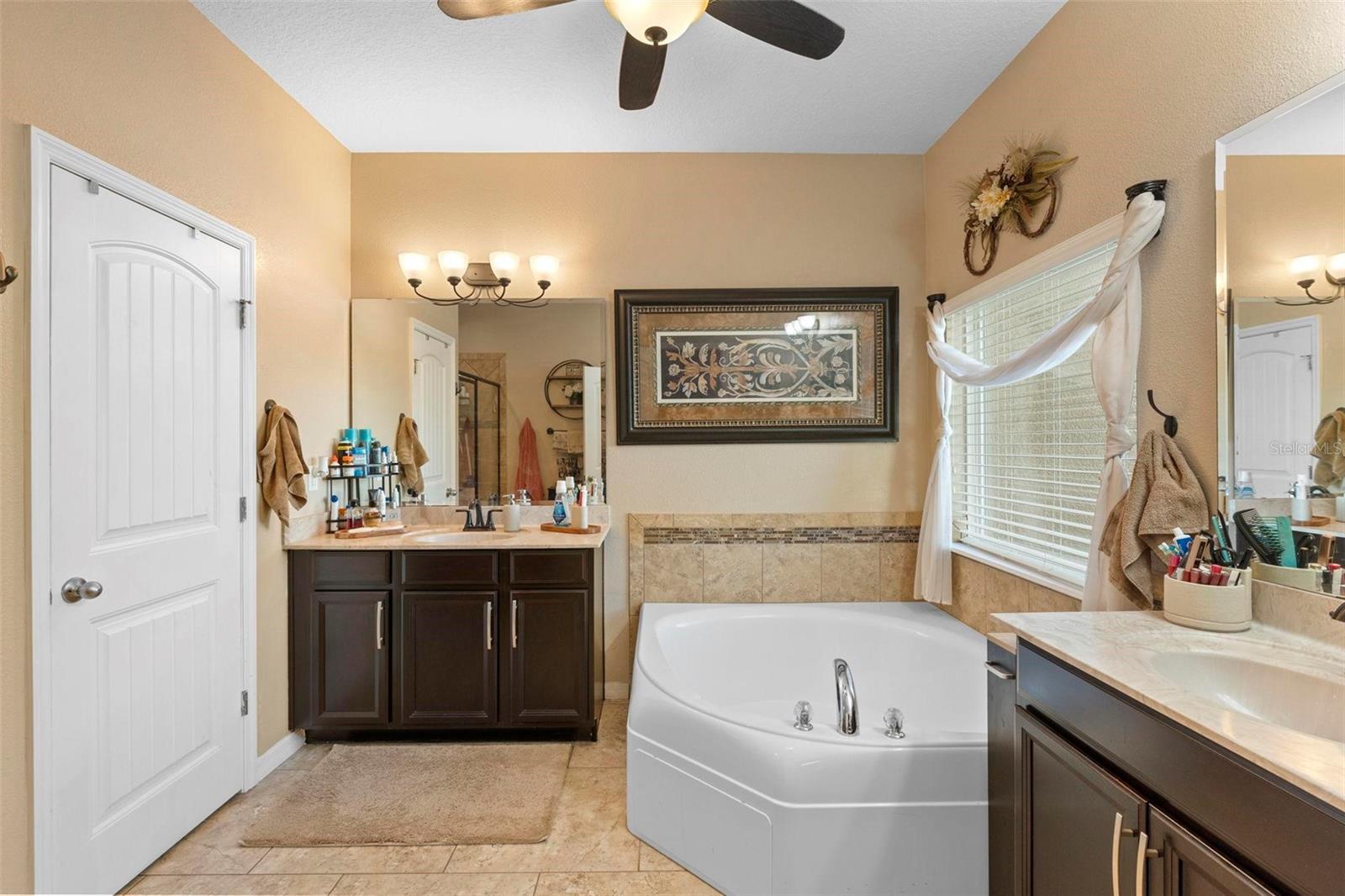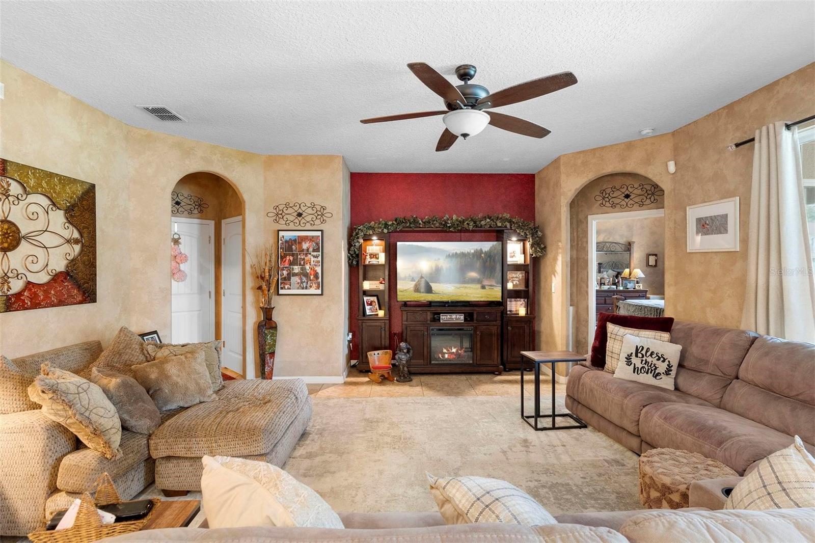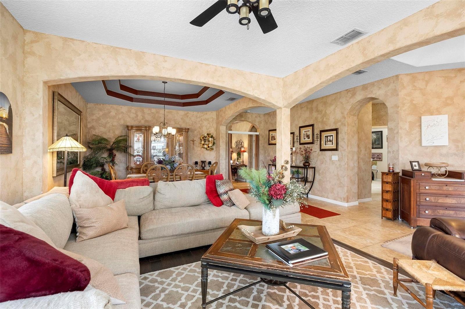 Prepare yourself to fall in love with this stunning, large corner lot, spacious home in a highly sought after community of Chandler Estates. This spacious 4-bedroom, 3-bathroom home captures you when you walk into the beautiful, welcoming faux painted home, as you enter the foyer which opens to a combined living room and dining room with a mixture of beautiful tiled and manufactured wood looking laminate flooring, which offers a great space for entertaining. Each bedroom and garage entrance have a beautiful alcove entering each area. This functional layout flows seamlessly into the family room and recently upgraded kitchen. The kitchen offers solid wood cabinetry, beautiful granite countertops, with a newly installed (in 2024) backsplash, a large center island, tile floors with a breakfast nook, all great for entertaining with a new dishwasher installed in 2023! Just off the kitchen area, is a spacious laundry room with newly installed cabinets (2024) and a nice folding table with bottom storage. The family room, which is also off the kitchen is ready for you to wind down at the end of day, offering plenty of space for all your family and friends. While one of the extra bedrooms, has a full bathroom off the bedroom, the other 2 bedrooms share one of the other full bathrooms. The master bathroom screams relaxation, as soon as you enter, with a large soaking tub and a large walk in shower with safety bars installed in it, along with two sink/vanities. The master bedroom offers two walk-in closets with plenty of space for all of your clothes and shoes, along with a tray ceiling giving the room a nice touch, the carpet in the master bedroom was new in 2024. Step out to a large, screened lanai/porch, (recently screened in 2024), where you can sip on morning coffee or unwind after work with our beautiful Florida evenings. The large back yard with a newly laid paver area (2024), offers a nice outdoor space, which will be great on a nice cooler evening with a fire pit gathering. roasting marsh mellows or grilling out. There is plenty of room to have a pool installed as well. Additional highlights, the home has a large 3 car garage for vehicles and storage, alarm system, exterior painting done in 2024. The home is close to shopping, restaurants and the 429 and just minutes away from beautiful Mount Dora. Put this beautiful home on your list to see and make it yours!!