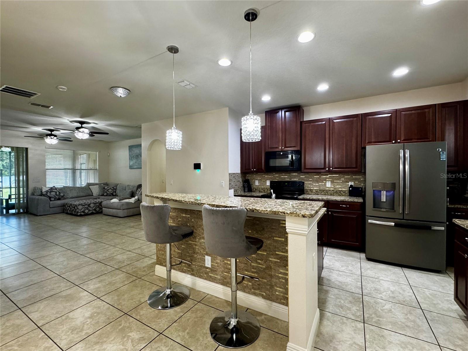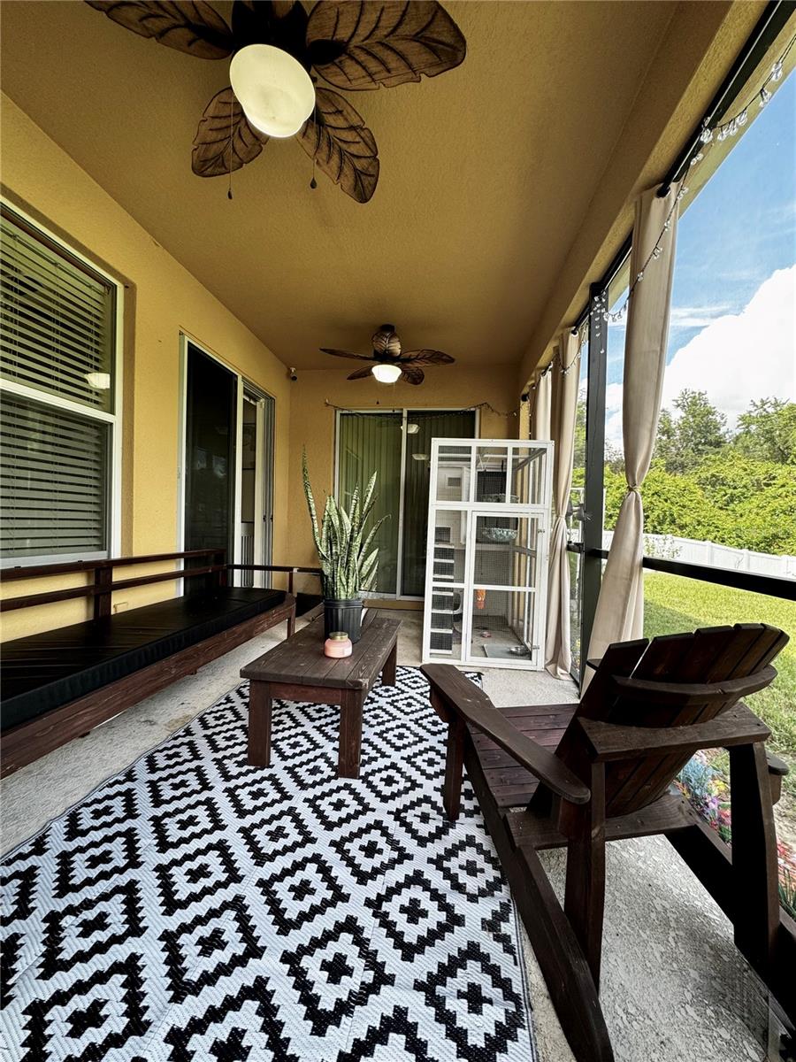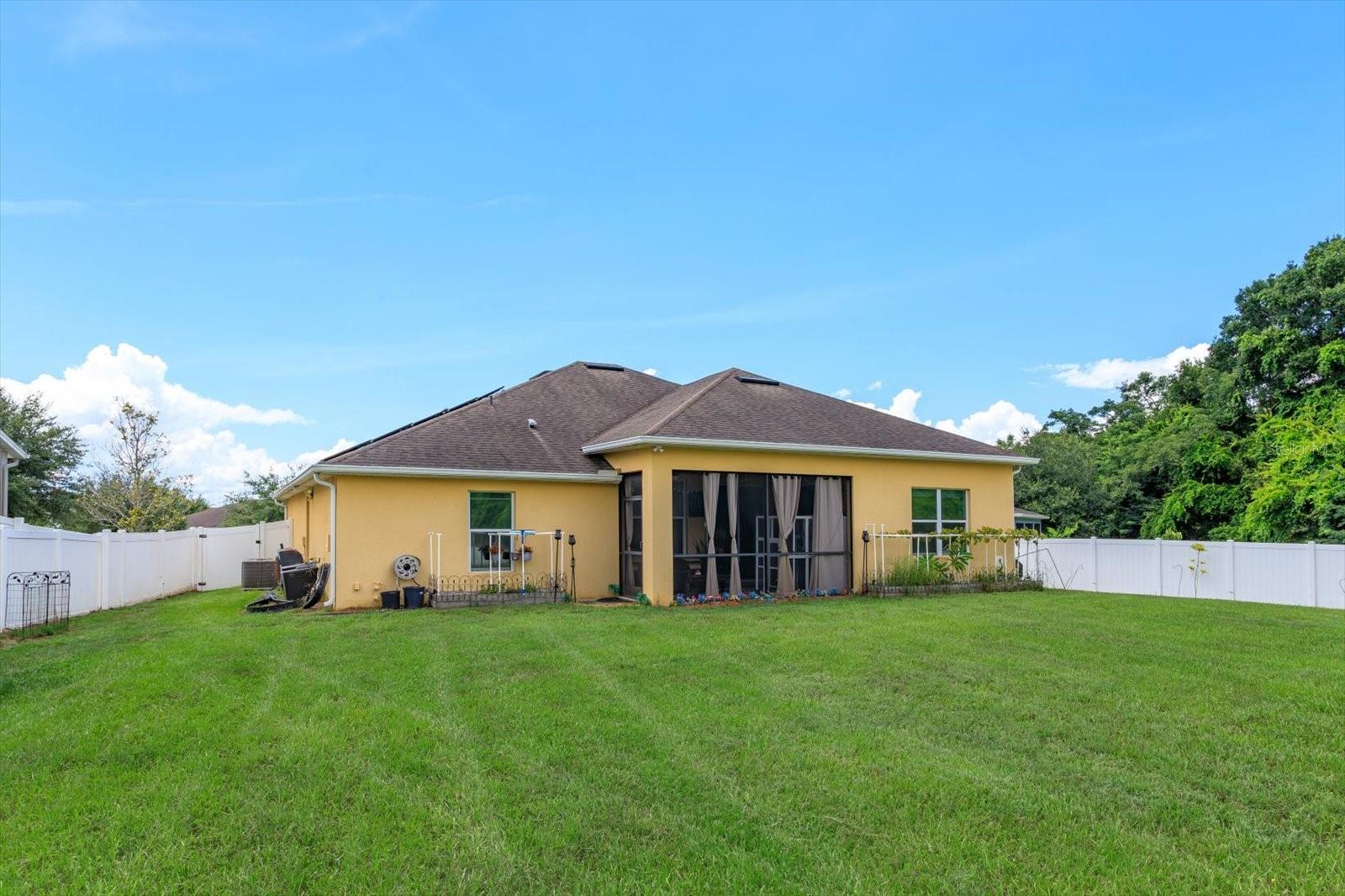 This beautiful home is located on almost one half acre of privacy! Plenty of room to build a pool or any backyard oasis one can imagine! The entire lot is enclosed with six foot vinyl fencing. The large lot offers a variety of fruit trees and backs up to Camp Wewa so no rear neighbors! The 16x10 shed / workshop is set back towards the back of the yard and offers Air conditioning, electric and water. Sellers have installed a whole home water filtration system stays with the home. The solar panels currently on the home are owned and to be paid off at closing. Electric bill with the solar varies between $60-$160 a month offering a HUGE savings for the next homeowner. The interior layout offers a kitchen / family room open concept with formal living and dining rooms separate. The Primary and secondary bedrooms are split for privacy, the inside utility room is close to the kitchen for ease of use. Both bathrooms have been updated with self cleaning bidet toilet seats and new shower fixtures. The oversized primary bedroom is 15 x 13, offers two ceiling fans, access to patio, walk in closet, double sinks and a tub with separate shower. The entire Air Conditioning system was upgraded and replaced in 2023. The windows have all been tinted and all of the lighting fixtures & ceiling fans have been upgraded. The large screened patio features a relaxing view of the private tree lined yard, access to the family room, primary bedroom and pool bath. Schedule your private viewing today!