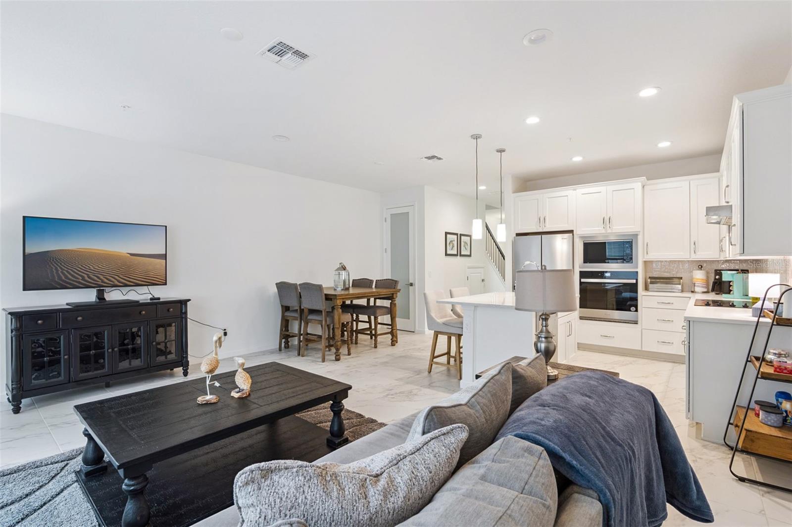 Toll Brothers, fully upgraded, MODERN townhome - 4 bedrooms, 3 baths, 9 foot ceilings, a 2-car garage with a private courtyard that's perfect for both relaxation and entertaining. The open-concept floorplan has an expansive great room that flows into the beautifully appointed gourmet kitchen. The chefs kitchen features soft-close cabinets, quartz counters, and a decorative subway tile backsplash. Stainless-steel Whirlpool appliances, an upgraded faucet, disposal, built in oven and microwave, electric cook-top and pendant lighting over kitchen island, enhance both the functionality and style of the kitchen. Whirlpool washer and dryer also included. Walk-in pantry off kitchen. Step outside through the gathering room to your private courtyard, an inviting outdoor space perfect for enjoying the fresh air in a tranquil setting. Also located on the first floor is a convenient bedroom and full bathroom, complete with an enclosed shower with a glass door, ensuring comfort and privacy for guests. Upstairs, the owner's suite has ample natural light, a spacious walk-in closet, and a spa-inspired en suite bathroom. The owner’s bathroom is a serene escape, featuring quartz-topped dual vanity sinks, and frameless shower. The second floor also includes two additional bedrooms, a full bathroom, and a laundry room, offering thoughtful separation for privacy and convenience. Porcelain tile flooring spans the first-floor living areas, providing both style and durability, gray porcelain tile in the laundry room and bathrooms adds a sleek, modern touch. Plush, stain-resistant Berber carpet completes the bedrooms, loft, and staircase for added comfort. This high end community features a beautiful Club House with yoga room, fitness center and community room. Also a Resort-Style pool with beach walk-in, pool shelf, fountains, private cabanas and lounge furniture. Stunning pickleball and tennis courts as well.