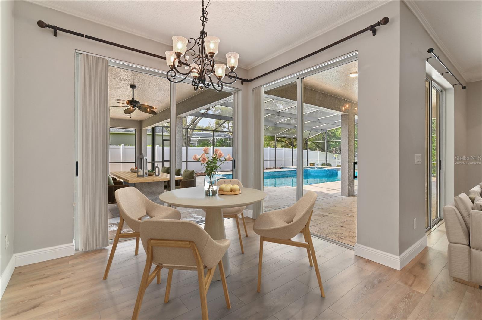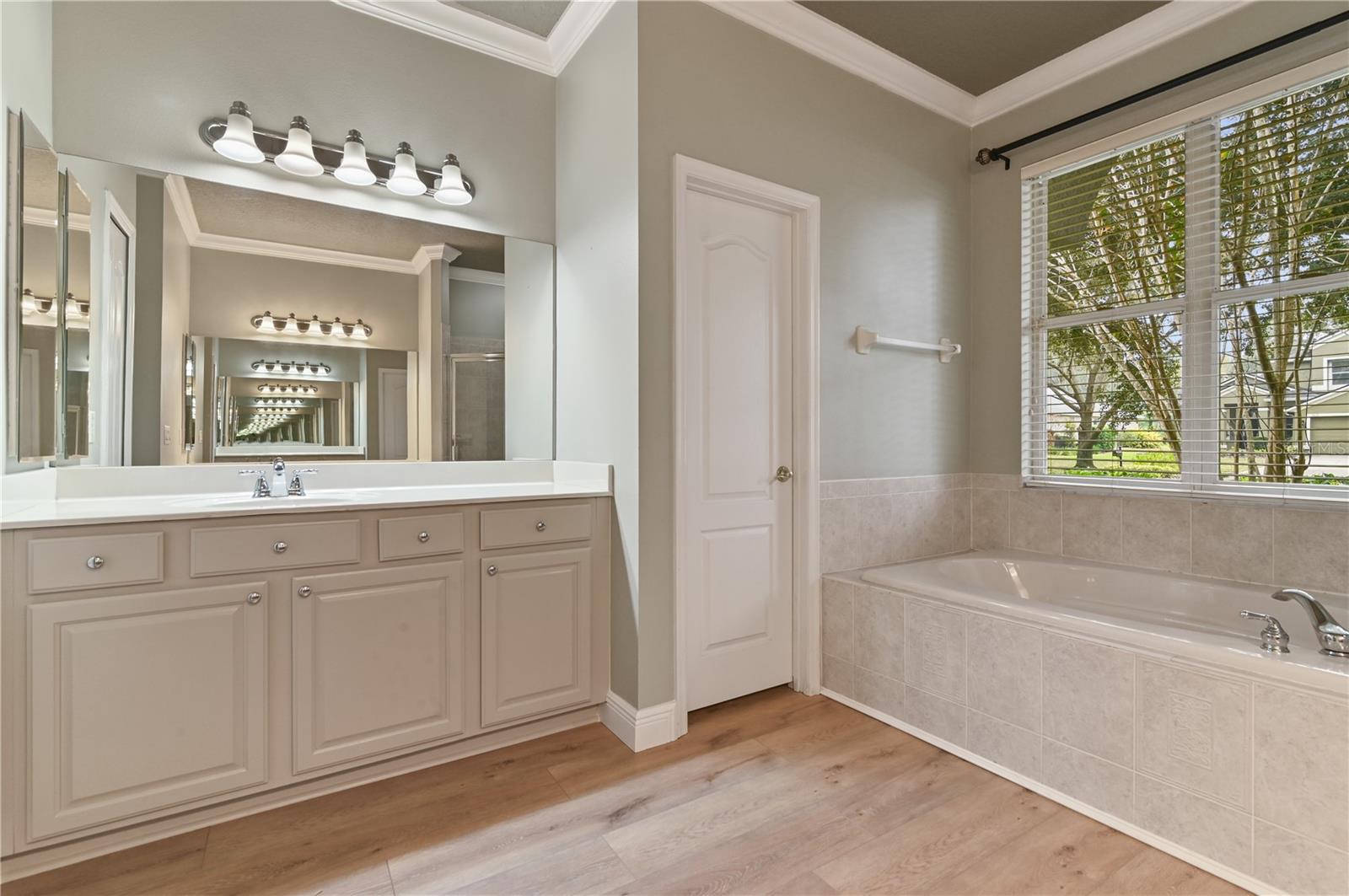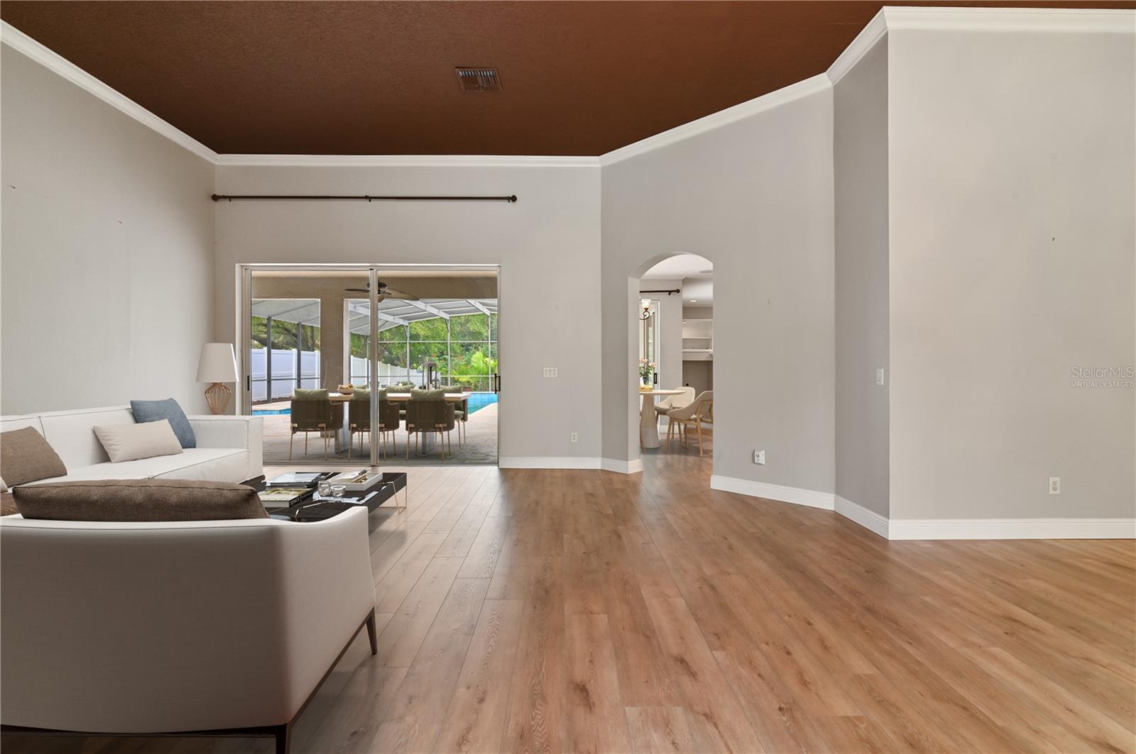 One or more photo(s) has been virtually staged. ROCK SPRINGS RIDGE! GREAT SCHOOLS! "A RATED!!" KELLY K-8! This thoughtfully designed 5-bedroom, 3-bath, 3-car, side-entry garage, pool/spa home features a versatile triple-split floor plan that ensures both privacy and functionality. Roof 2018! NEW 2025 SCRATCH AND WATERPROOF FLOORING THROUGHOUT, NO TRANSITIONS, adding safety, style and durability! As you enter through the elegant glass double doors, you are welcomed into an oversized formal living and dining area with soaring ceilings adorned with crown molding and glass doors that lead straight to the pool! High ceilings, architectural details, columns, crown molding, surround sound, upgraded light fixtures, and abundant natural light through extensive windows are unique to this semi-custom home. To the left is the primary suite, a true retreat, complete with tray ceilings, crown molding, dual vanities, a soaking tub, a private water closet, and two walk-in closets for storage. French Doors lead you to the perfect outdoor living space. Adjacent to the suite, the fifth bedroom—ideal as an office, or nursery—features double doors and its own closet. At the heart of the home is the gourmet kitchen, which features abundant wood cabinetry, newer 2022 appliances, granite countertops, a decorative tile backsplash, and a center island ideal for entertaining. Off the kitchen is a laundry room with built-in cabinetry and a utility sink, as well as the garage entry. The adjacent dining area, bathed in natural light through the glass door, is perfect for family meals or hosting friends. The adjoining family room offers warmth and character with its natural wood-burning fireplace, framed by a decorative wood-and-tile surround and built-in shelving. Oversized glass sliders show off that gorgeous sparkling blue pool! The back bedroom doubles as a private en-suite when paired with the pool bath. Another wing leads to 2 bedrooms that share a Jack-and-Jill bath! The 2nd floor has a flex space perfect for office, theater or another family room! Step outside to your own private oasis! The spectacular pool area, REMOLDED IN 2020, NEW EQUIPMENT, TILE, RESURFACED, AND AUTOMATED, with multiple water features, creates a tranquil backdrop for relaxation, while the expansive wrap-around covered patio provides ample space for outdoor dining and entertaining! The 1/2 acre+ fenced yard adds security and peace of mind for pets and family. Apopka delivers an amazing location that combines the convenience of quick access to Orlando without the heavy traffic, all while maintaining a charming small-town atmosphere. Focusing on family, friends, and quality of life, Apopka truly offers the perfect environment for families to come together and thrive. The community is also home to the expansive Field of Dreams Recreation 180-acre sports park and Amphitheater, hosting a variety of free concerts and fun-filled events just a short distance away for your enjoyment. Additionally, the stunning Kelly Park Natural Springs is nearby, offering another excellent recreational opportunity.