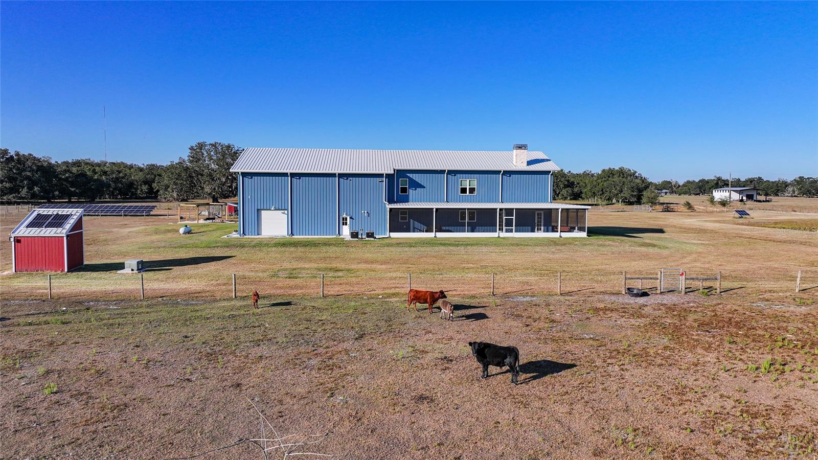 There are homes, there are estates, and then there is this, a commanding 2024-built luxury barndominium that sets a new standard for strength, design, and self-sufficiency. Positioned on 10 fully usable, Ag-zoned acres, this one-of-a-kind property delivers an extraordinary blend of refined luxury and true farm functionality, engineered to perform, built to endure, and finished without compromise. From the moment you arrive, the presence is undeniable. Constructed with a red iron steel structure by ACI Building Systems and CAT-4 rated up to 145 mph, this home is wrapped in impact windows, doors, and garage doors, with the entire shell spray-foam insulated for exceptional efficiency and comfort. Strength and peace of mind are woven into every detail. The two-story interior feels less like a residence and more like a private luxury retreat. Soaring spaces, refined finishes, and intentional design flow throughout nearly 10,000 square feet, while a fully functional fireplace anchors the main living area with warmth and elegance. The kitchen is a true showpiece, designed for both elevated entertaining and everyday indulgence. High-end appliances, generous prep space, and custom finishes define the room, while a huge private butler’s pantry provides extensive storage and behind-the-scenes functionality to keep hosting seamless and uncluttered. The primary suite is magazine-worthy in every sense. Designed with balance and indulgence in mind, the bedroom, walk-in closet, and primary bathroom are all equal in size, creating a level of luxury rarely seen. The custom walk-in closet features built-in storage solutions throughout, while the spa-like primary bathroom stuns with an enormous walk-in shower featuring a soaking tub inside the shower itself, transforming daily routines into a true retreat. In total, the home offers four bedrooms, three and a half bathrooms, and multiple flex spaces. A mezzanine provides access to full-height attic storage and discreetly conceals a hidden panic and safety room, adding security without sacrificing design. Outside, the lifestyle expands even further. The wraparound screened porch is a destination of its own, finished with new epoxy floors, a porch swing, and an outdoor shower, perfect for relaxed mornings and quiet evenings. Solar-powered exterior flood lighting is intentionally placed away from the home to minimize bugs, while high-intensity lighting surrounds the property for security and visibility. The garage and utility spaces are truly next level, offering space for multiple vehicles plus a full 48-foot RV, complete with a floor drain and dedicated 50-amp RV service. Two additional 50-amp circuits support electric vehicle charging, while 400-amp electric service and two separate 200-amp FPL feeds ensure uncompromising power capacity. Sustainability and independence are seamlessly built in. A 21kW field-based solar array, engineered for high-wind conditions, feeds a hybrid inverter supported by 42.9 kWh of battery storage. With no electric vehicles, the system averages a net $0 FPL bill, delivering efficiency without sacrificing performance. The home features fully integrated smart technology, advanced security, and whole-property connectivity. A complete list of technology, solar, interior, and exterior features is available upon request. This property is bold, refined and resilient!