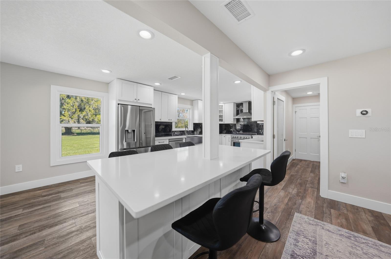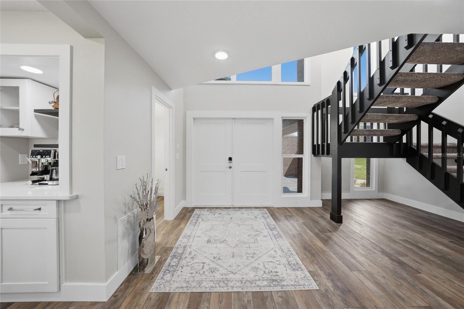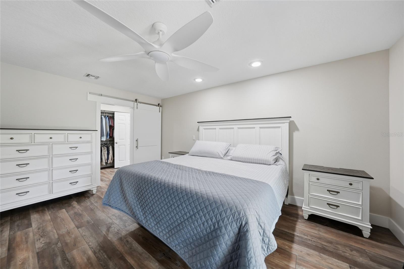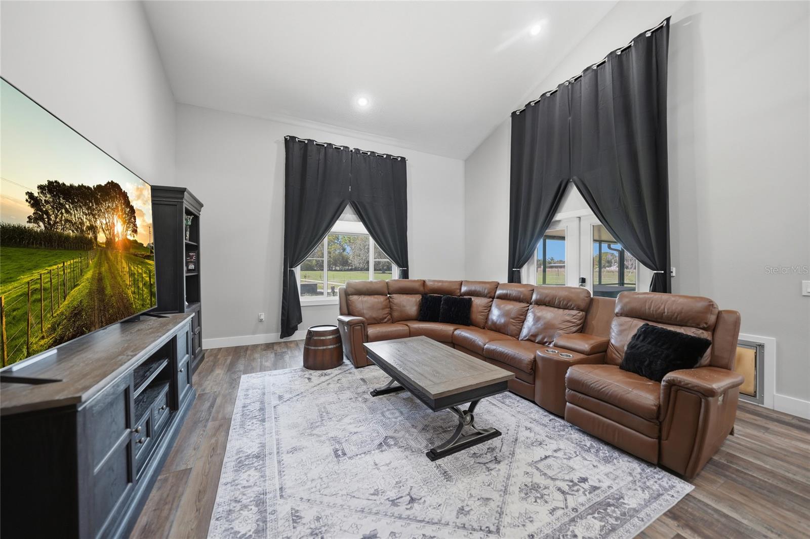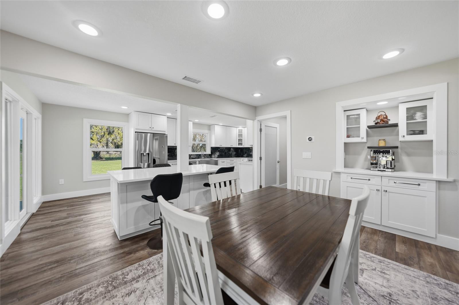 Welcome to your private 5 acre estate, where luxury meets functionality and every detail has been thoughtfully designed to impress. As you arrive, a long concrete driveway leads you to this stunning two-story brick home, showcasing exceptional curb appeal and a welcoming covered front porch. Step through the grand double doors into an impressive foyer featuring soaring ceilings and beautiful luxury vinyl flooring that flows throughout the main living areas. The heart of the home is the meticulously updated kitchen, perfectly suited for both everyday living and entertaining. It boasts quartz countertops, stainless steel appliances, pot filler, farmhouse sink, an oversized gas range with hood vent, and a convenient drawer microwave. The expansive double sided island offers ample seating, while the walk-in pantry is fully equipped with additional cabinetry, a second refrigerator, and freezer. Just off the kitchen, the dining area features a built-in coffee bar, creating a perfect space to start your day. The living room is equally impressive with its soaring ceilings, abundant natural light, and cozy wood burning fireplace. Each downstairs room offers direct access to the surrounding porches, allowing you to fully enjoy the peaceful views of your property. The spacious primary suite is located on the first floor and serves as a private retreat, complete with a large walk-in closet and a luxurious en suite bathroom featuring a standalone soaking tub and walk-in shower. The suite also includes its own private porch, perfect for relaxing in tranquility. Upstairs, you’ll find two generously sized guest bedrooms, each with oversized closets, connected by a walkway that overlooks both the living room and the grand entryway below. Additional interior features include a large laundry room and a versatile bonus space connected to the attached garage, offering endless possibilities for storage, a home office, or hobby area. Step outside and follow the beautifully landscaped concrete pathway past a serene koi pond with a filtration system, leading you to the impressive detached garage and potential in-law suite or man cave. The expansive 6+ car garage features five 11' foot garage doors and an open layout ideal for car enthusiasts, workshops, or a hobby farm setup, garage is accessible using the deeded side road/easement. Within the garage, the in-law suite offers two rooms, is fully air-conditioned, and includes rough-in plumbing for a future kitchenette and bathroom—ready for your customization. Built to stand out, this property also features a durable metal roof, hurricane impact windows, propane tankless water heater, gas dryer, wired for a generator and countless upgrades throughout. This one-of-a-kind estate offers space, luxury, and versatility all in one. Call today to schedule your private tour!