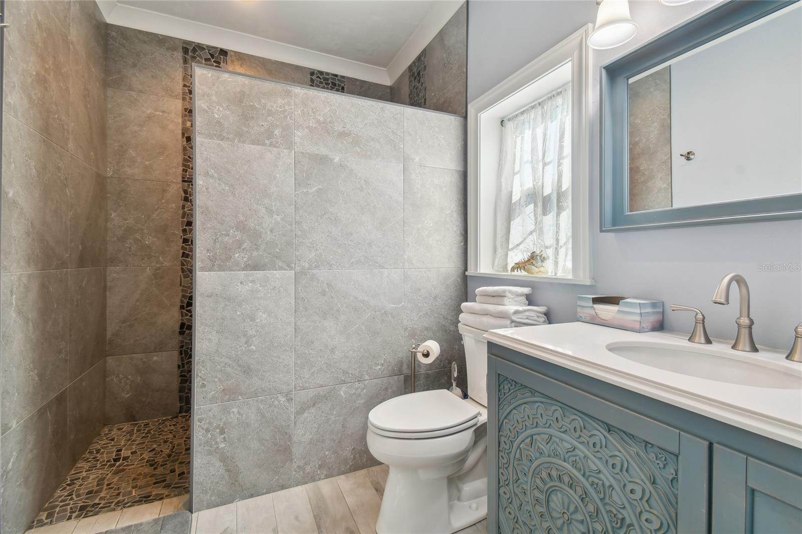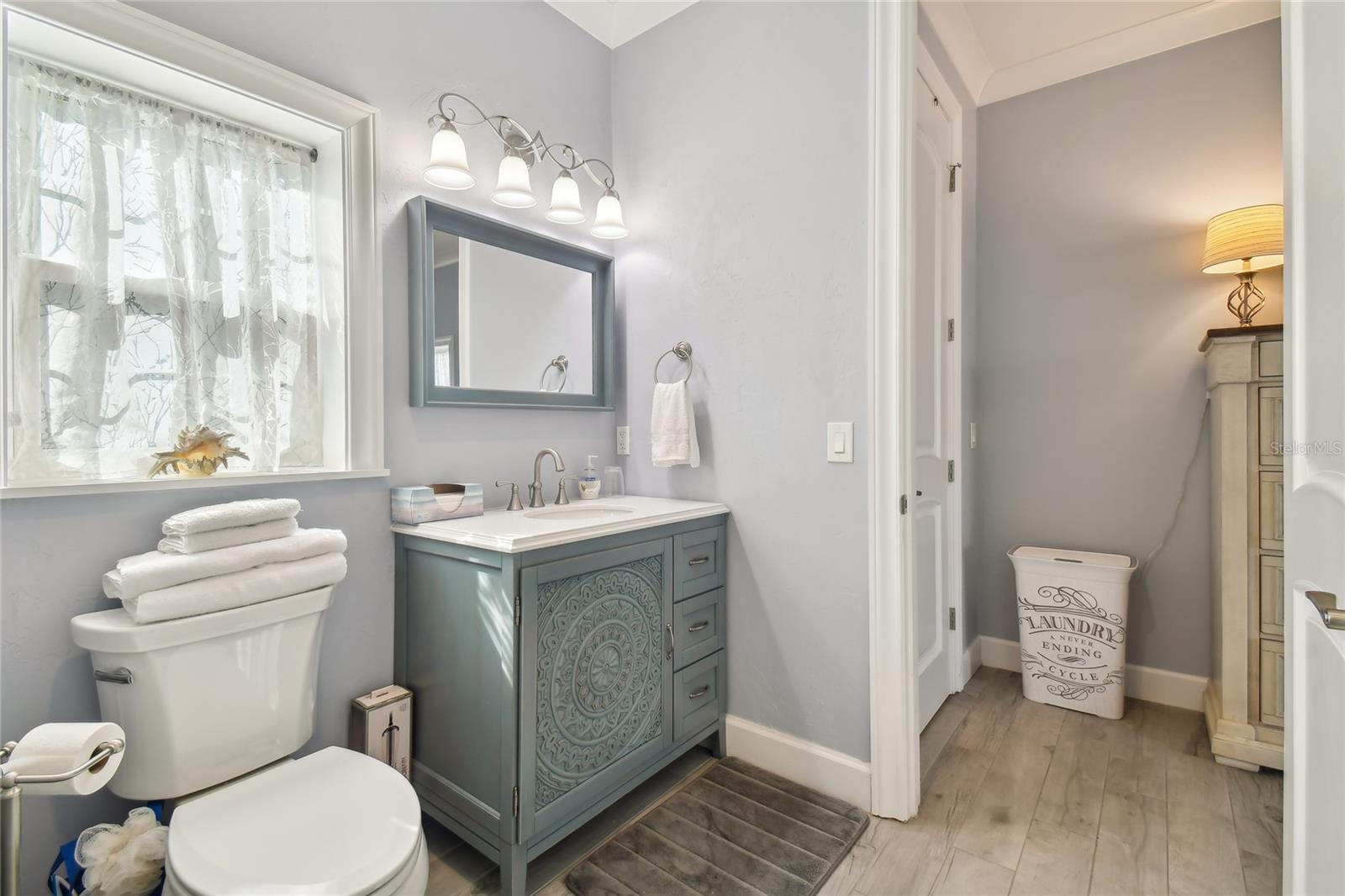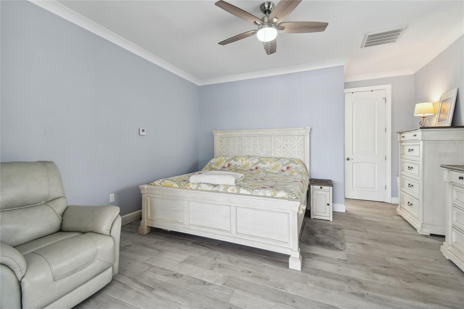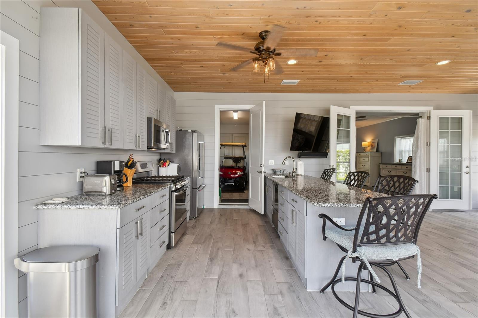 Discover this beautifully designed casita, encompassing 1,000 square feet of meticulously arranged space. Enjoy the tranquility of water views from the large screened-in patio, a perfect setting for relaxation. Inside, the kitchen stands out with a large island complemented by barstool seating, leathered granite countertops, and sleek stainless steel appliances. The living space benefits from central air conditioning across the living room, kitchen, bedroom, and bathroom, ensuring comfort in every corner. Guaranteeing year-round security and comfort, the living area is also fortified with motorized Kevlar hurricane screens and motorized Eisenglass screens. Easily accessible through stylish French doors, the bedroom offers a peaceful retreat alongside the contemporary bathroom featuring a spacious walk-in shower. Storage needs are seamlessly met with a golf cart garage that houses a stackable washer and dryer, plus a laundry sink, ensuring practicality with ample storage space. To top it all off, this casita comes furnished with premium furnishings, including a hot tub, making it ready for you to move in right away! This casita is truly a gem. Reach out today to arrange your personal tour.