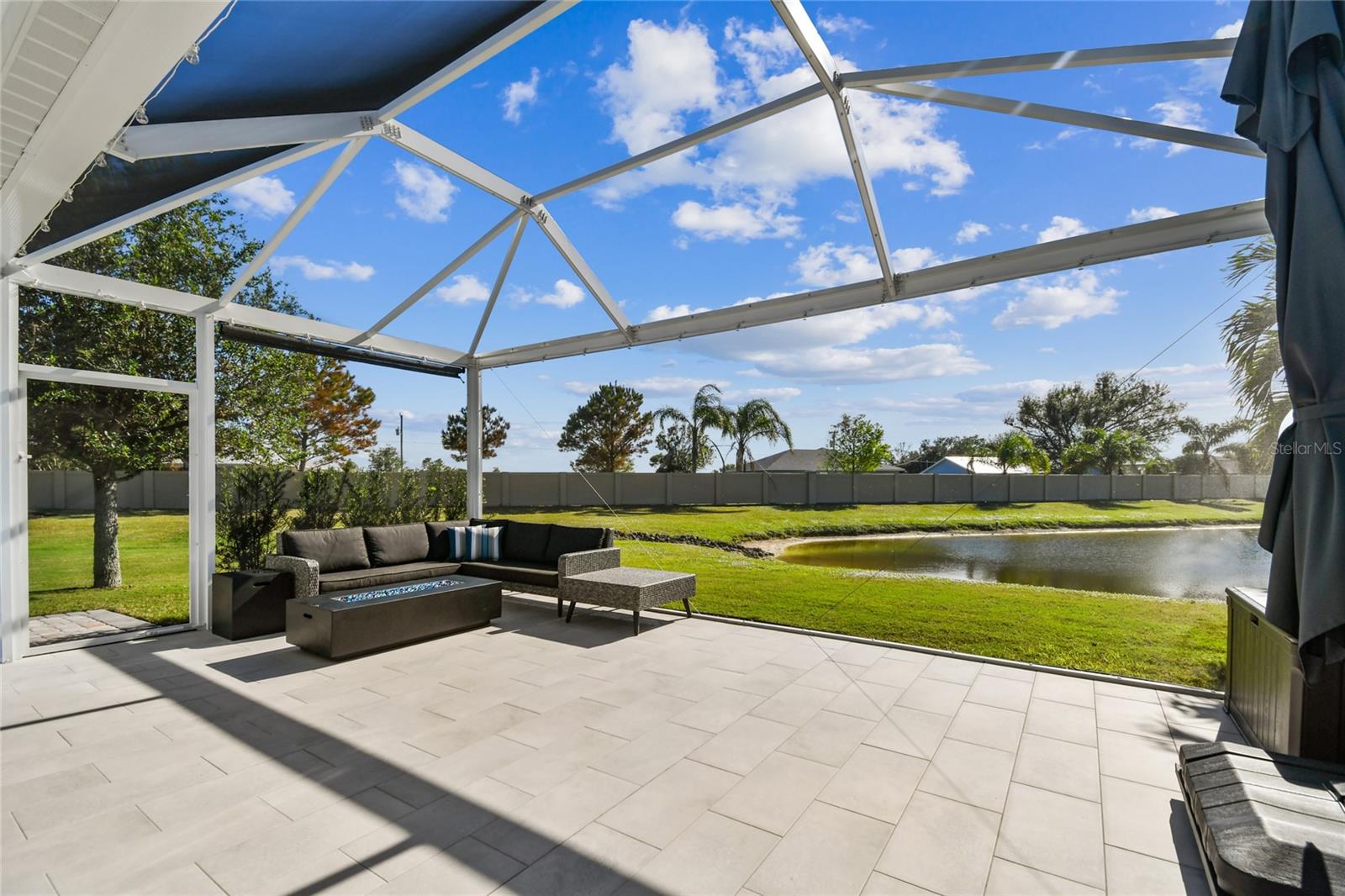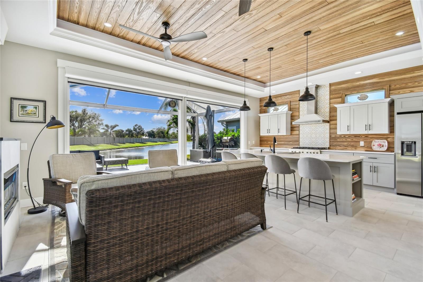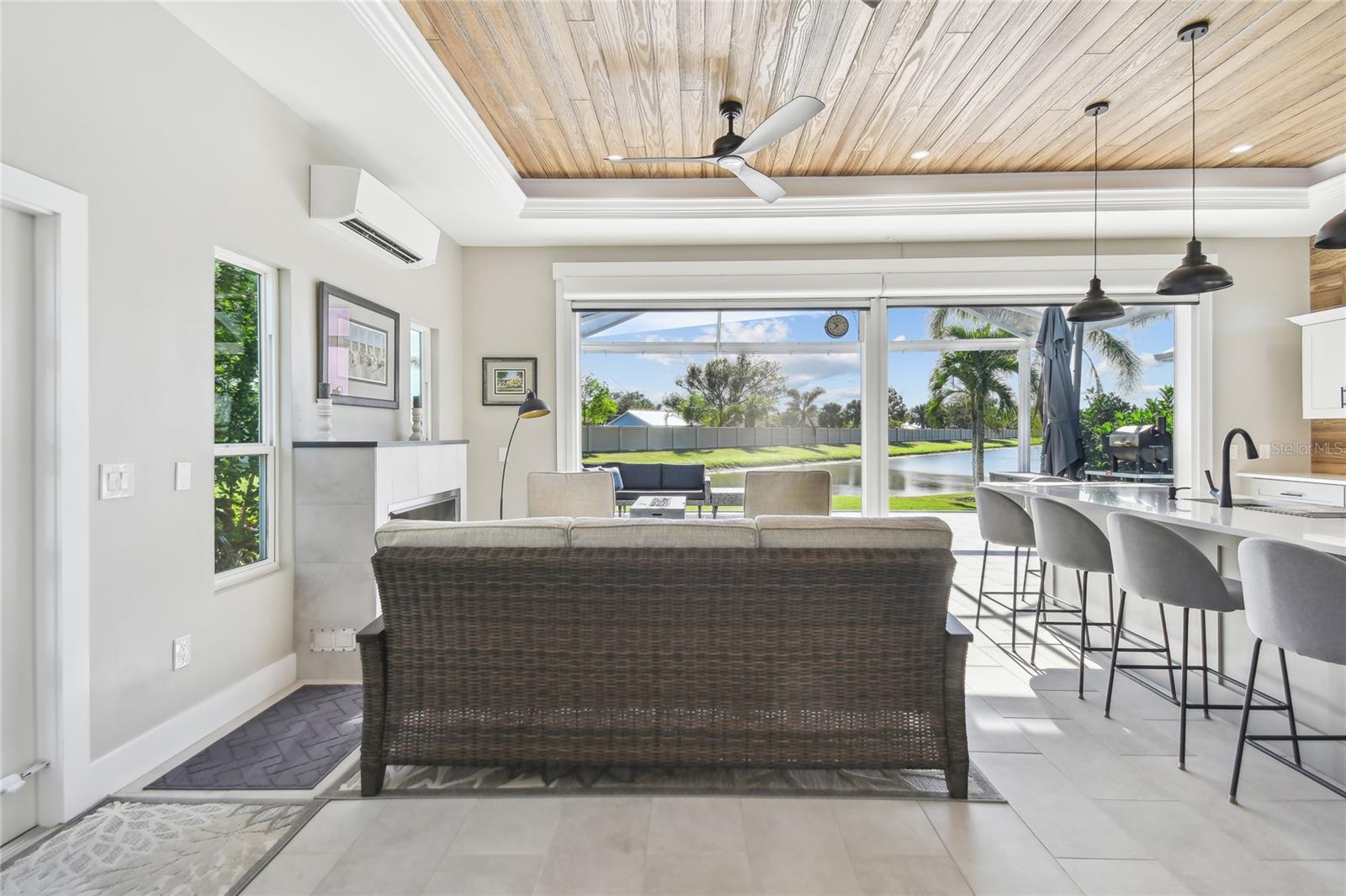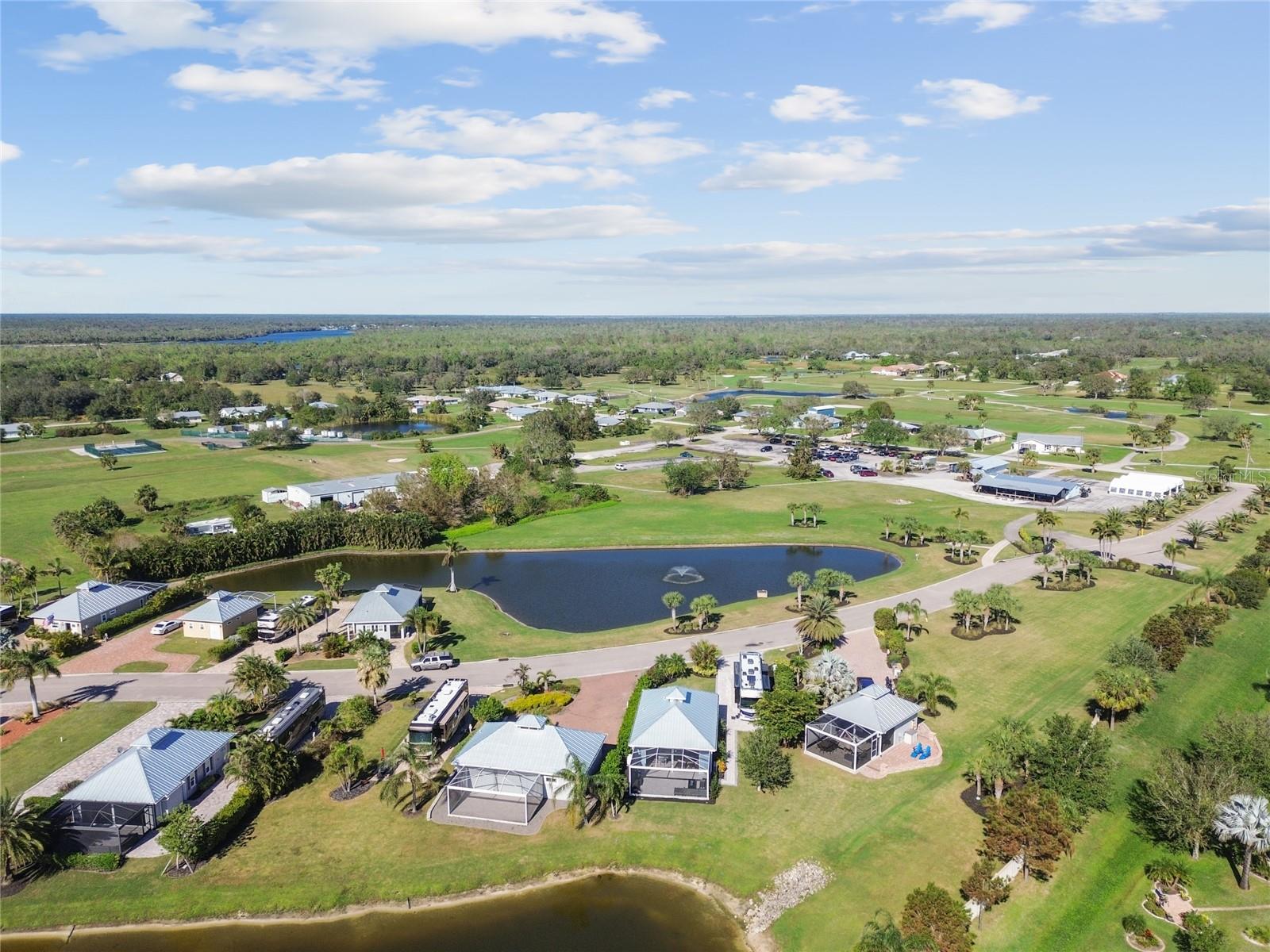 This modern and meticulously maintained casita at Thornton Creek Motorcoach Resort combines comfort and style in every detail. The large pavered pad accommodates any size coach and vehicle, with pavers seamlessly flowing to the golf cart garage, side entrance, and wrapping around to the lanai. With 936 square feet of air-conditioned living space and 1,375 total, this fully furnished casita offers a generous and well-thought-out floor plan. Step through the front door into the air-conditioned kitchen and main living area, where hurricane Kevlar screens, roll-down Eisenglass screens, and wood plank ceilings create a cozy and inviting atmosphere. The sleek kitchen, complete with a long island and barstool seating, showcases tasteful design details and functional features throughout. Anchored by a contemporary gas fireplace, the main living area exudes warmth and sophistication. French doors lead to a versatile air-conditioned space with a pull-out sofa, perfect for use as a living room, home office, or guest bedroom. The spacious bathroom features a walk-in tiled shower with a niche and corner shelf, combining both functionality and elegance. A dedicated laundry closet houses a stackable washer and dryer, providing convenience without sacrificing space. The air-conditioned golf cart garage, complete with speckled epoxy floors and ample shelving, enhances both storage and style. Out back, the 375-square-foot screened lanai offers a tranquil retreat, featuring a gas fire pit, comfortable furniture, and serene water views with no rear-facing neighbors. To top it all off, this casita comes fully furnished with carefully selected pieces, making it truly move-in ready. Contact us today to schedule your showing!