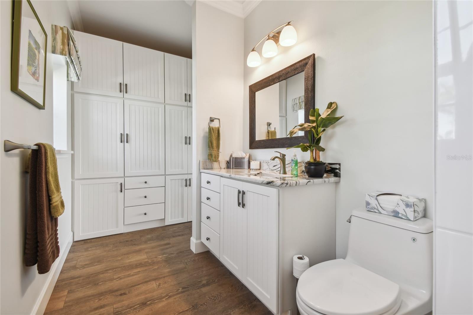 Discover the perfect combination of luxury and comfort with this beautifully maintained casita at Thornton Creek Motorcoach Resort. This casita offers 863 square feet of air-conditioned living space and 1,360 total square feet, with a layout designed for convenience and style. A lushly landscaped front yard, adorned with palm trees and tropical greenery, creates an inviting entry to this waterfront retreat. A large pavered patio at the rear of the property features a fire pit and serene water views, framed by a retaining wall. The patio flows seamlessly to the screened lanai, which includes another gas fire pit surrounded by seating and a dining table on the opposite end. From the lanai, step into the kitchen and main living area, where wood plank ceilings and motorized hurricane Kevlar screens offer protection year-round. The gourmet kitchen boasts high-end appliances, including a Viking oven, built-in grill and cooktop, farm sink, and a spacious island with wraparound barstool seating. A butler’s pantry adds even more storage and includes a refrigerator and extra built-in cabinetry. Accordion-style sliders open into a flexible living space that functions beautifully as a bedroom or a living room. The bathroom includes a tiled walk-in shower, a large vanity, and plenty of built-in storage for a sleek and organized feel. The golf cart garage includes a washer and dryer, a sink, and plenty of built-in cabinetry for all your storage needs. Schedule your private tour today and experience the very best of luxury casita living!