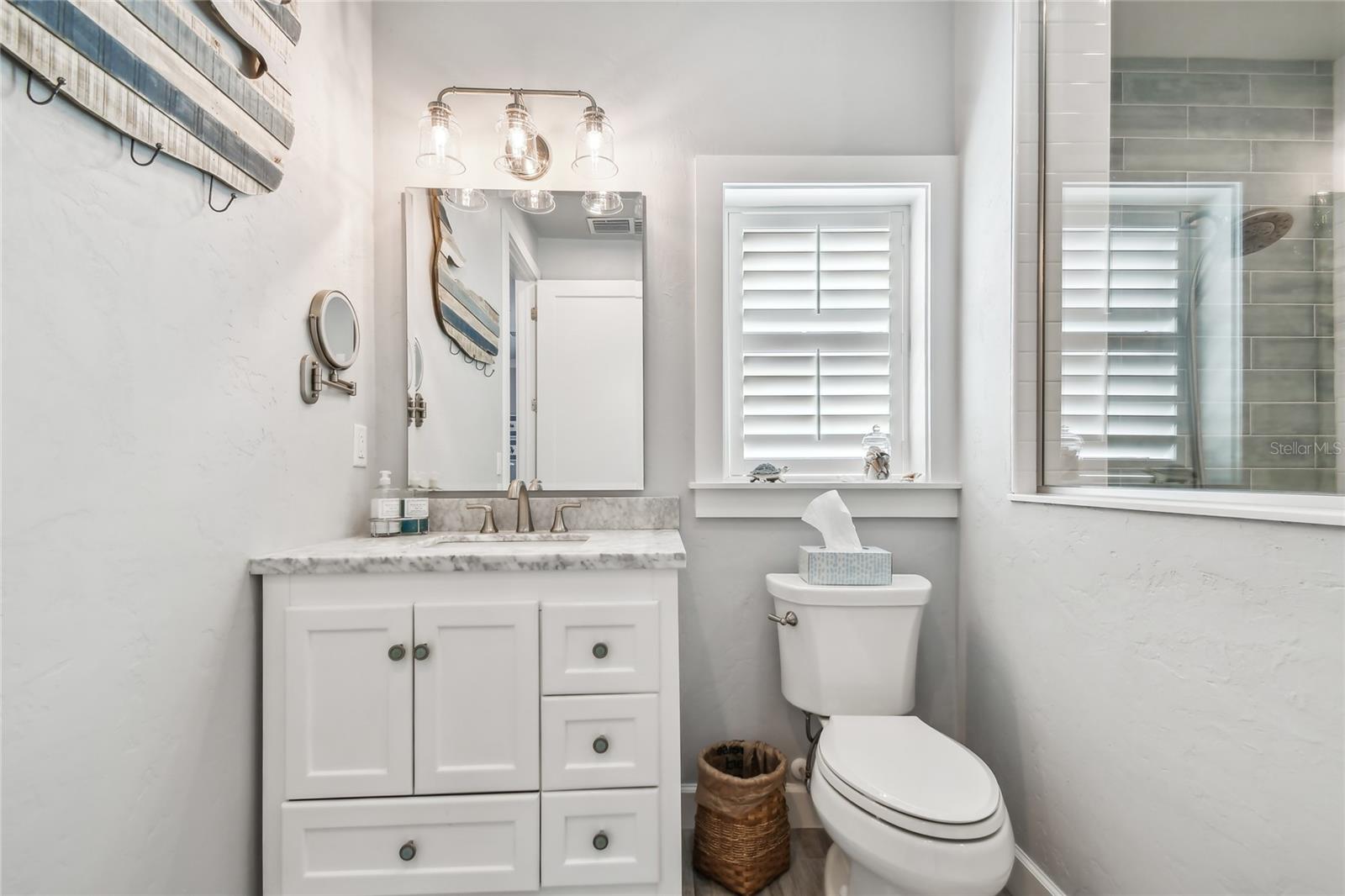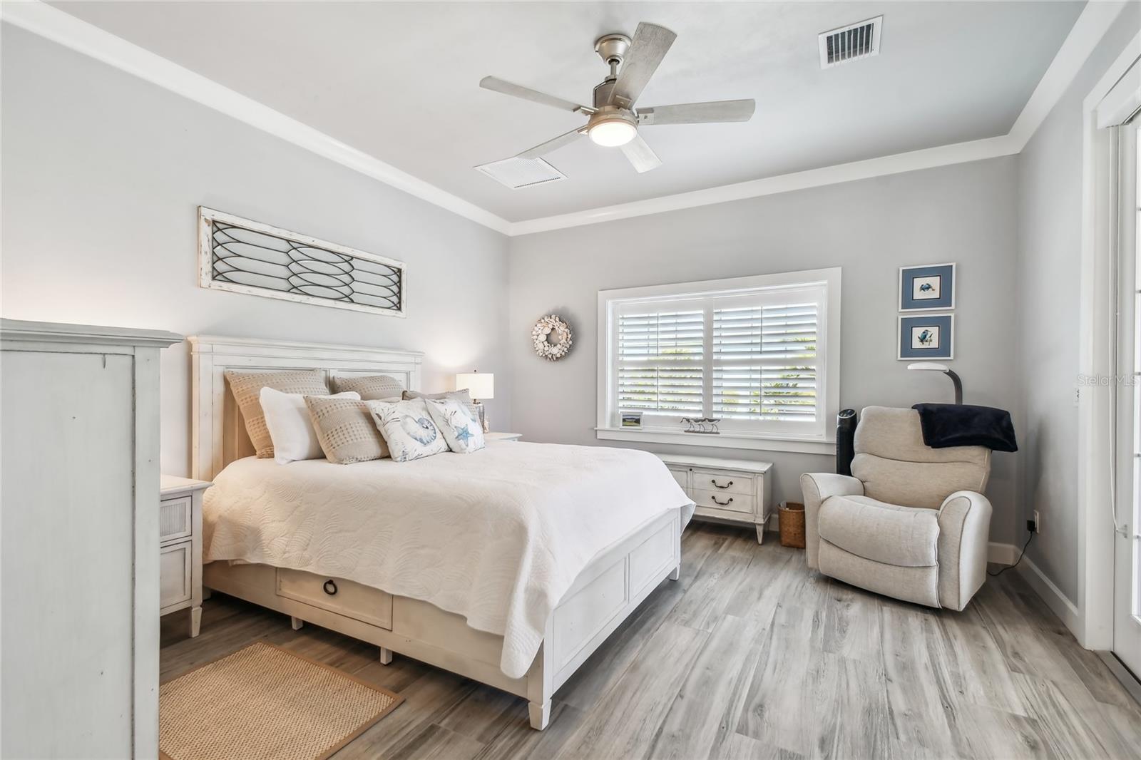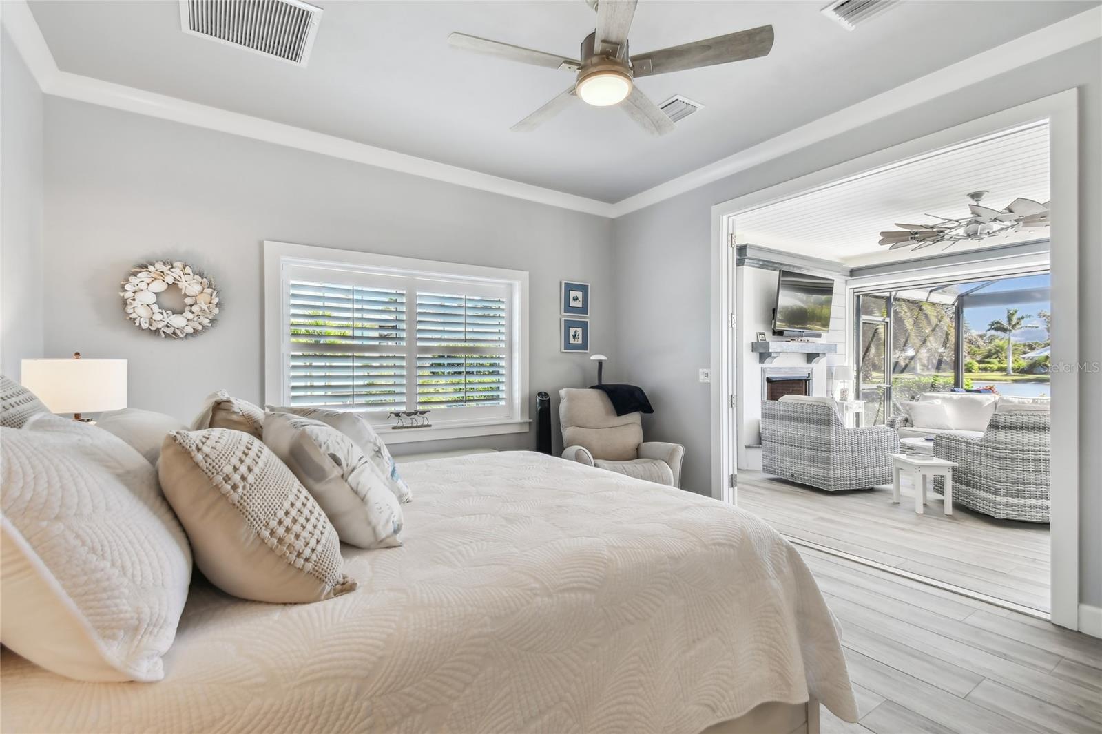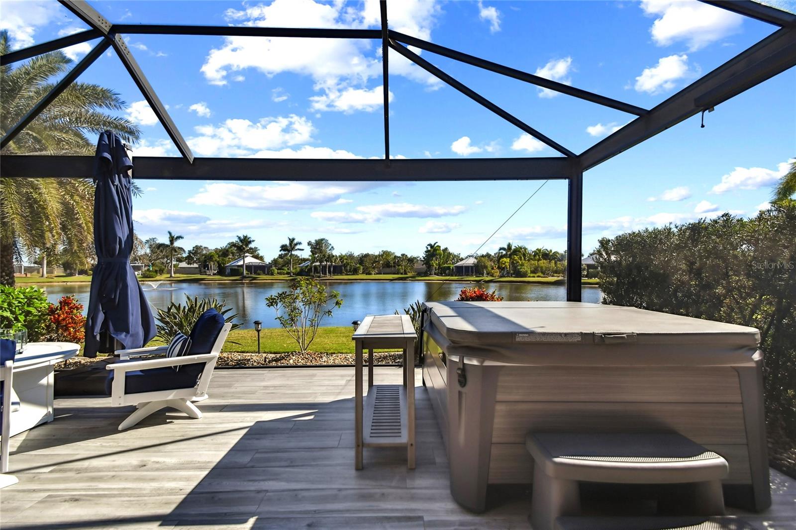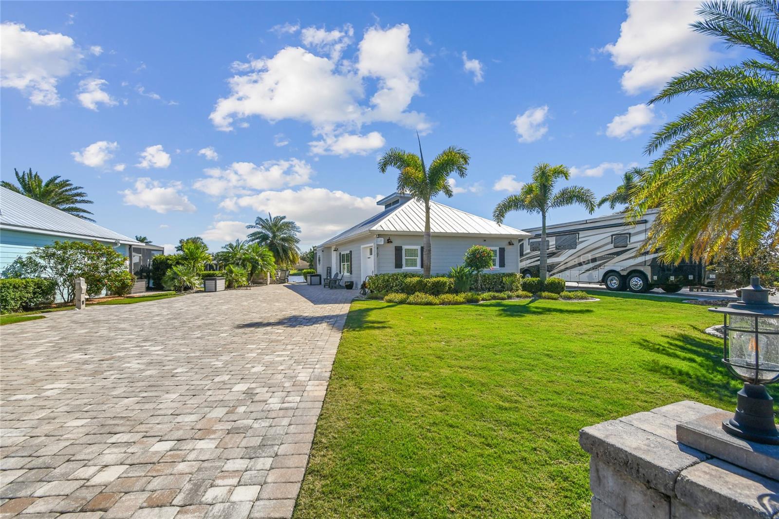 Come experience luxury casita living at its best at Lot 28. The large pavered pad accommodates any size coach with ease, while a pathway winds around the casita, leading to a cozy fire pit and seating area. Surrounded by swaying palm trees and tranquil water views, this outdoor space is the perfect spot to unwind. Step inside to a welcoming screened lanai complete with a hot tub and a gas fireplace with seating. Motorized Kevlar hurricane screens add comfort and protection, seamlessly blending the lanai with the main living area. Designed with both style and function in mind, the kitchen boasts a gas stove, built-in oven, microwave, dishwasher, and a French-door refrigerator. The granite-topped island with barstool seating serves as a centerpiece for entertaining. With 764 air-conditioned square feet, this thoughtfully designed casita offers everything you need for a luxurious retreat. The spacious bedroom opens through elegant French doors to stunning water views and the main living area. An indulgent bathroom awaits, complete with a walk-in shower, impeccable finishes, and room to relax. A dedicated laundry room with a washer, dryer, farm sink, and custom cabinetry ensures practical convenience. For additional storage, the golf cart garage features a roll-down door and built-in overhead space. Schedule a tour today and discover why this exceptional property is the perfect escape.