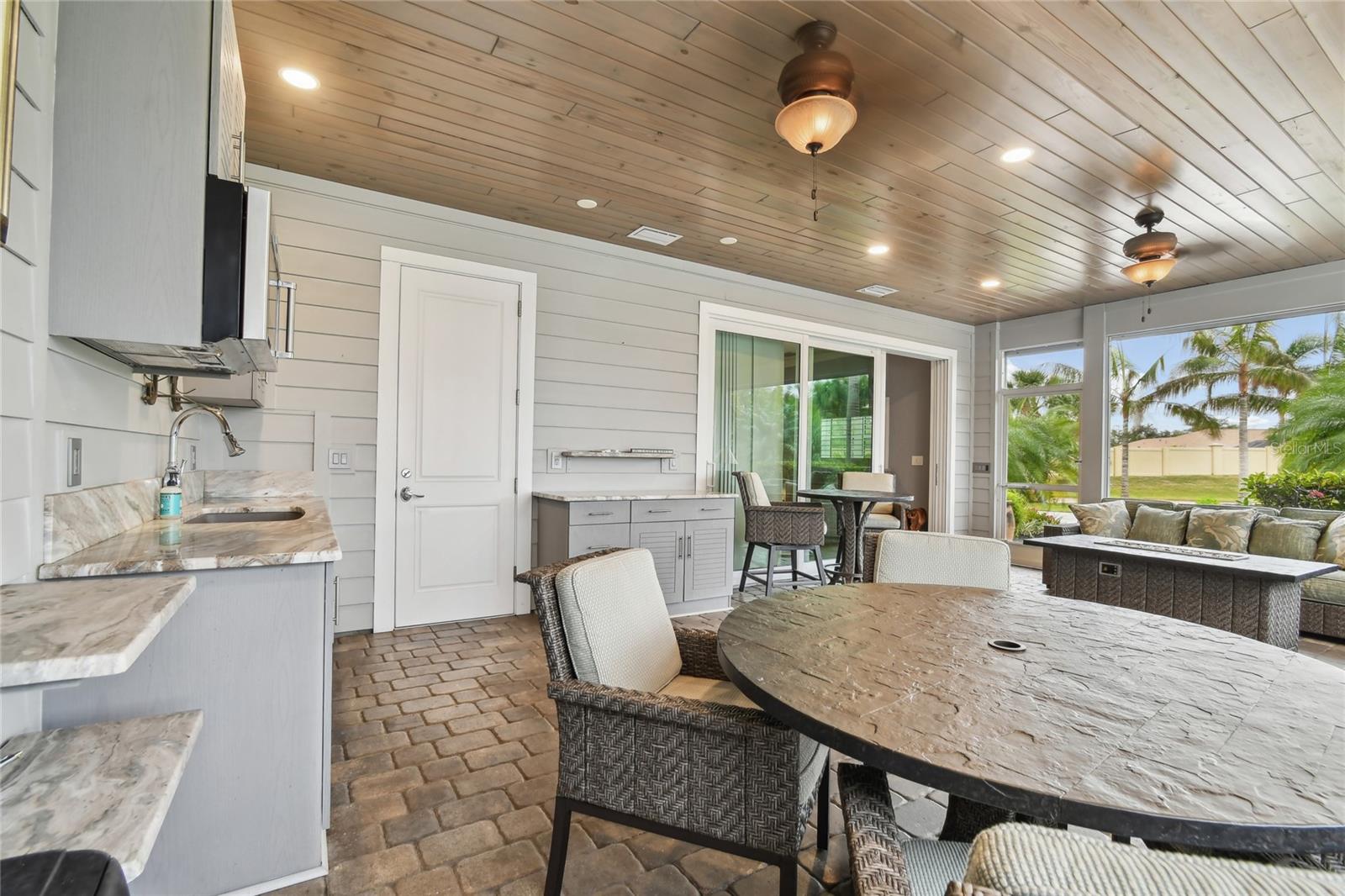 This is the only dual-lot property in the resort, offering a rare combination of space and potential. The casita is situated on one lot, while the second lot provides the option to sell, hold, or build on—giving you unmatched flexibility to create your ideal setup. The large circular paver driveway easily accommodates any size motorcoach, multiple vehicles, or golf carts with room to spare. Surrounding the property, lush tropical landscaping frames the space beautifully, creating a welcoming and private outdoor oasis. Inside, the thoughtfully designed kitchen boasts marine-grade cabinets, granite countertops, and stainless steel appliances, including a fridge, microwave, and dishwasher. Wood plank ceilings, recessed lighting, and sliders from the living area to the bedroom provide a blend of comfort and style. The bathroom is outfitted with a deep soaking tub, tiled walk-in shower, and a spacious vanity with extra cabinet storage. Other thoughtful features include a golf cart garage with a roll-down door, a washer and dryer, and additional storage space. The 375 sq. ft. screened lanai offers tranquil views of the water, making it an ideal spot for outdoor relaxation. With direct water views from the back and no front-facing neighbors, this property ensures privacy and a serene retreat. Whether you're looking to enjoy enhanced outdoor living or take advantage of its investment potential, this dual-lot property is truly one of a kind. Schedule a tour today to see it for yourself!