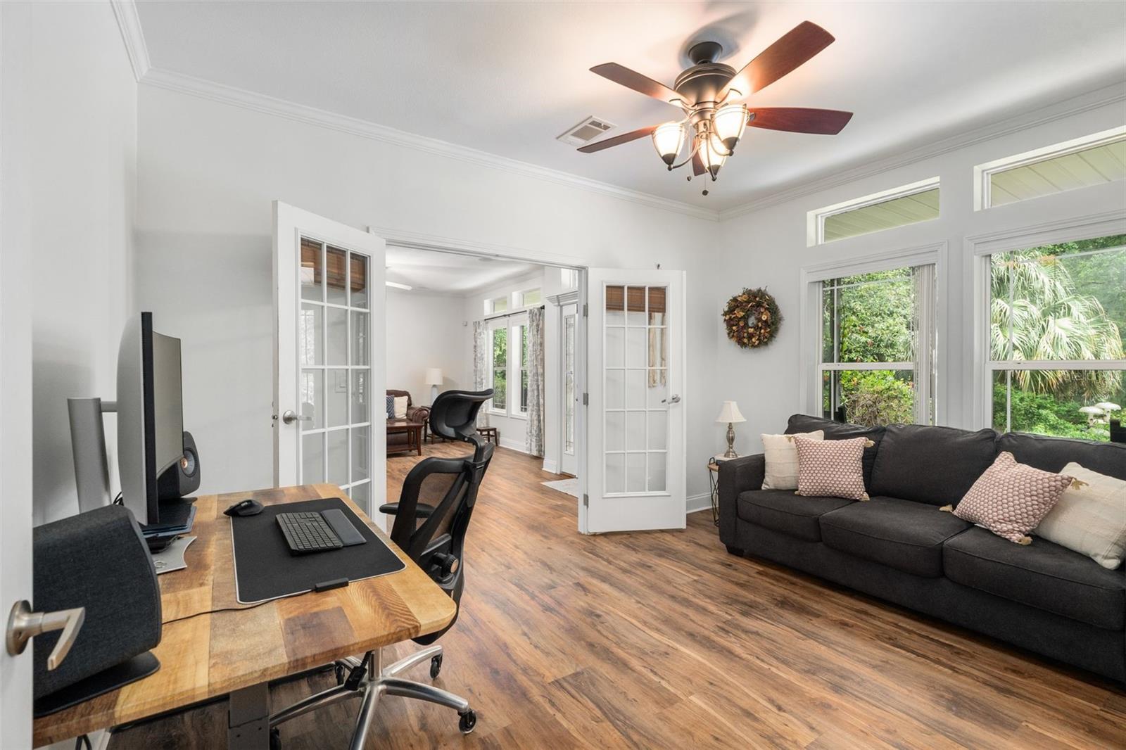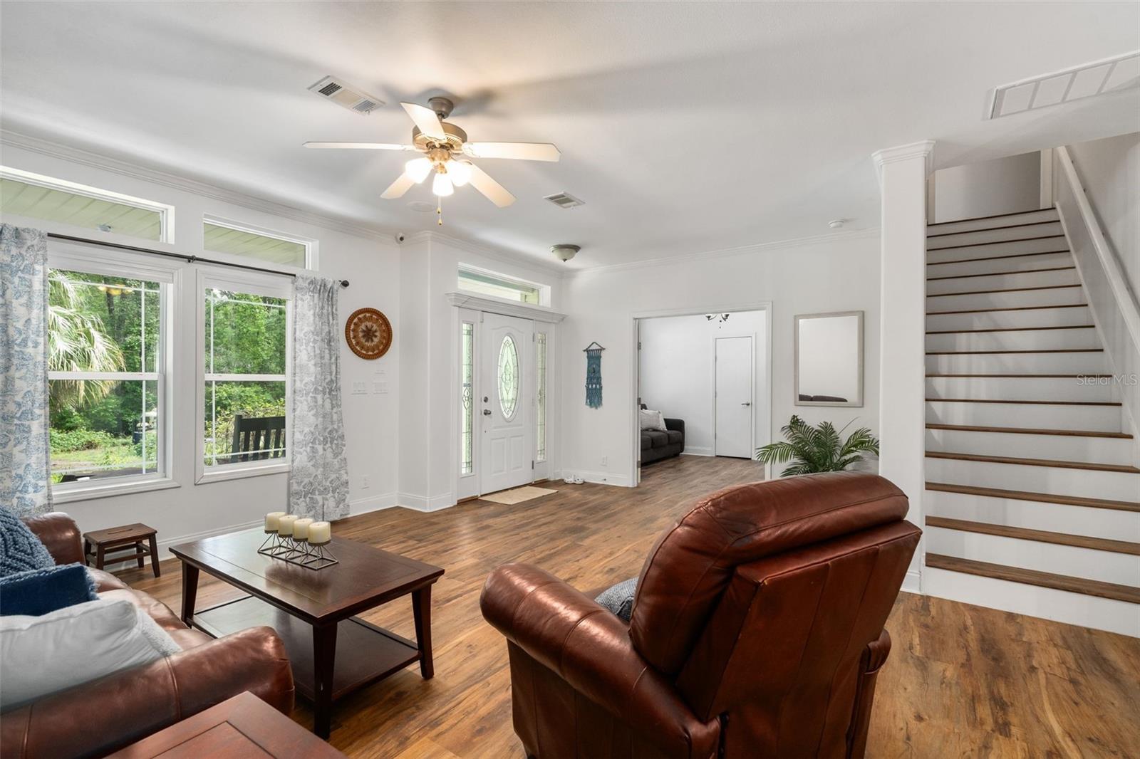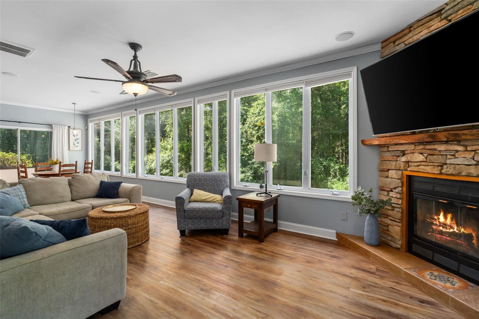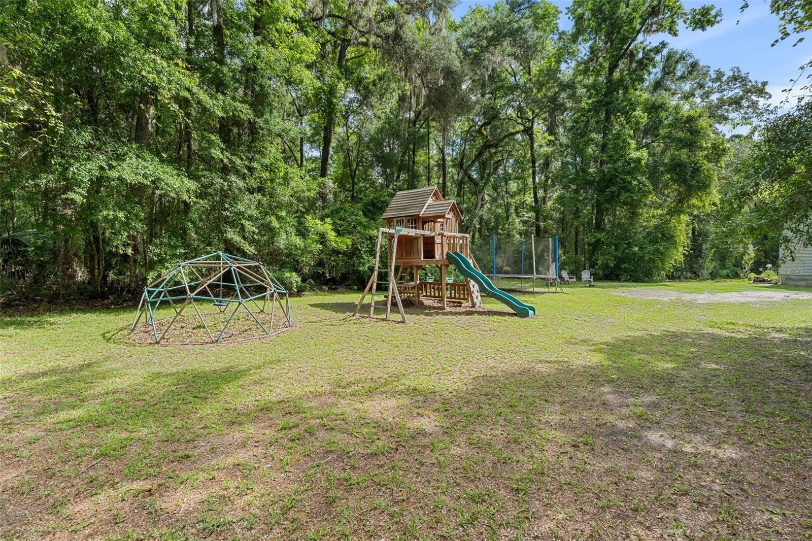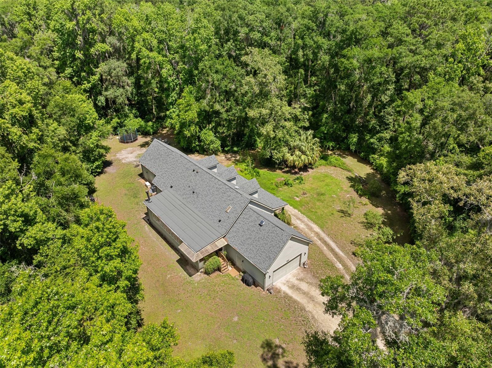 Welcome to your private retreat on just over 5 serene acres! This beautifully maintained 4-bedroom, 4-bath home plus a large office/den offers space, functionality, and peaceful Florida living. The thoughtful layout features a spacious first-floor primary suite and a separate guest suite, with two additional bedrooms, a full bath, and a versatile flex room upstairs. No carpet throughout the home makes for easy maintenance. Enjoy relaxing evenings on the charming front porch or unwind on the screened-in back lanai. The kitchen boasts an upscale feel with custom wood cabinetry,gas stove, and stainless steel appliances. The star of the show would have to be the sunroom—with windows lining the entire length—floods the home with natural light and offers views of the lush, Florida-friendly landscaping. Car enthusiasts or hobbyists will love the 3-car garage setup, including a dedicated one-car garage/large workshop with a full bath. The property also includes a massive pole barn with storage and a separate covered large RV/boat area each one with full water and electric hookups. Additional features include a whole-house generator, laundry room, and a location that feels miles away from it all—yet is just minutes to Archer and Tower Road, with shopping, and restaurants. Truly a rare combination of comfort, privacy, and functionality!