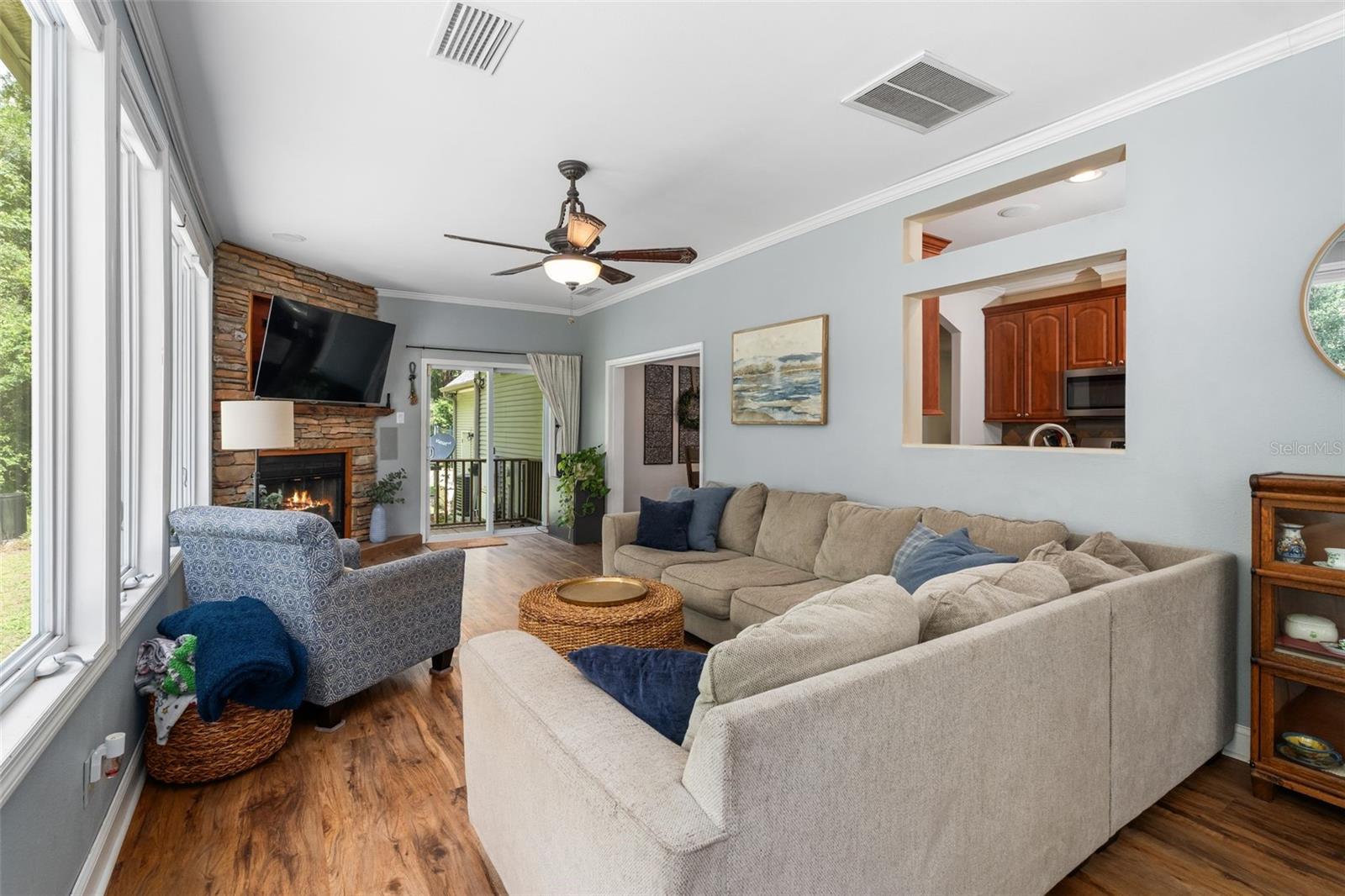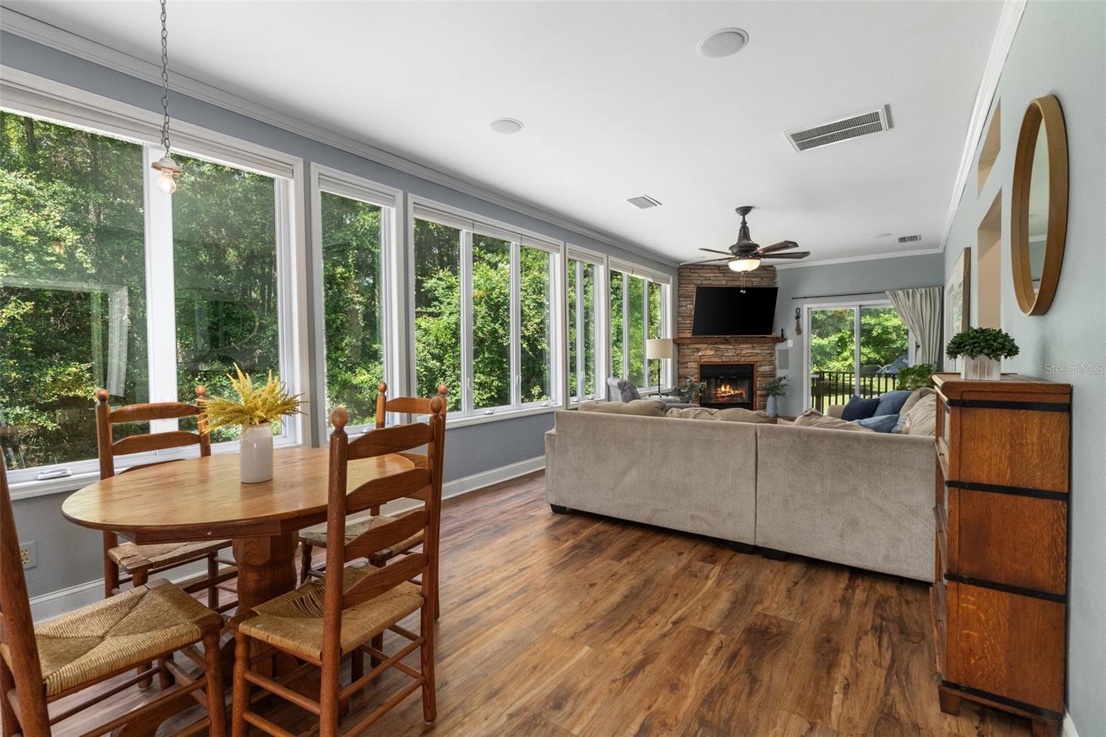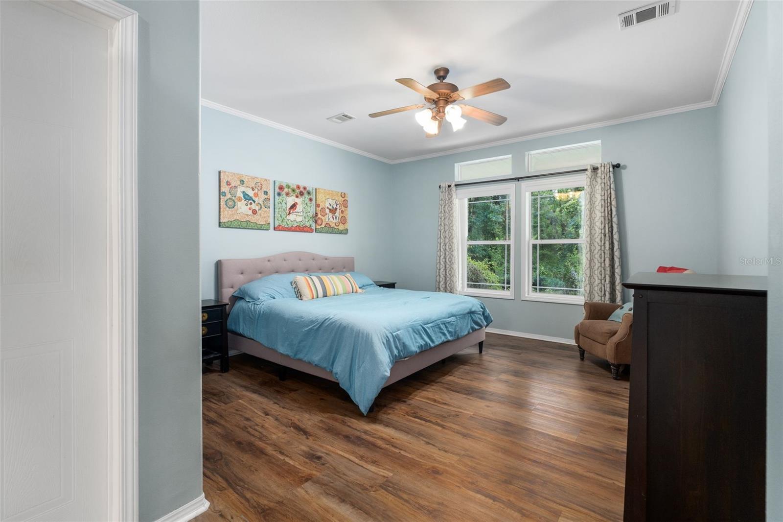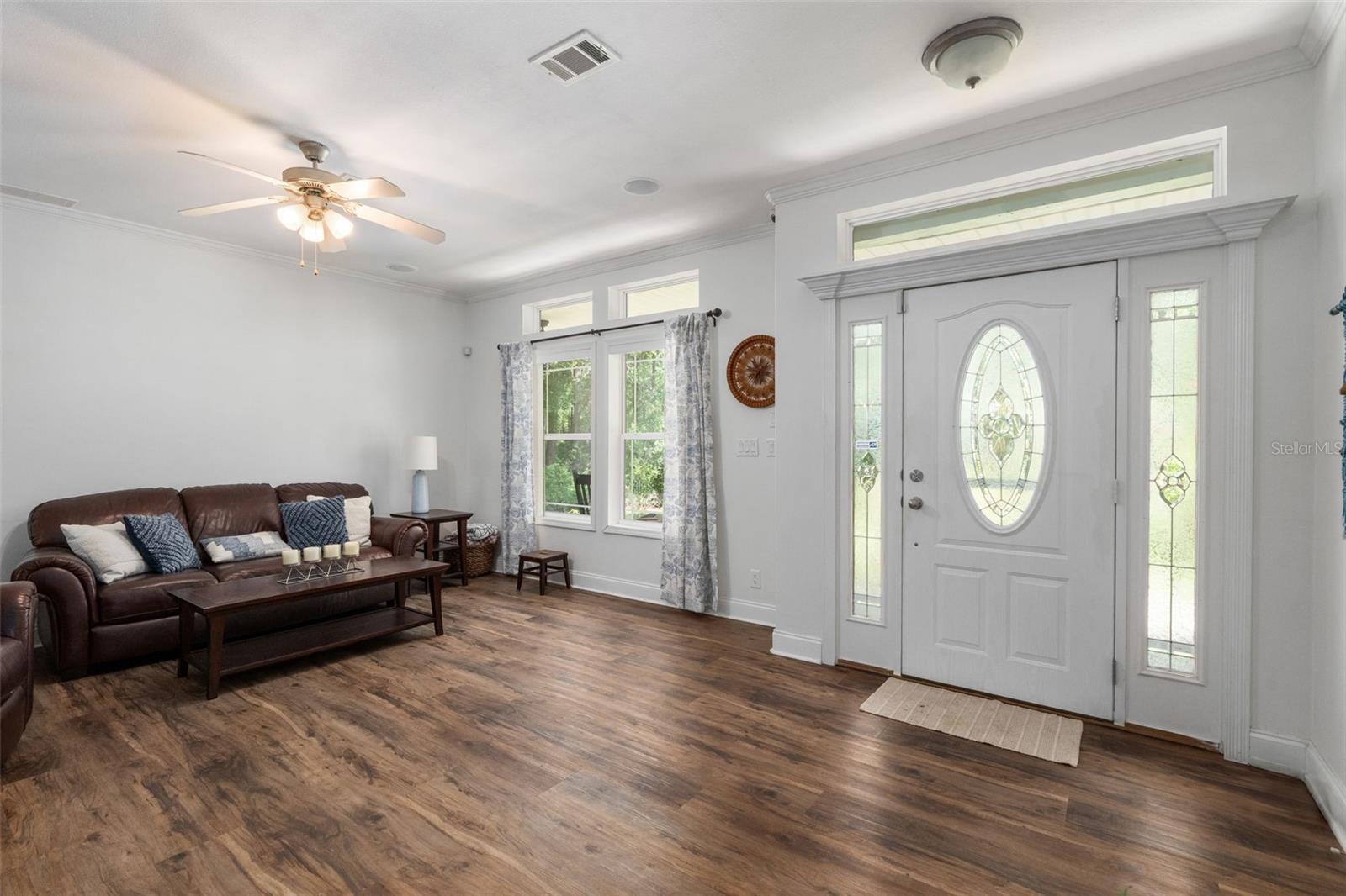 Welcome to your private retreat on just over 5 serene acres! This beautifully maintained 4-bedroom, 4-bath home plus a large office/den offers space, functionality, and peaceful Florida living. The thoughtful layout features a spacious first-floor primary suite and a separate guest suite, with two additional bedrooms, a full bath, and a versatile flex room upstairs. No carpet throughout the home makes for easy maintenance. Enjoy relaxing evenings on the charming front porch or unwind on the screened-in back lanai. The kitchen boasts an upscale feel with custom wood cabinetry,gas stove, and stainless steel appliances. The star of the show would have to be the sunroom—with windows lining the entire length—floods the home with natural light and offers views of the lush, Florida-friendly landscaping. Car enthusiasts or hobbyists will love the 3-car garage setup, including a dedicated one-car garage/large workshop with a full bath. The property also includes a massive pole barn with storage and a separate covered large RV/boat area each one with full water and electric hookups. Additional features include a whole-house generator, laundry room, and a location that feels miles away from it all—yet is just minutes to Archer and Tower Road, with shopping, and restaurants. Truly a rare combination of comfort, privacy, and functionality!