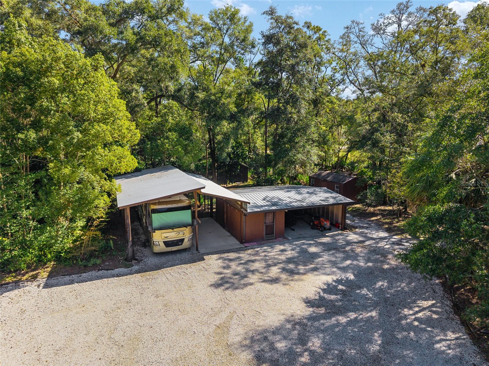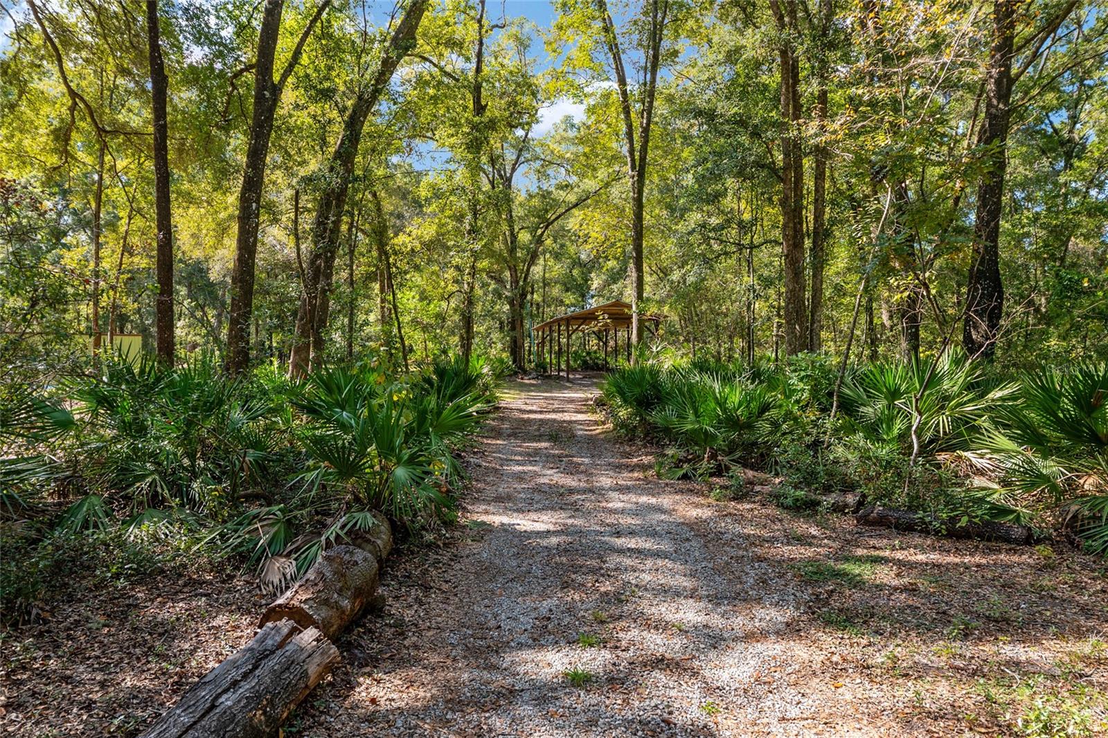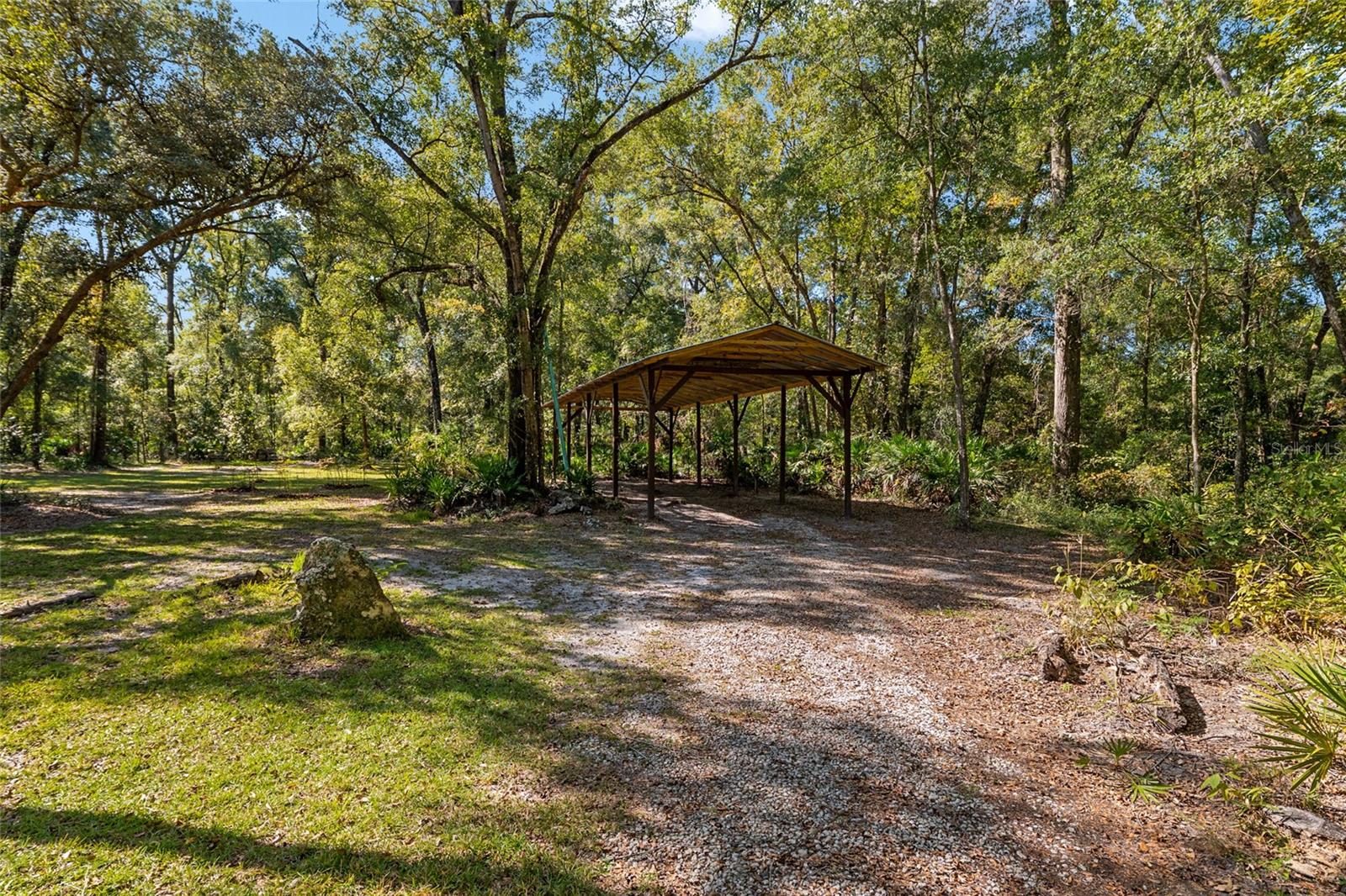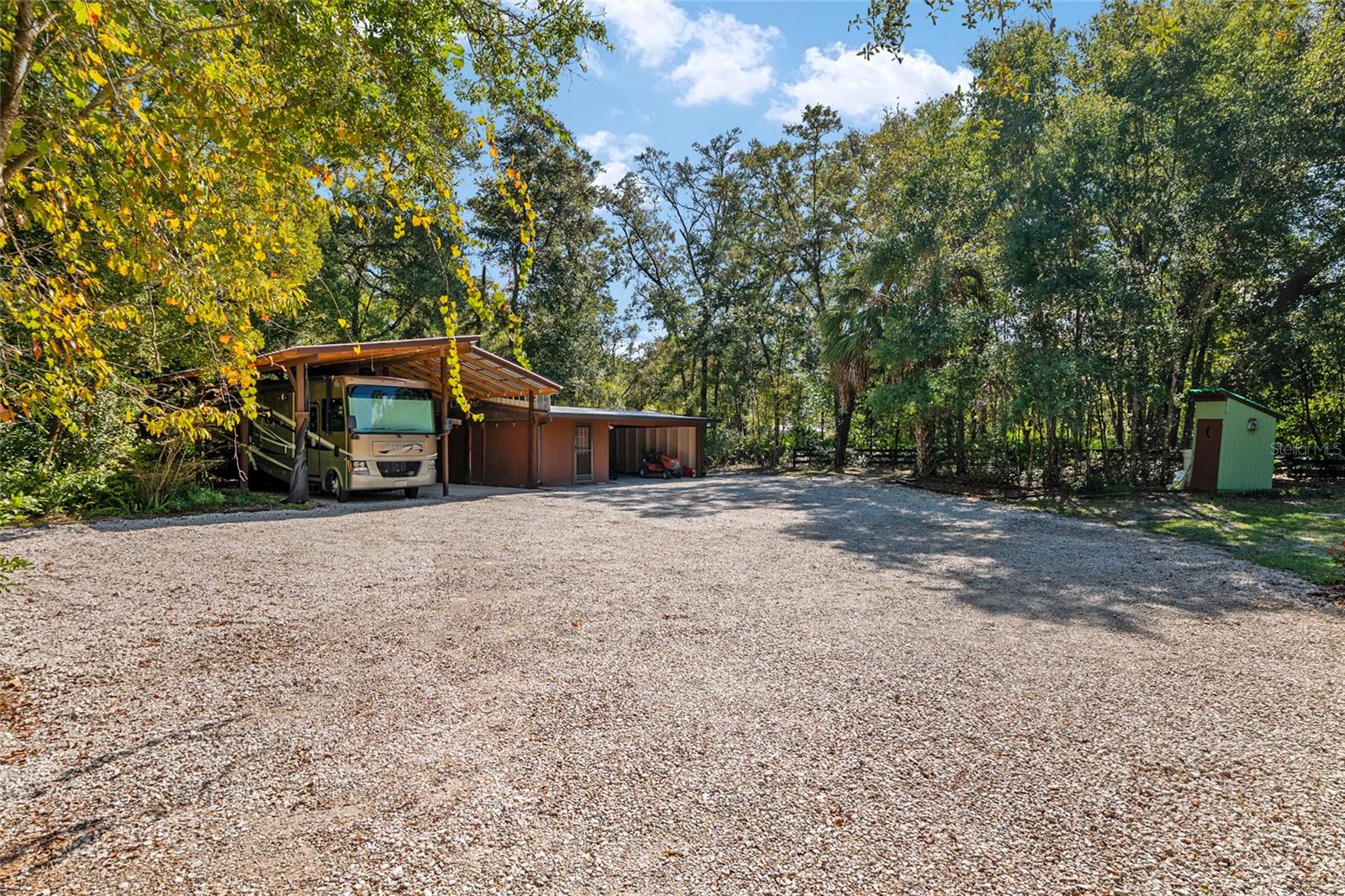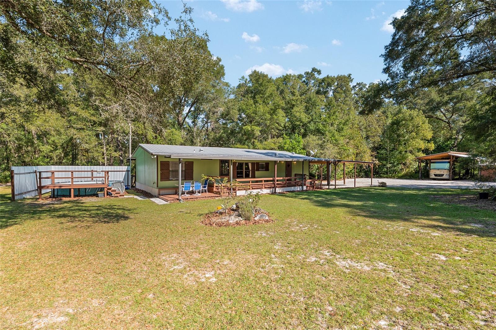 Discover your peaceful sanctuary in this meticulously maintained 3 bedroom 2 bathroom home nestled on 6 completely fenced acres of a beautiful mix of cleared land and natural woodland. Upon entry into the residence from the expansive deck, you will be overwhelmed with the abundance of warmth and comfort stemming from the newer luxury vinal plank floor carefully laid throughout the home with the only carpet being smartly located in the massive bedroom closets. Natural light flows guiding you to the chef’s dream kitchen boosting tons of cabinet and countertop space along with newer stainless-steel appliances. The intelligent floor plan joins the large dining room to the sprawling living room area creating an enormous great room that will keep the whole family connected. All three bedrooms are good size with the split primary bedroom offering a walk-in closet, a dual sink vanity, and a separate step in shower. As nice as the home is, outside is where this property really shines. As you enter through the super convenient solar powered gate, you can take a right towards a massive RV/5th wheel cover offering 50 amp service, water, and a tie into the 3 year old septic system for storage or in-law/guest space. Heading straight up the driveway will open onto a gravel drive turn around that connects the home with an additional two covers large enough for a 35 foot RV and an additional fifth-wheel/tractor/lawnmower/boat. Attached to those covers is an enclosed office or storage room with power and another carport storage area for a grand total of 2 RV covers, 1 fifth wheel or boat cover, and 4 covered parking areas for vehicles. As if that was not enough, behind the carport is a covered workshop area and 2 large nearby sheds. In addition to the entire 6 acres being fenced, there is a smaller fenced in area off the screen patio perfect for smaller pets. Included are less than 2 year starting of apple trees/grapefruit/clementine trees and 2 metal garden planter beds for any gardening needs. Can’t miss the 10,000 gallon above the ground pool to enjoy the Florida hot summer days and cool off. Pool also features a custom deck and privacy wall if the surrounding forest is not enough. Come let this property take your breath away.