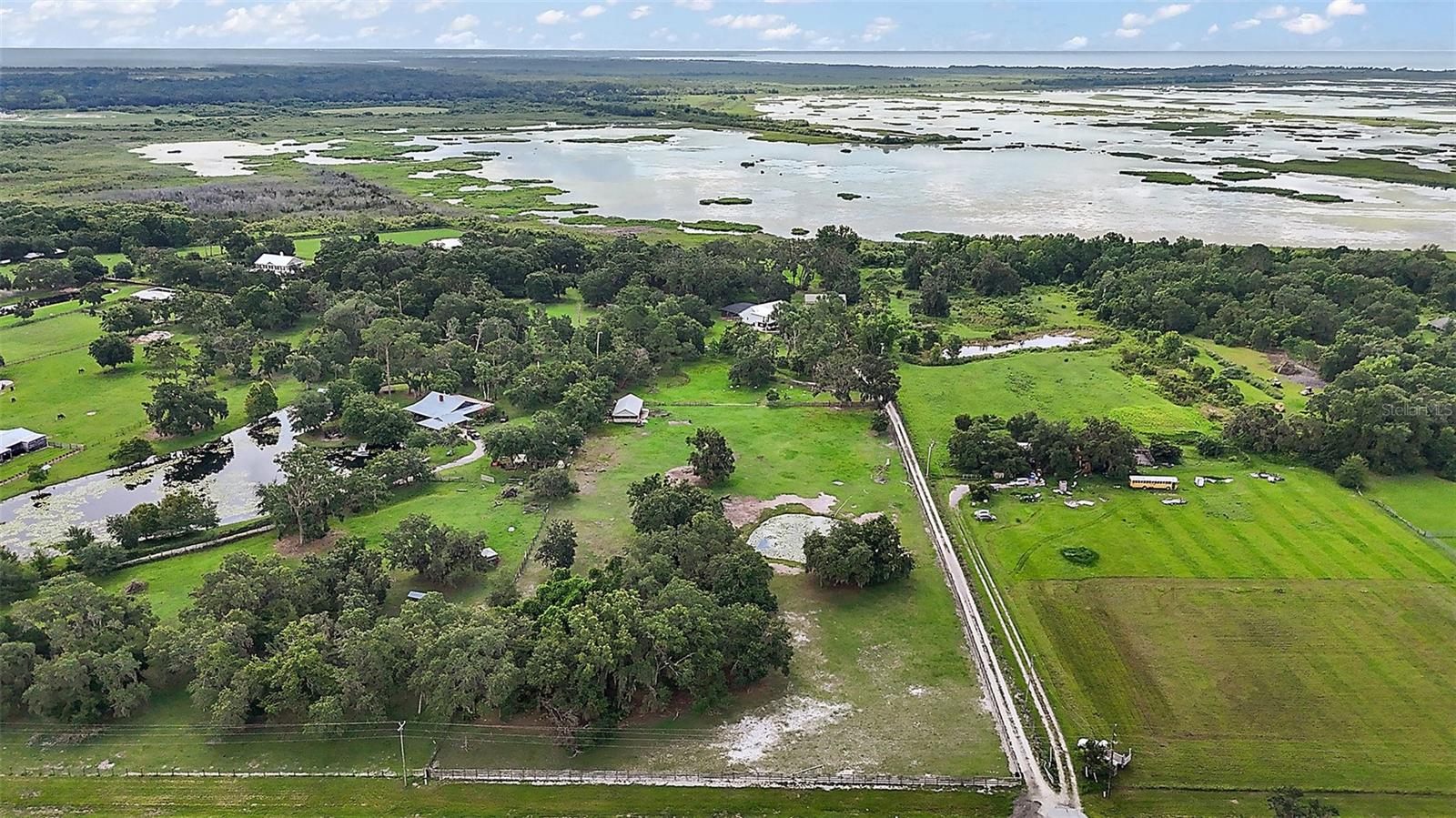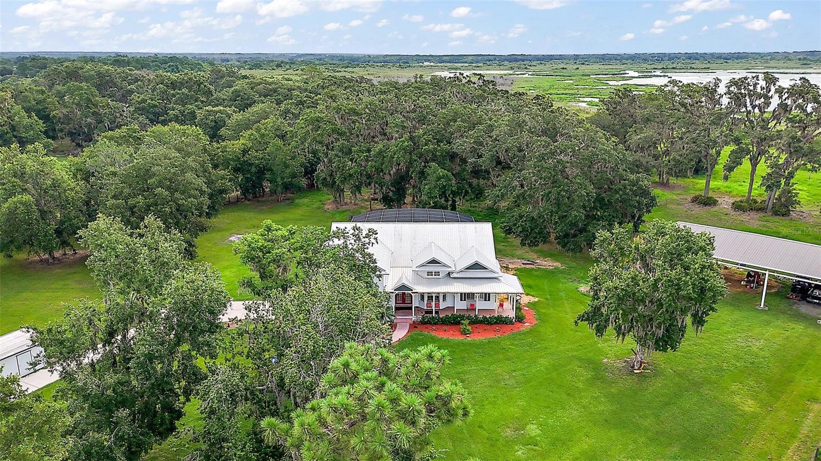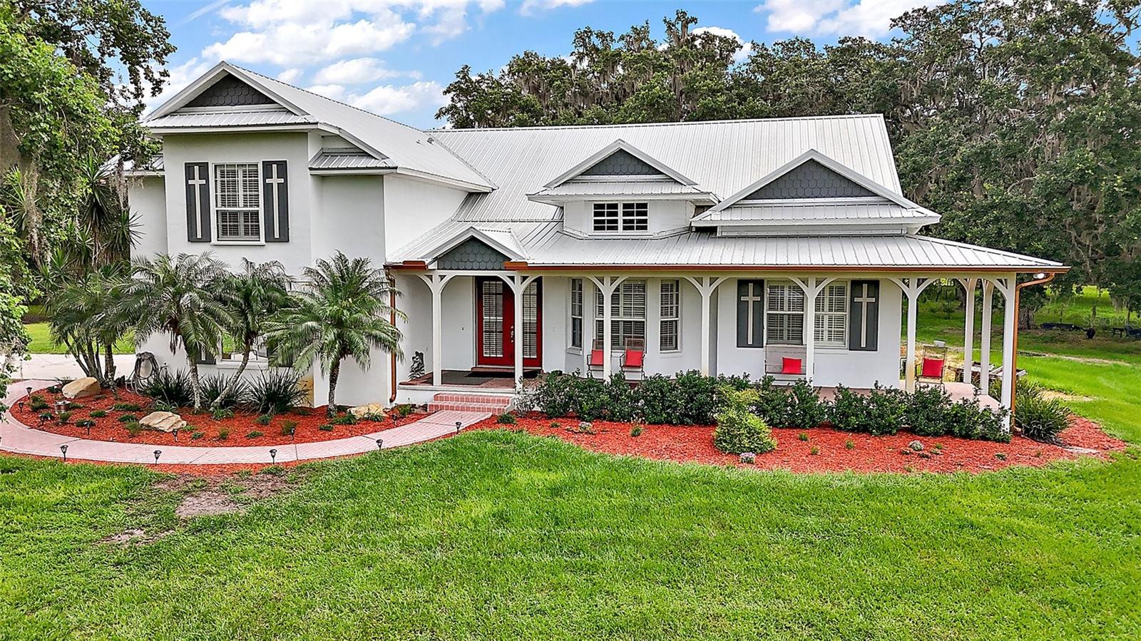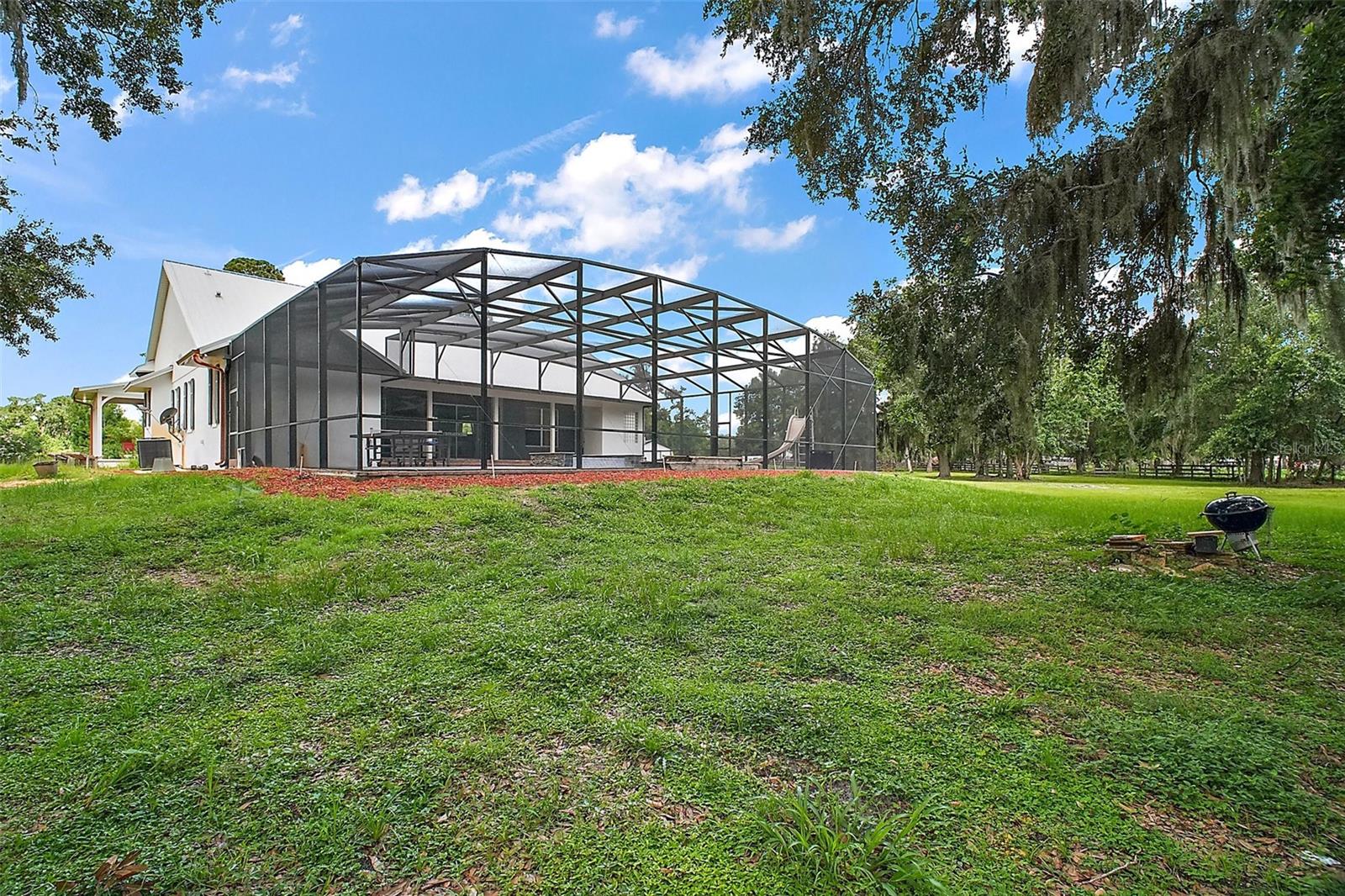 Discover the perfect blend of upscale living and country tranquility with this exceptional 4-bedroom, 4-bathroom custom home nestled on 12 fully fenced, pristine acres in the heart of Astatula. Ideal for horse lovers, hobby farmers, RV travelers, or anyone seeking space, privacy, and functionality, this property offers a rare opportunity to own a piece of paradise with high-end features and unmatched versatility. Step inside to a spacious 2,615 sq ft floor plan designed for comfortable living and effortless entertaining. This home boasts an open concept living, dining and kitchen area with vaulted ceilings, a double-sided fireplace and beautiful engineered hardwood floors throughout the home. The Gourmet kitchen features beautiful solid wood cabinetry, granite countertops, stainless steel appliances and a breakfast bar. The large dining room is adjacent to the kitchen with a magnificent view overlooking the pool. Your Luxurious master suite is located on one side of the home and features walk in closets and an en-suite bath with dual vanities, soaking tub with hydro massage jets, separate shower and a private water closet. Two additional spacious bedrooms are located on the other side of the home, one with access to a full bath and the other with an en-suite bathroom with its own entrance to the pool. The fourth spacious bedroom is located on the second level with an en-suite bathroom and an abundance of storage space as well. All three bedrooms are perfect for your out-of-town guests or multi-generational living. There is also a flex space located between the two main level guest bedrooms just perfect for an office or sitting area. This home also features a dedicated laundry room with ample storage that leads to your oversized two car garage. Enjoy Florida living at its finest in your covered porch with an outdoor kitchen island complete with a built in gas grill and countertop, large flat screen TV, screened-in lanai and massive patio featuring a sparkling heated pool with a waterfall and spa, perfect for entertaining, family gatherings, or simply soaking in the serenity of your surroundings and offering incredible sunset views over your acreage. This magnificent property also features 12 fully fenced and gated acres with a mix of cleared space and mature trees ideal for horseback riding, outdoor recreation, hobby farming and just perfect for your livestock, horses, toys, and tools. There with a two-stall horse barn, steel framed over-sized RV pole barn ideal for RV’s, boats, trailers or outside workshop use. There is also a chicken coop, a nicely sized utility shed for lawn equipment and room to add an arena, garden or more outbuildings. Whether you're looking to start a small farm, needing a multi-use property with room to grow, or want a retreat with top-tier amenities, this estate has it all. Don’t miss this unique opportunity to own a one-of-a-kind estate in the peaceful and scenic community of Astatula just minutes from Downtown Tavares, Mount Dora and Clermont with easy access to major roads, dining, shopping and area lakes. Schedule your private showing today and experience the best of country living with modern comfort! The Sellers have recently installed new fencing on the front and sides of the property.