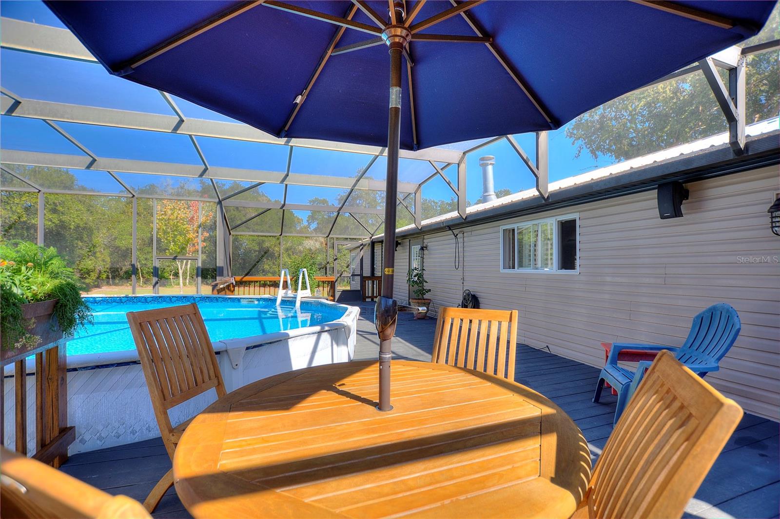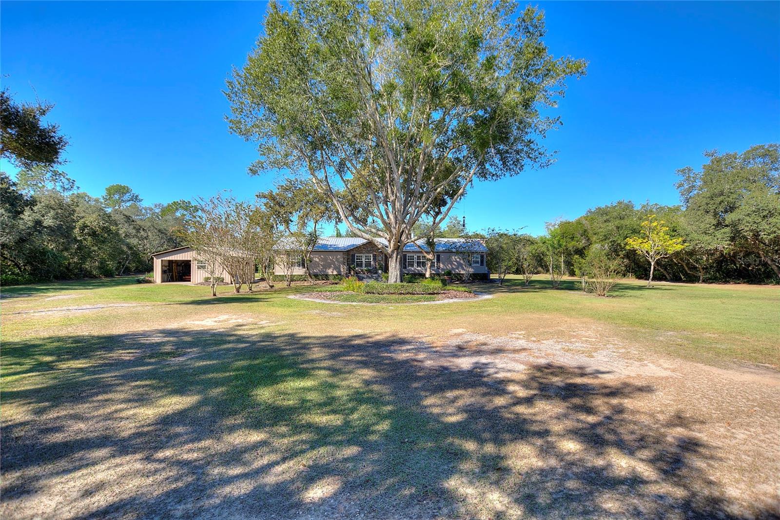 Escape to a private paradise where country charm meets modern convenience! This impeccably maintained 2000 Fleetwood MH offers 1,822 sq. ft. of luxurious living space, including 4 bedrooms, 2 baths, and an office, all nestled on 5 high-and-dry acres zoned for agriculture—perfect for your beloved animals and a tranquil rural lifestyle. A Home That Shines Inside and Out From the moment you arrive, you'll be captivated by the brick column entry with a pull gated drive, offering a sense of privacy. The home, freshly painted inside and out, boasts timeless features such as a galvanized steel roof (2015), wood-burning fireplace, and wood-plank porcelain tile floors designed for durability and beauty. The interior is adorned with Sunburst shutters throughout and soaring ceilings that have been meticulously redone, creating a light-filled and elegant ambiance. The gourmet kitchen is a chef’s dream, complete with new appliances, including a café refrigerator, cooktop stove, dishwasher, and an LG washer/dryer. Granite countertops, china sinks, and updated lighting in the baths elevate the home’s modern appeal, while a tankless water heater (2020) ensures instant hot water. Resort-Style Outdoor Living; Step outside to discover your very own private oasis! A 40'x45' pool deck with a newly screened enclosure surrounds a sparkling pool, perfect for cooling off on warm days. The beautifully landscaped grounds feature a garden with raised beds and 2 irrigated acres for your green thumb to thrive. The property is well-equipped for your hobbies and toys, with a 30'x36' pole barn wired for electric (220V, 50-amp service) with LED lighting, asphalt flooring, and an RV plug-in. A 22'x22' detached garage with electric and a concrete floor provides even more storage options. A Nature Lover’s Dream. Explore the 3 wooded acres at the back of the property, offering endless possibilities—build an additional home, create trails, or simply enjoy the serene privacy. For outdoor enthusiasts, nearby St. Johns owns 22,000 acres restricted to horses and bicycles, while a boat launch just 2 miles away connects you to Little Lake Harris and the Harris Chain of Lakes, renowned for bass fishing tournaments. Prime Location with Country Charm. Enjoy the peace of country living with no HOA restrictions, yet remain close to everything you need. Easy access to Highway 441, the Florida Turnpike, and new shopping hubs like Costco in Clermont ensures convenience, while charming towns like Mount Dora, Tavares, Minneola, and Clermont are just a short drive away. Key Features: • Detached garage (22'x22') with electric and concrete floor • Pole barn (30'x36') with electric, 11' height, 220V, 50-amp RV plug-in • Galvanized steel roof (2015) and vinyl siding maintained yearly • Carrier 2.5-ton A/C system for ultimate comfort • 180-foot-deep well with septic system • No HOA—bring your camper, boat, and toys! This is country living at its finest, offering unparalleled privacy, space to roam, and proximity to urban conveniences. Whether you're hosting family gatherings by the pool, tending to your animals, or setting out on a fishing adventure, this property has it all. Welcome home to your slice of paradise! Schedule your tour today and experience this private oasis for your self.