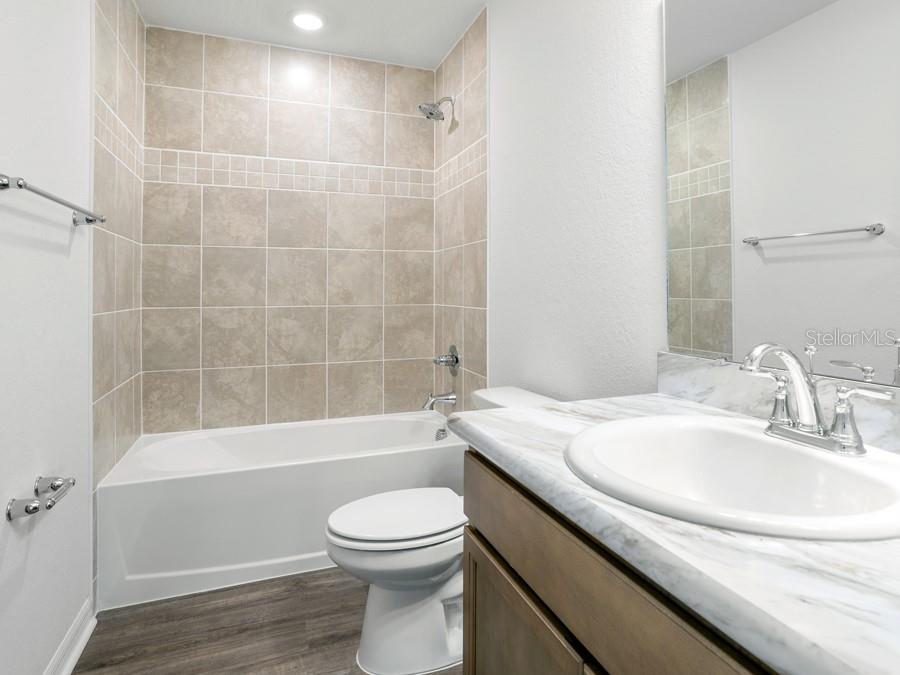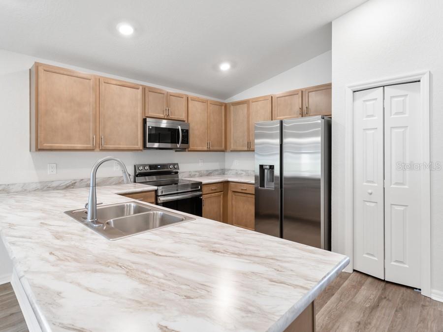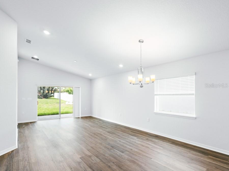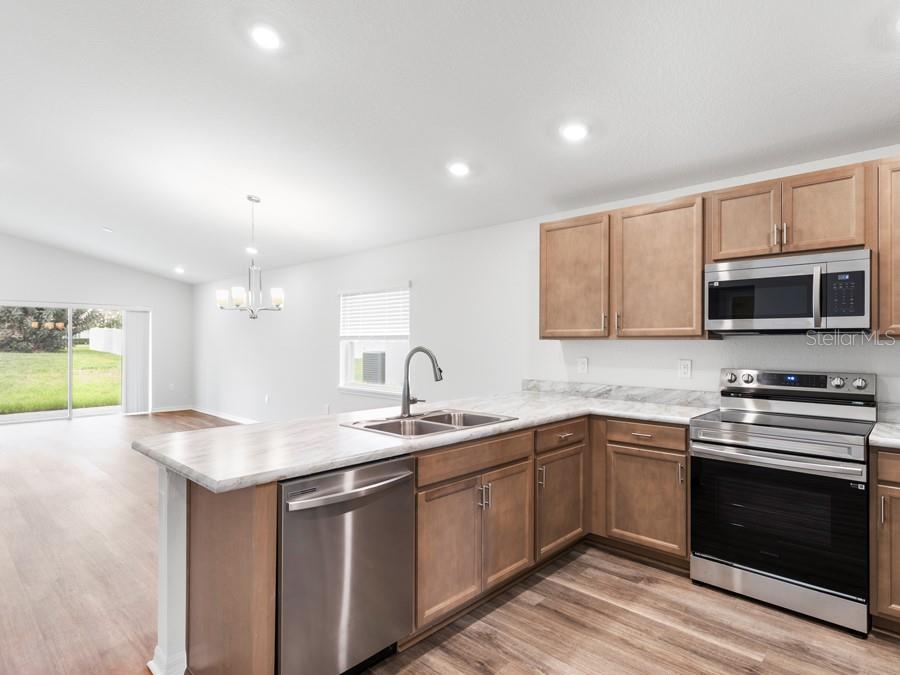 New construction home with 1,479 square feet on one-story including 3 bedrooms, 2 baths, and an open living area. Enjoy an open kitchen with Samsung stainless steel appliances, pantry, and a spacious counter height bar, fully open to the dining café and gathering room. The living area, laundry room, and baths include luxury wood vinyl plank flooring, with stain-resistant carpet in the bedrooms. Your owner's suite is complete with a walk-in wardrobe and a private en-suite bath with a tiled shower and linen closet. Plus, enjoy a covered lanai, 2-car garage, custom-fit window blinds, architectural shingles, energy-efficient insulation and windows, and a full builder warranty.