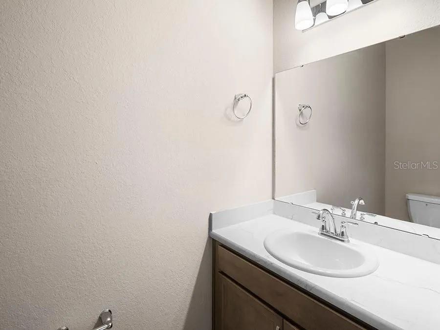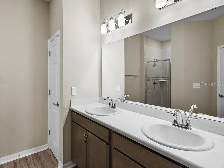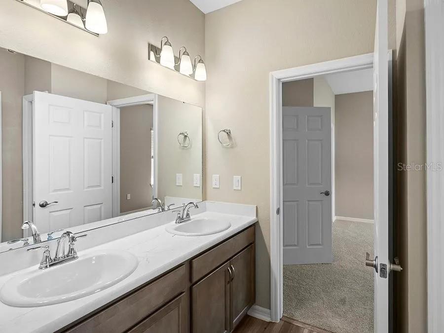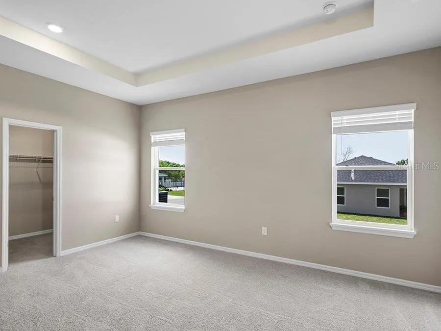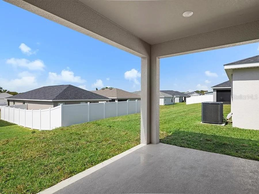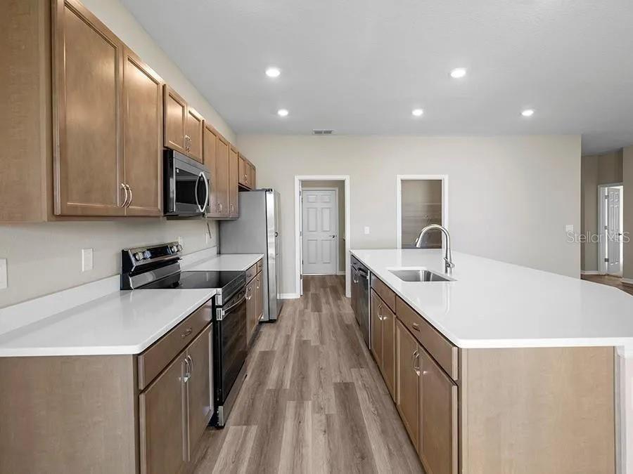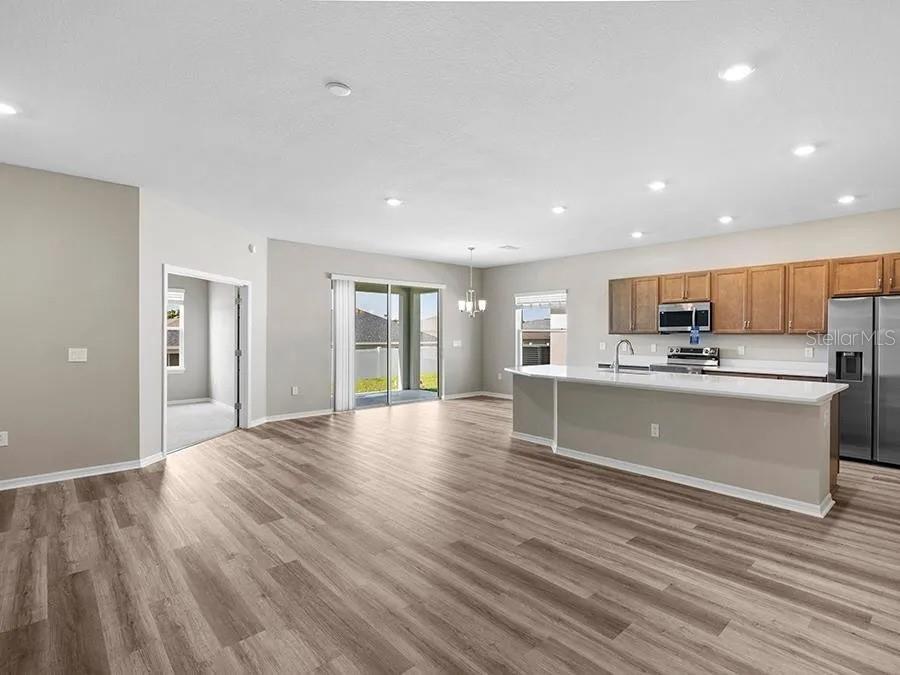 New construction home with 2029 square feet one-story including 4 bedrooms, 2.5 baths, and an open living area. Enjoy an open kitchen with Quartz countertops, Samsung stainless steel appliances, pantry, and a spacious counter height island, fully open to the dining café and gathering room. The living area, laundry room, and baths include luxury wood vinyl plank flooring, with stain-resistant carpet in the bedrooms. Your owner's suite is complete with a walk-in wardrobe and a private en-suite bath with dual vanities, a tiled shower, and a closeted toilet. Jack-and-Jill Hall bath with an enclosed tub and toilet, accessed from bedrooms 3 and 4. Plus, enjoy a covered lanai, 2-car garage, custom-fit window blinds, architectural shingles, energy-efficient insulation and windows, and a full builder warranty. Please note, virtual tour/photos showcases the home layout; colors and design options in actual home for sale may differ. Furnishings and décor do not convey.