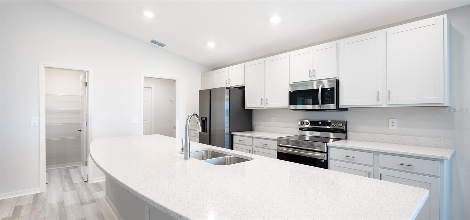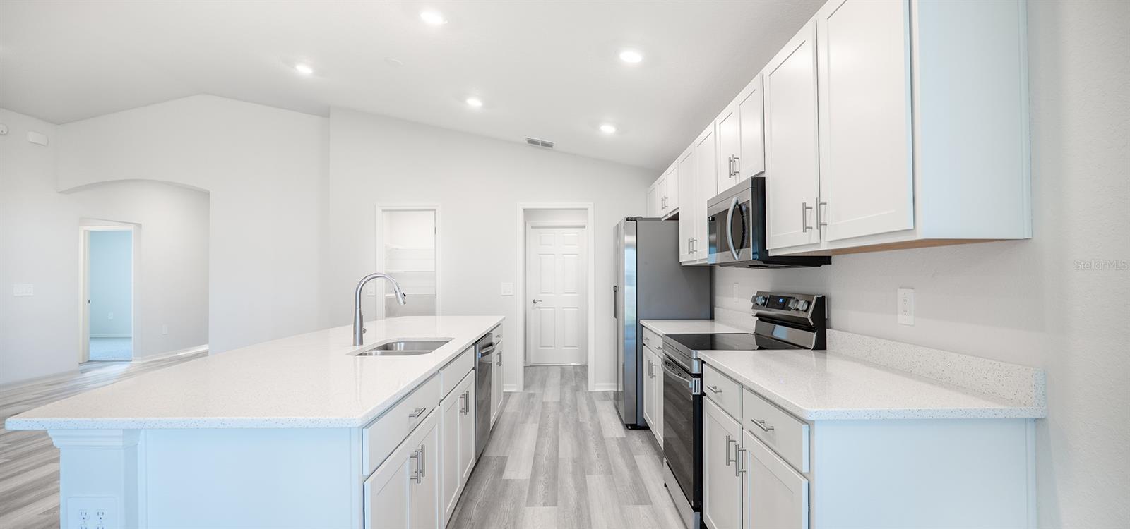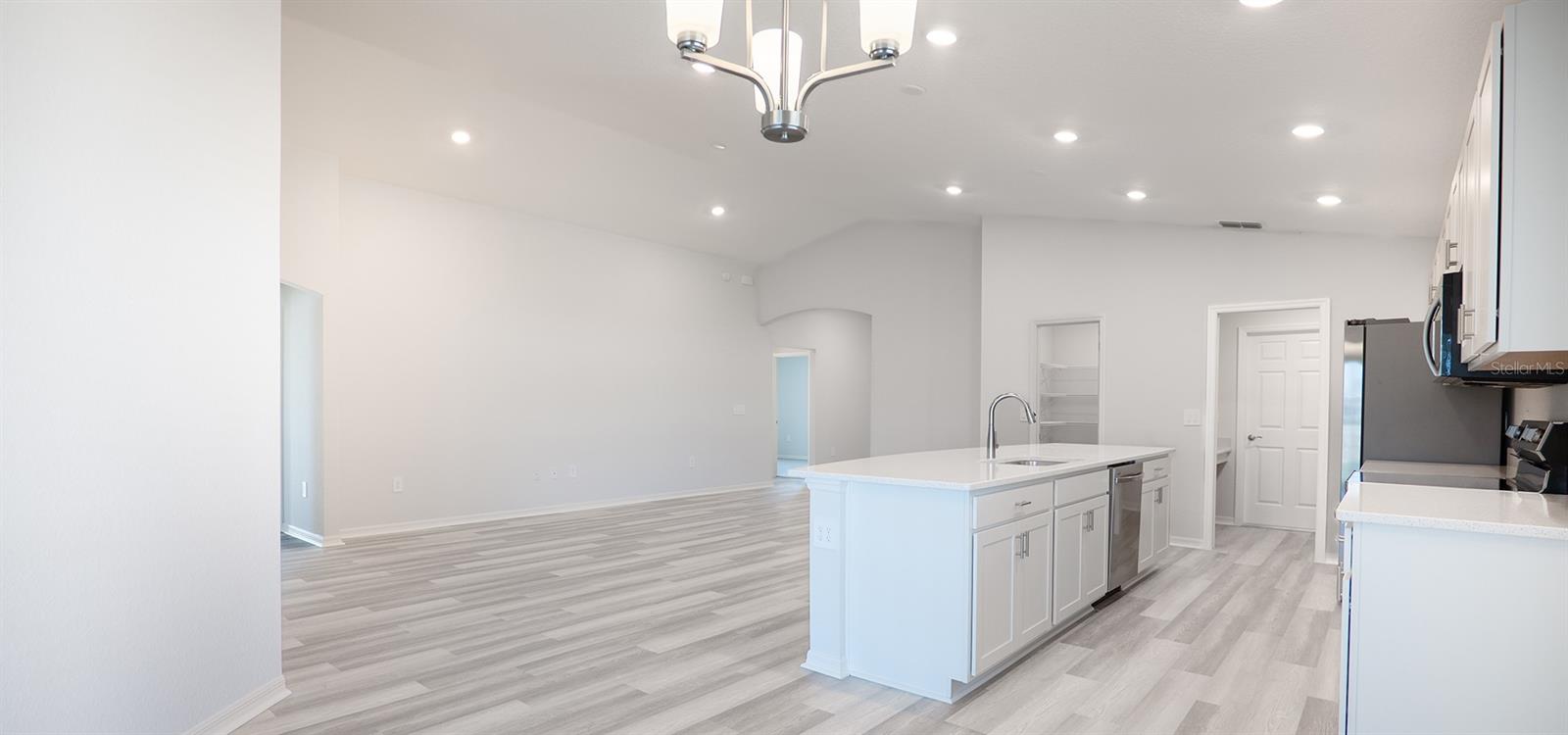 Under Construction. New construction home with 1819 square feet on one-story including 4 bedrooms, 2 baths, and an open living area. Enjoy an open kitchen with Silestone countertops, Samsung stainless steel appliances, a walk-in pantry, and a spacious counter height island, fully open to the dining café and gathering room. The living area, laundry room, and baths include luxury wood vinyl plank flooring, with stain-resistant carpet in the bedrooms. Your owner's suite is complete with a walk-in wardrobe and a private en-suite bath with dual vanities, a tiled shower, and a closeted toilet. Plus, enjoy a covered lanai, 2-car garage, custom-fit window blinds, architectural shingles, energy-efficient insulation and windows, and a full builder warranty. "Please note, virtual tour/photos showcases the home layout; colors and design options in actual home for sale may differ. Furnishings and decor do not convey