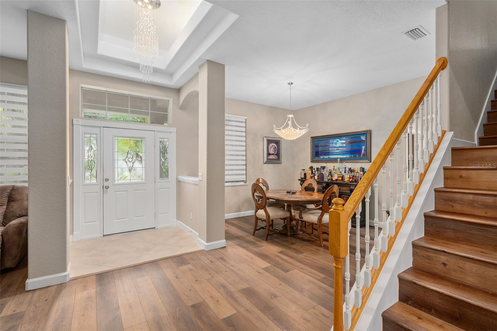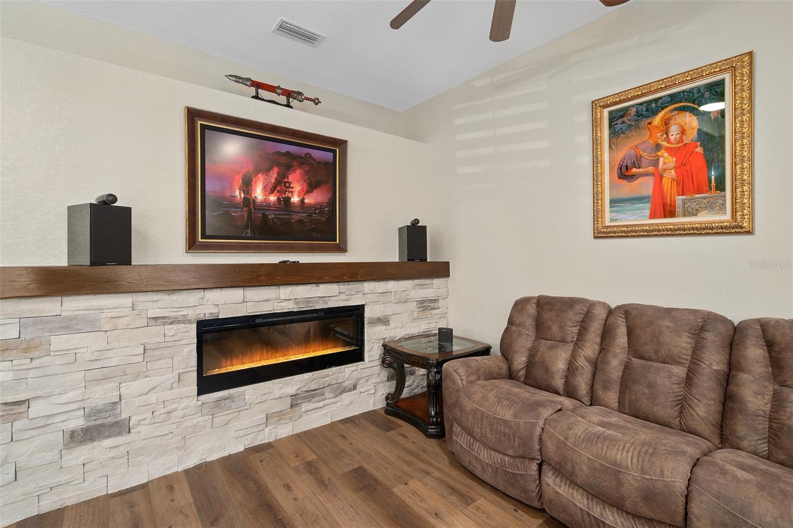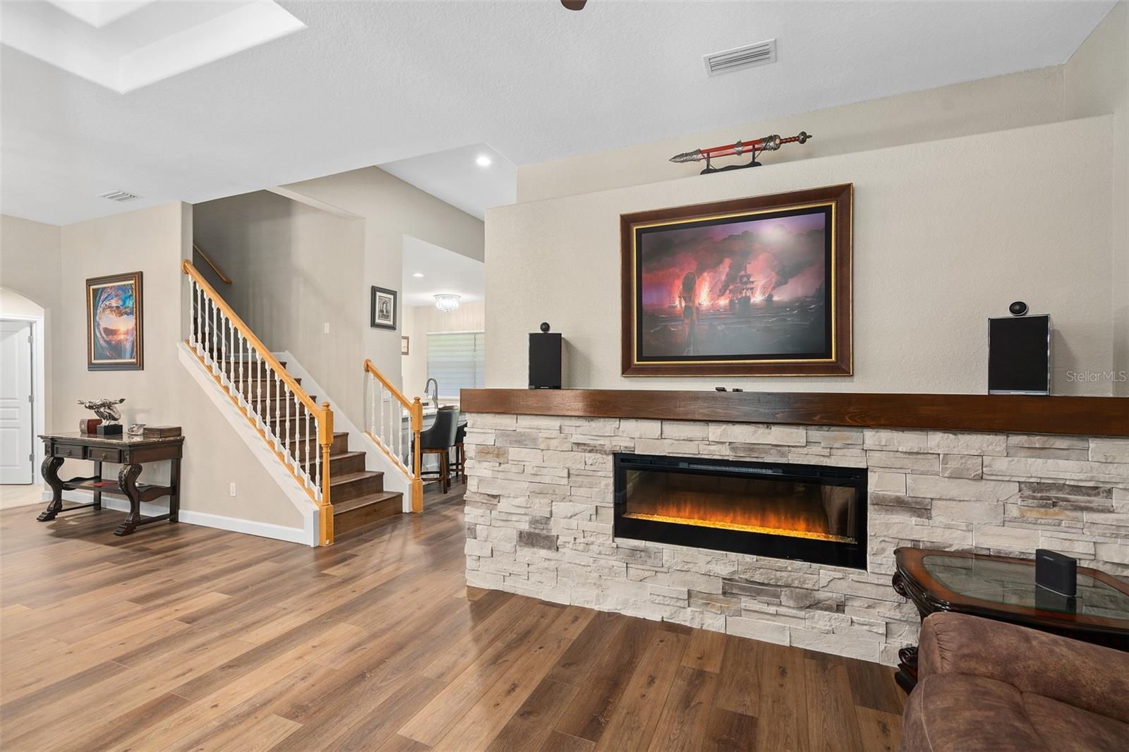 Luxury Redefined | Unrivaled Upgrades | Exceptional Opportunity. Brand new outside paint ( new pics coming soon) with new Sherwin Williams contemporary gray and black exterior finish!!! Welcome to an extraordinary residence where sophistication meets functionality—a custom-crafted 4-bedroom, 4.5-bath estate boasting 4,480 total square feet of impeccable design, set on a .34-acre premium homesite. Offering a rare blend of architectural grandeur and cutting-edge amenities, this breathtaking 3,304 sq ft home invites you to indulge in the pinnacle of luxury living. From the moment you arrive, the oversized paver driveway (accommodating up to 6 trucks) and 3-car garage create a commanding presence. A stately front porch welcomes you to refined interiors defined by custom upgrades at every turn. Interior Elegance & Architectural Detail: Gourmet chef’s kitchen with waterfall-edge stone island, dual stainless ovens, deep dish sink, dovetail cabinetry, and stone backsplash—designed to impress and perform. Grand foyer crowned with a double tray ceiling and custom chandelier sets the tone for the elegance that follows.Wide-plank luxury vinyl flooring flows seamlessly throughout all main living areas and the upper level. Electric fireplace with custom stone inlay and plank mantel offers a warm, designer focal point. Zebra-style window shades and a freshly painted palette elevate modern elegance. Private Sanctuary: Retreat to a lavish downstairs primary suite featuring: Expansive California closet, Private flex space—ideal for a home gym, nursery, or executive office, Spa-inspired en suite with Jacuzzi soaking tub, dual vanities, makeup station, and a luxury walk-in shower with custom lighting Private lanai access for peaceful indoor-outdoor living Upper-Level Entertaining: Upstairs, a luxury man cave/loft awaits—your ultimate game-day headquarters—complete with custom built-ins, stone countertop, and dual-zone beverage fridge. Bedrooms are generously scaled (15x15) and include Jack-and-Jill and private bath arrangements, offering both comfort and convenience. Outdoor Living at Its Finest:Expansive enclosed lanai with wood plank ceiling reminiscent of multimillion-dollar estates. Full dedicated pool bath, ideal for future resort-style outdoor additions. Lush, private yard with ample space for a dream pool. Community gazebo directly across the street for effortless neighborhood gatherings. Safe pedestrian access to local schools, ideal for families Just minutes from local boat ramps, perfect for lake lovers and weekend adventures. Peace of Mind: With a 5-year-new roof, 2-year-old A/C units, and an immaculately maintained structure, this home offers not just elegance—but enduring value. This is more than a home—it’s a lifestyle. Schedule your private tour today and witness the height of custom luxury in one of the area's most desirable communities.