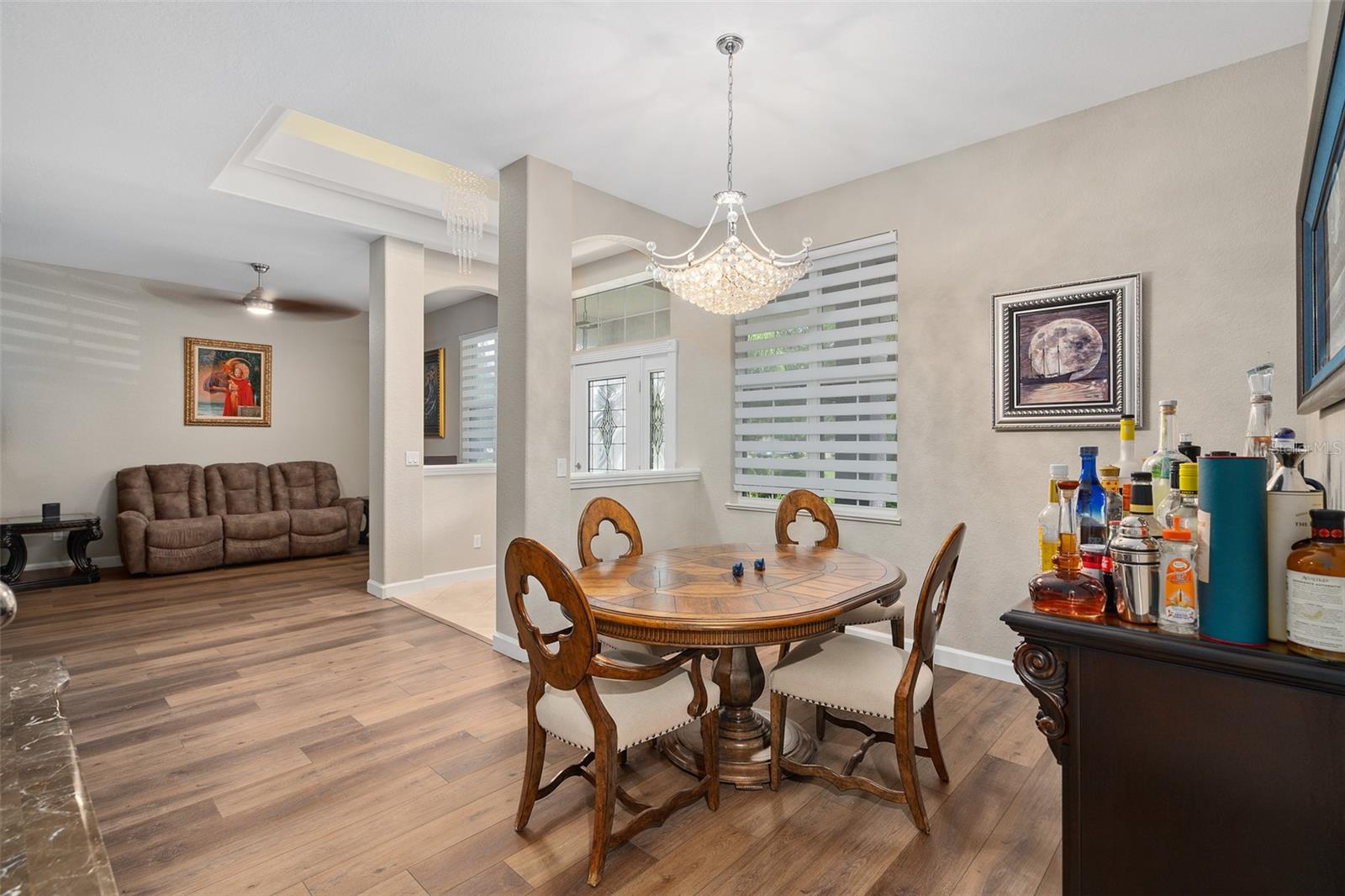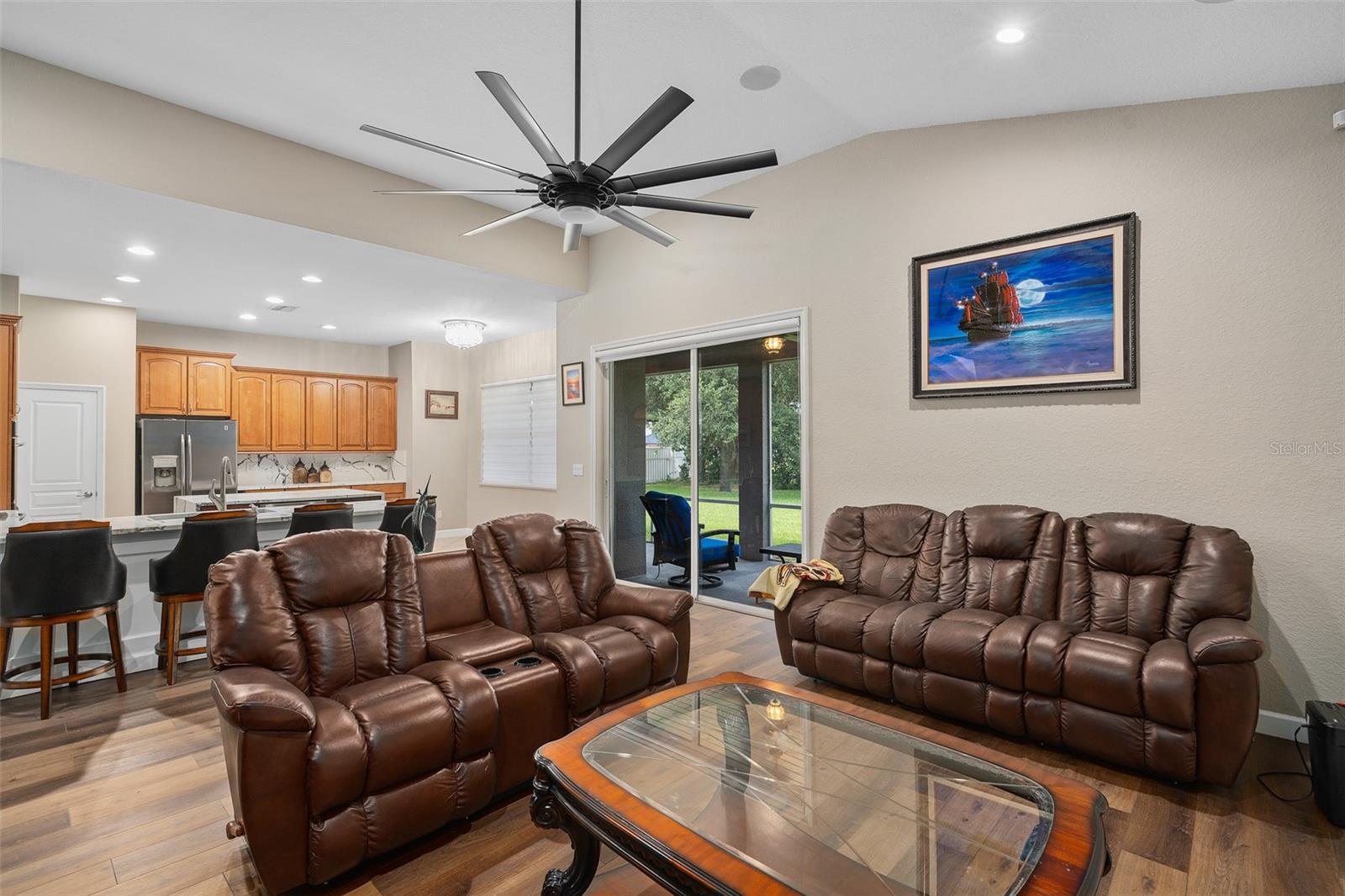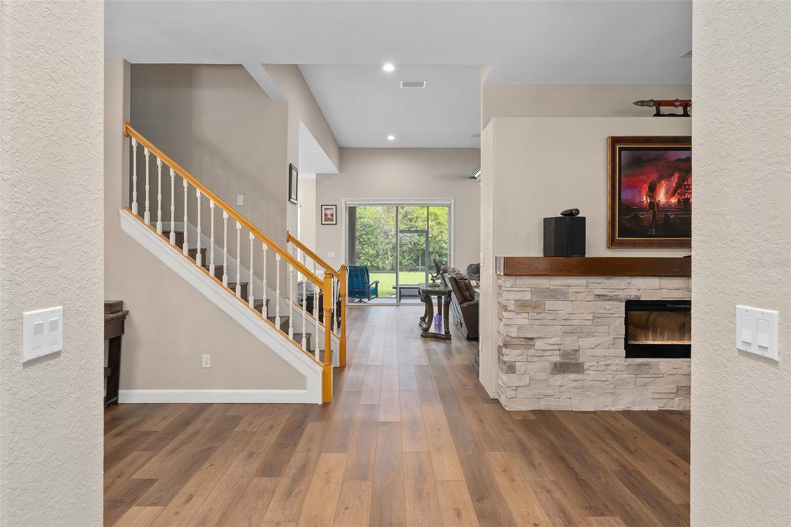 Luxury Redefined | Unrivaled Upgrades | Exceptional Opportunity. Brand new outside paint ( new pics coming soon) with new Sherwin Williams contemporary gray and black exterior finish!!! Welcome to an extraordinary residence where sophistication meets functionality—a custom-crafted 4-bedroom, 4.5-bath estate boasting 4,480 total square feet of impeccable design, set on a .34-acre premium homesite. Offering a rare blend of architectural grandeur and cutting-edge amenities, this breathtaking 3,304 sq ft home invites you to indulge in the pinnacle of luxury living. From the moment you arrive, the oversized paver driveway (accommodating up to 6 trucks) and 3-car garage create a commanding presence. A stately front porch welcomes you to refined interiors defined by custom upgrades at every turn. Interior Elegance & Architectural Detail: Gourmet chef’s kitchen with waterfall-edge stone island, dual stainless ovens, deep dish sink, dovetail cabinetry, and stone backsplash—designed to impress and perform. Grand foyer crowned with a double tray ceiling and custom chandelier sets the tone for the elegance that follows.Wide-plank luxury vinyl flooring flows seamlessly throughout all main living areas and the upper level. Electric fireplace with custom stone inlay and plank mantel offers a warm, designer focal point. Zebra-style window shades and a freshly painted palette elevate modern elegance. Private Sanctuary: Retreat to a lavish downstairs primary suite featuring: Expansive California closet, Private flex space—ideal for a home gym, nursery, or executive office, Spa-inspired en suite with Jacuzzi soaking tub, dual vanities, makeup station, and a luxury walk-in shower with custom lighting Private lanai access for peaceful indoor-outdoor living Upper-Level Entertaining: Upstairs, a luxury man cave/loft awaits—your ultimate game-day headquarters—complete with custom built-ins, stone countertop, and dual-zone beverage fridge. Bedrooms are generously scaled (15x15) and include Jack-and-Jill and private bath arrangements, offering both comfort and convenience. Outdoor Living at Its Finest:Expansive enclosed lanai with wood plank ceiling reminiscent of multimillion-dollar estates. Full dedicated pool bath, ideal for future resort-style outdoor additions. Lush, private yard with ample space for a dream pool. Community gazebo directly across the street for effortless neighborhood gatherings. Safe pedestrian access to local schools, ideal for families Just minutes from local boat ramps, perfect for lake lovers and weekend adventures. Peace of Mind: With a 5-year-new roof, 2-year-old A/C units, and an immaculately maintained structure, this home offers not just elegance—but enduring value. This is more than a home—it’s a lifestyle. Schedule your private tour today and witness the height of custom luxury in one of the area's most desirable communities.