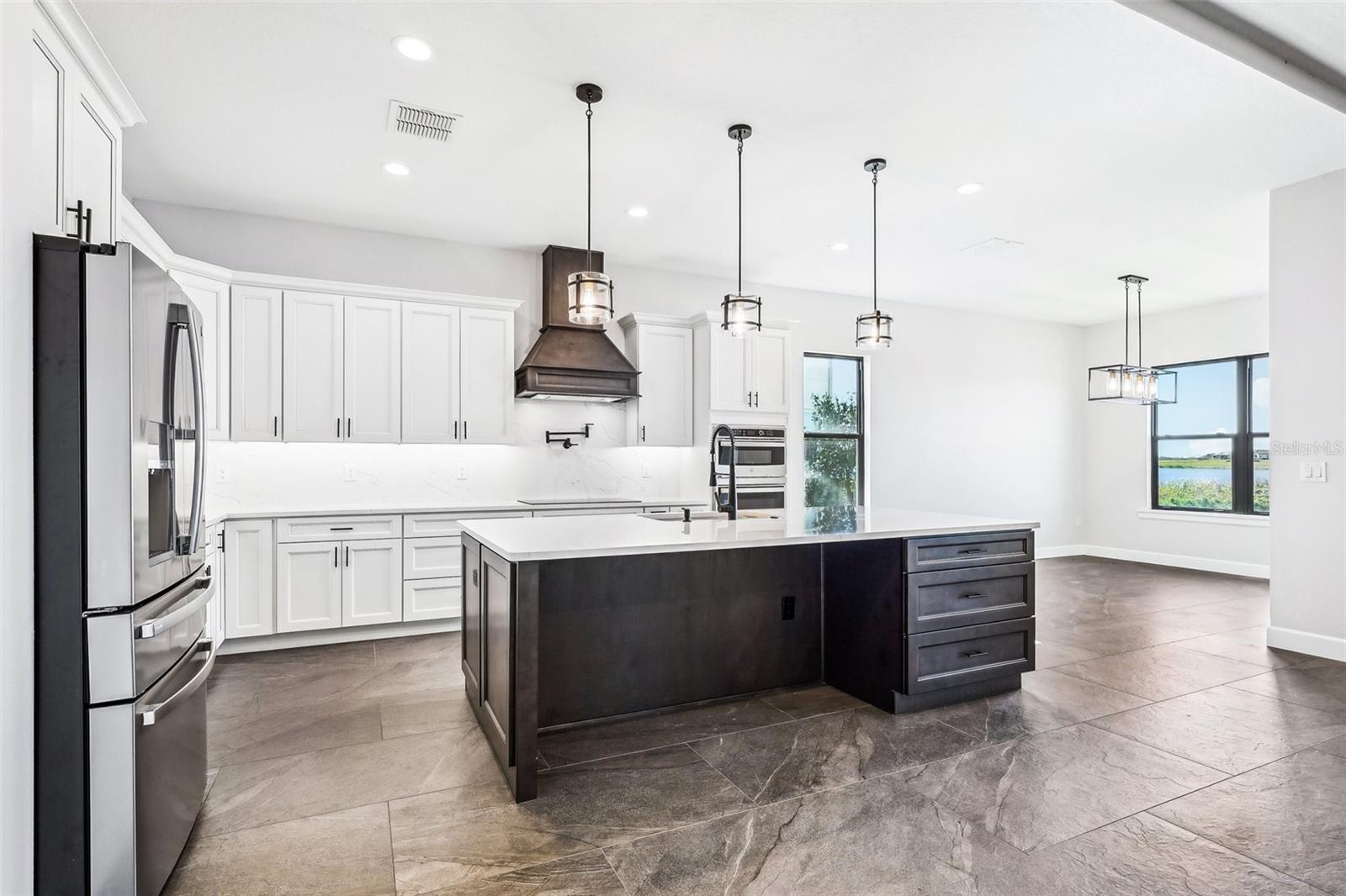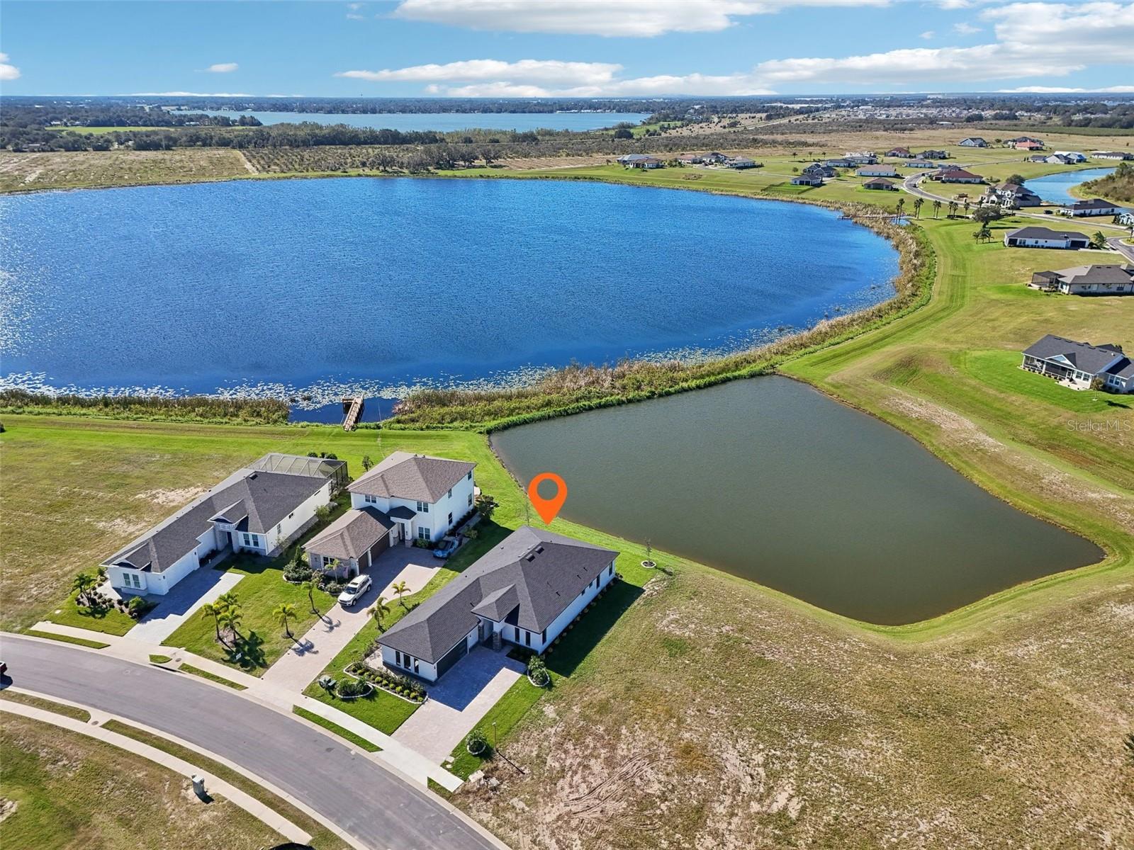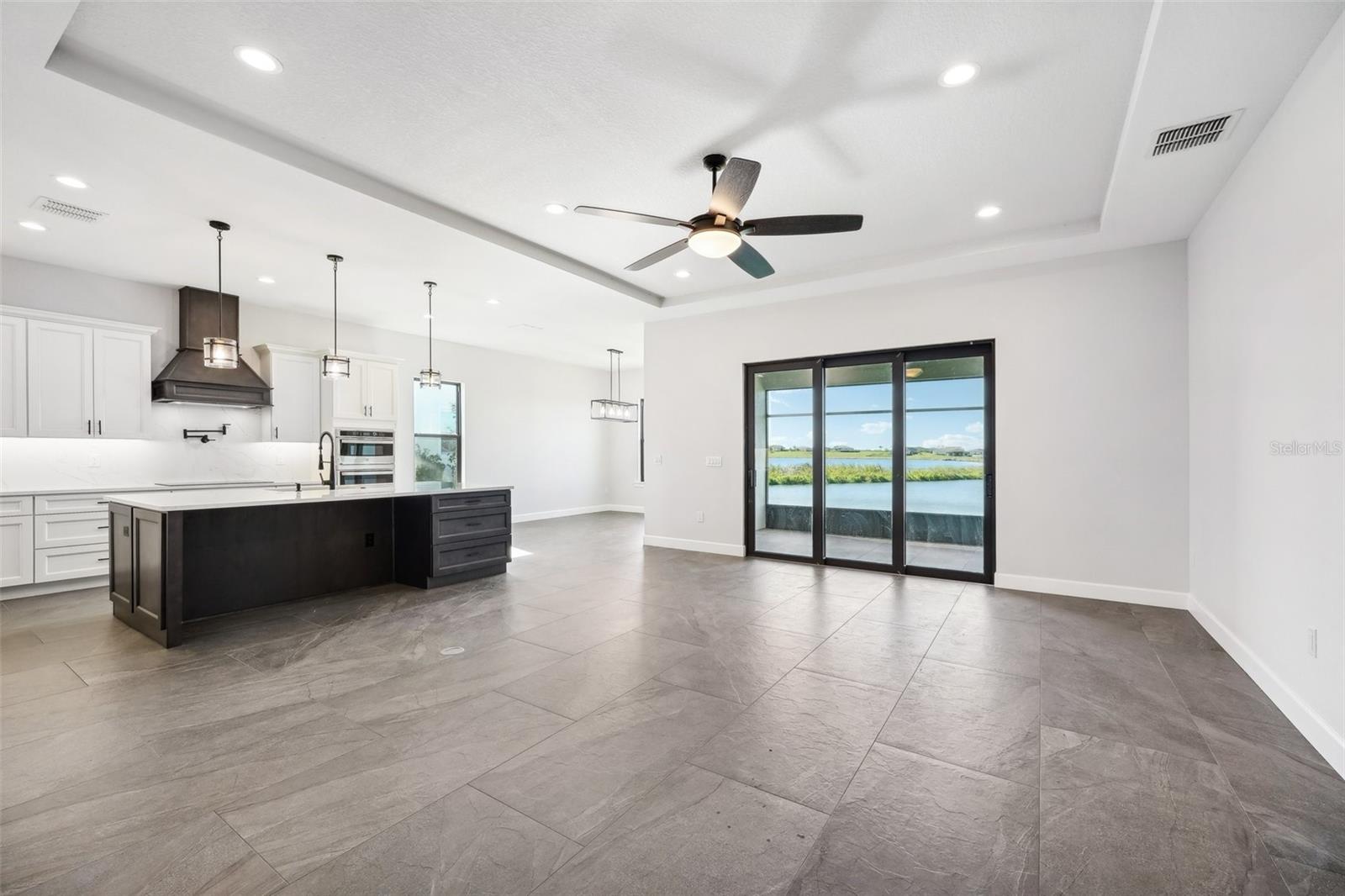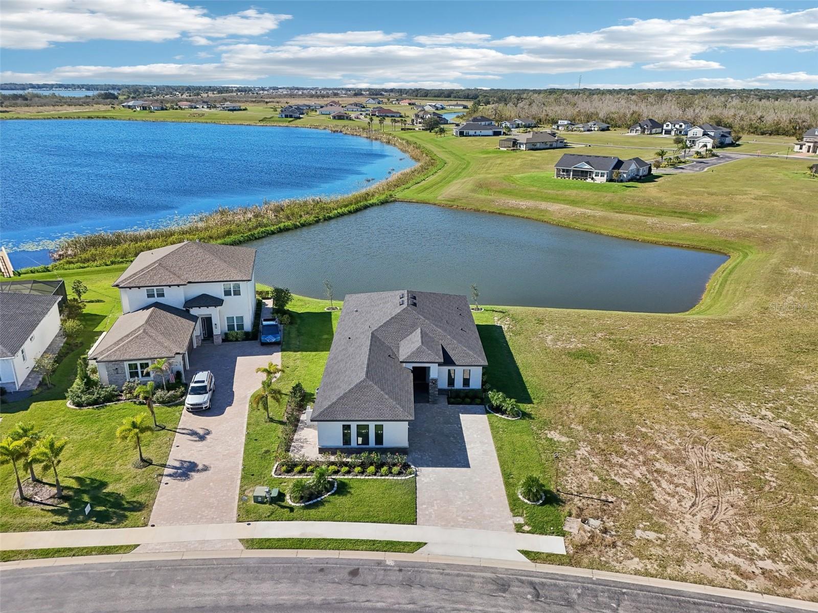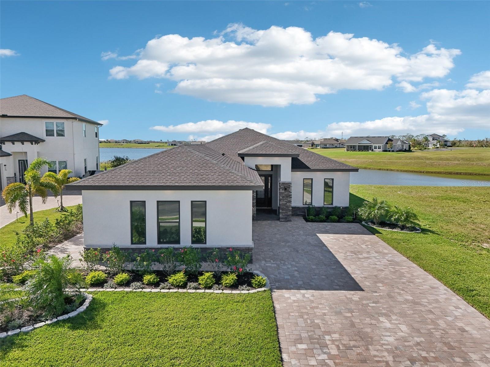 Price Reduction...Welcome the Lilly 2,533 Heated square foot 4 bedrooms, 3 full bathrooms, lakeview contemporary home designed for comfort and style. This new construction open concept living area flows from a spacious living room to a deluxe kitchen and dining space with easy access to a screened covered lanai. The kitchen which is enhanced by a premium Stainless Steel GE PROFILE ® Smart Kitchen appliance package including French-Door, ENERGY STAR® 4 doors Refrigerator with Door In Door, built-in, touch-control electric cooktop and an IKTCH variable speed Hood enclosed in a decorative Charcoal Grey enclosure, pot filler over the cooktop, a set of wall Microwave and oven, 3 drawers Dish washer, large walk-in pantry with decorative glass door and shelves, Blanc white high-quality quartz COUNTERTOP and back splash, FOREVERMARK Shaker, Bi-color, solid wood countertops with SOFT CLOSE hinges, KOHLER grade 18 stainless steel under-mounted sink finished with a SEMI-PROFESSIONAL Dark finish KOHLER faucet with 2 functions, a built in breakfast bar. Top of the line PGT Insulated windows are installed in all windows including the 3-panel, double-pane, insulated sliding doors that open to a screened rear lanai, prepped for an outdoor kitchen and overlooking a breathtaking sunset views over the lake finished with a 24X24 pavers installed on the floor. The split-bedroom floor plan offers privacy and tranquility, especially with a master suite featuring an unobstructed lake view, an en-suite bathroom, and a spacious walk-in closet with stylish shelves for organized elegance. Perfect for multi-generational living or remote work, the home includes an in-law suite with a separate entrance that can easily transform into a private office. Smart features abound, from the Cat 5 Ethernet/data cable for seamless connectivity to the energy-efficient AO Smith 80-gallon hybrid water heater and 16 SEER TRANE HVAC system with a HONEYWELL PRO SMART thermostat. Every detail has been considered, including Decorative vanity mirrors, premium tile flooring throughout, and an inside laundry room with washer and dryer hook-ups and cabinets for Extra storage. The two-car garage has sanded stucco walls, a Modern Faux Wood finish, insulated CLOPAY garage door functioning with a LIFTMASTER garage door opener with WiFi connection, an electric vehicle charging station hook-up and a man Door. All bathrooms are equipped with Top of the line DELTA Dark finish durable faucets. All doors are 8 ft MASONITE solid core doors including a fiber-glass front door with decorative glass. HARBOR BREEZE Ceiling fans with remote control installed in all rooms, KWIKSET dark finish lever/ Hardware in all doors. This exquisite home is located in the upscale gated community of Water Ridge, where residents enjoy an array of top-tier amenities a clubhouse with a spacious gathering room, hosting vibrant community events year-round. For outdoor enjoyment, residents have access to 3 sparkling community pools, lighted tennis courts, basketball courts, fitness center, sauna. Water enthusiasts can take advantage of 3 fishing piers and 2 community boat ramps to access 2 huge lakes for endless water activities. Water Ridge is golf cart-friendly. The community is 45 min away from Disney, 25 min from Legoland, 15 min from Publix and Suntrax, 20 min from Jack Brack seaplane base, in proximity to several colleges and universities.