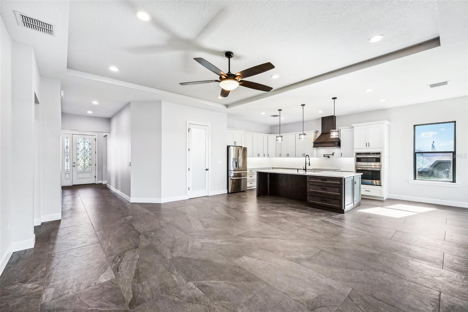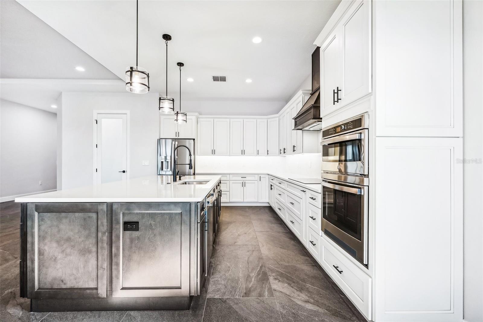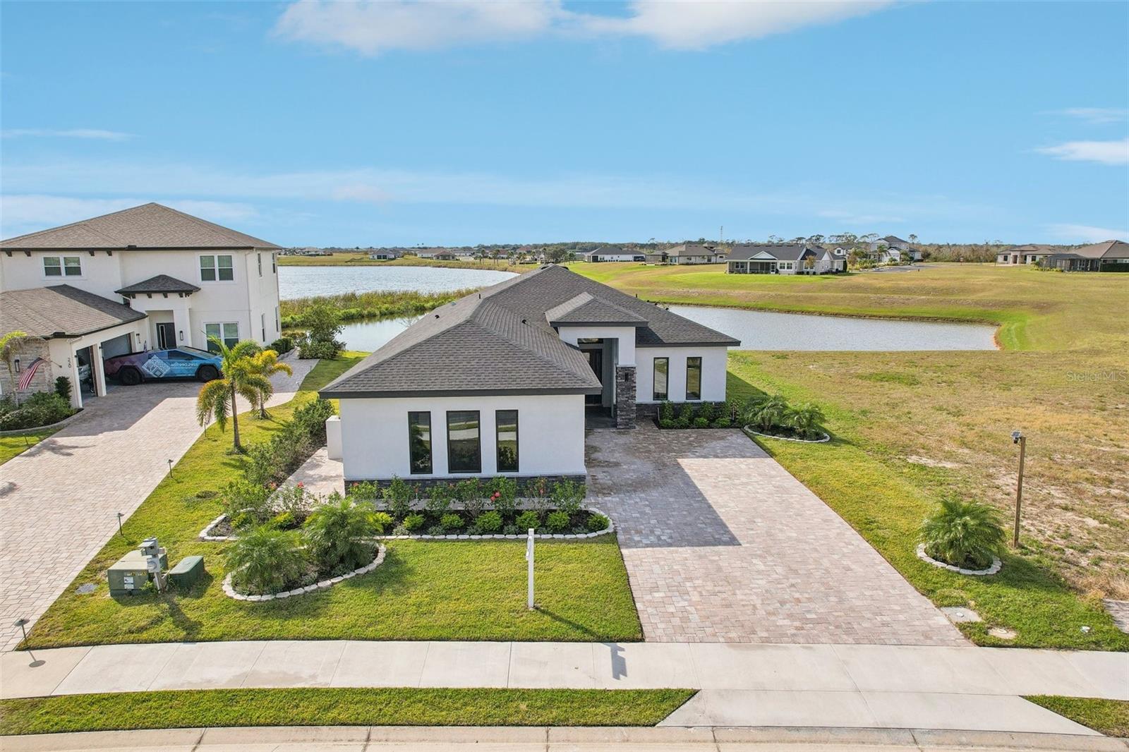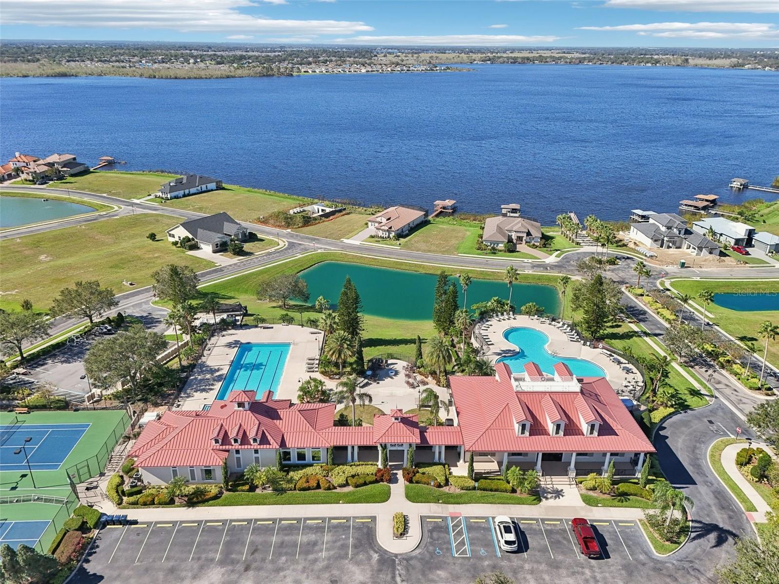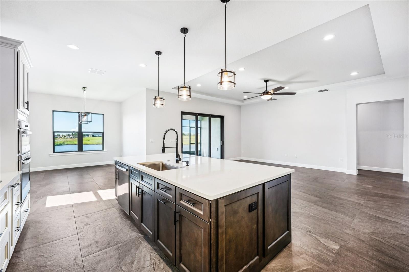 Price Reduction...Welcome the Lilly 2,533 Heated square foot 4 bedrooms, 3 full bathrooms, lakeview contemporary home designed for comfort and style. This new construction open concept living area flows from a spacious living room to a deluxe kitchen and dining space with easy access to a screened covered lanai. The kitchen which is enhanced by a premium Stainless Steel GE PROFILE ® Smart Kitchen appliance package including French-Door, ENERGY STAR® 4 doors Refrigerator with Door In Door, built-in, touch-control electric cooktop and an IKTCH variable speed Hood enclosed in a decorative Charcoal Grey enclosure, pot filler over the cooktop, a set of wall Microwave and oven, 3 drawers Dish washer, large walk-in pantry with decorative glass door and shelves, Blanc white high-quality quartz COUNTERTOP and back splash, FOREVERMARK Shaker, Bi-color, solid wood countertops with SOFT CLOSE hinges, KOHLER grade 18 stainless steel under-mounted sink finished with a SEMI-PROFESSIONAL Dark finish KOHLER faucet with 2 functions, a built in breakfast bar. Top of the line PGT Insulated windows are installed in all windows including the 3-panel, double-pane, insulated sliding doors that open to a screened rear lanai, prepped for an outdoor kitchen and overlooking a breathtaking sunset views over the lake finished with a 24X24 pavers installed on the floor. The split-bedroom floor plan offers privacy and tranquility, especially with a master suite featuring an unobstructed lake view, an en-suite bathroom, and a spacious walk-in closet with stylish shelves for organized elegance. Perfect for multi-generational living or remote work, the home includes an in-law suite with a separate entrance that can easily transform into a private office. Smart features abound, from the Cat 5 Ethernet/data cable for seamless connectivity to the energy-efficient AO Smith 80-gallon hybrid water heater and 16 SEER TRANE HVAC system with a HONEYWELL PRO SMART thermostat. Every detail has been considered, including Decorative vanity mirrors, premium tile flooring throughout, and an inside laundry room with washer and dryer hook-ups and cabinets for Extra storage. The two-car garage has sanded stucco walls, a Modern Faux Wood finish, insulated CLOPAY garage door functioning with a LIFTMASTER garage door opener with WiFi connection, an electric vehicle charging station hook-up and a man Door. All bathrooms are equipped with Top of the line DELTA Dark finish durable faucets. All doors are 8 ft MASONITE solid core doors including a fiber-glass front door with decorative glass. HARBOR BREEZE Ceiling fans with remote control installed in all rooms, KWIKSET dark finish lever/ Hardware in all doors. This exquisite home is located in the upscale gated community of Water Ridge, where residents enjoy an array of top-tier amenities a clubhouse with a spacious gathering room, hosting vibrant community events year-round. For outdoor enjoyment, residents have access to 3 sparkling community pools, lighted tennis courts, basketball courts, fitness center, sauna. Water enthusiasts can take advantage of 3 fishing piers and 2 community boat ramps to access 2 huge lakes for endless water activities. Water Ridge is golf cart-friendly. The community is 45 min away from Disney, 25 min from Legoland, 15 min from Publix and Suntrax, 20 min from Jack Brack seaplane base, in proximity to several colleges and universities.