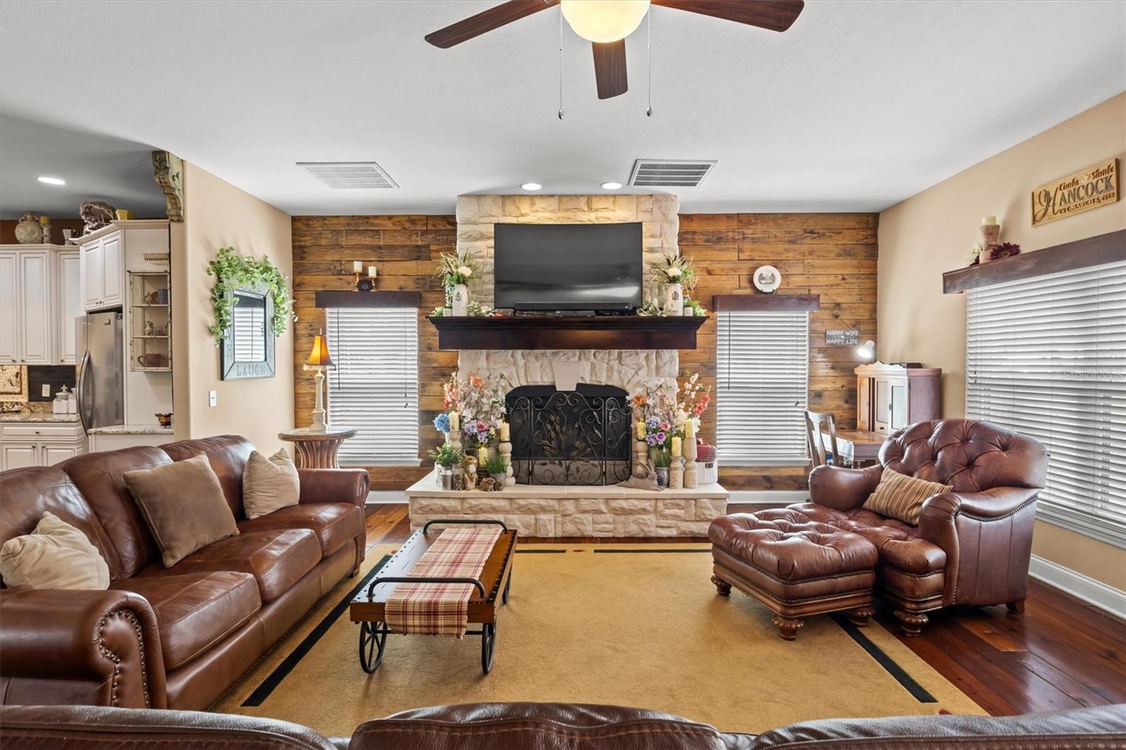 Country with Class or County Chic—either way, this custom 2017 home delivers both style and serenity on 5.43 acres just outside Bartow. Enjoy the peace of country living while staying conveniently close to Bartow, Winter Haven, Lakeland, and Lake Wales. Step through the front door and you’re greeted by wide-plank custom wood flooring that flows throughout much of the home. The spacious living room features a stunning floor-to-ceiling stone wood-burning fireplace, creating a warm and inviting focal point. Overlooking the living area is a gourmet kitchen complete with a large island, stainless steel appliances, vented hood, pot filler, custom mosaic backsplash, and an additional built-in oven. A generous pantry and laundry room sit just off the kitchen for added convenience. The adjoining breakfast nook and formal dining area offer plenty of room for gatherings. The home features three large bedrooms, including a luxurious primary suite with a tray ceiling, oversized walk-in closet, and French doors leading to the screened patio. The primary bathroom includes dual sinks with a center vanity, a private water closet, and a walk-in shower equipped with multiple showerheads. The second and third bedrooms share a spacious Jack-and-Jill bathroom, each with its own private sink and direct access to the shared tub/shower and toilet area. One of the standout features of this home is the expansive screened-in patio, accessible through three sets of French doors. This impressive outdoor living space overlooks the back acreage and serves as a true extension of the home. Beyond the patio, the property continues to impress with a powered shed currently used as an extra bedroom, a charming greenhouse constructed from salvaged windows, and a large chicken coop ready for your flock. A substantial enclosed barn with an attached lean-to and two stables provides ample room for horses, livestock, equipment, or recreational vehicles. A nearby tack shed adds even more functionality. With room to roam, grow, and create the lifestyle you’ve been dreaming of, this property offers a rare blend of comfort, craftsmanship, and country charm.
