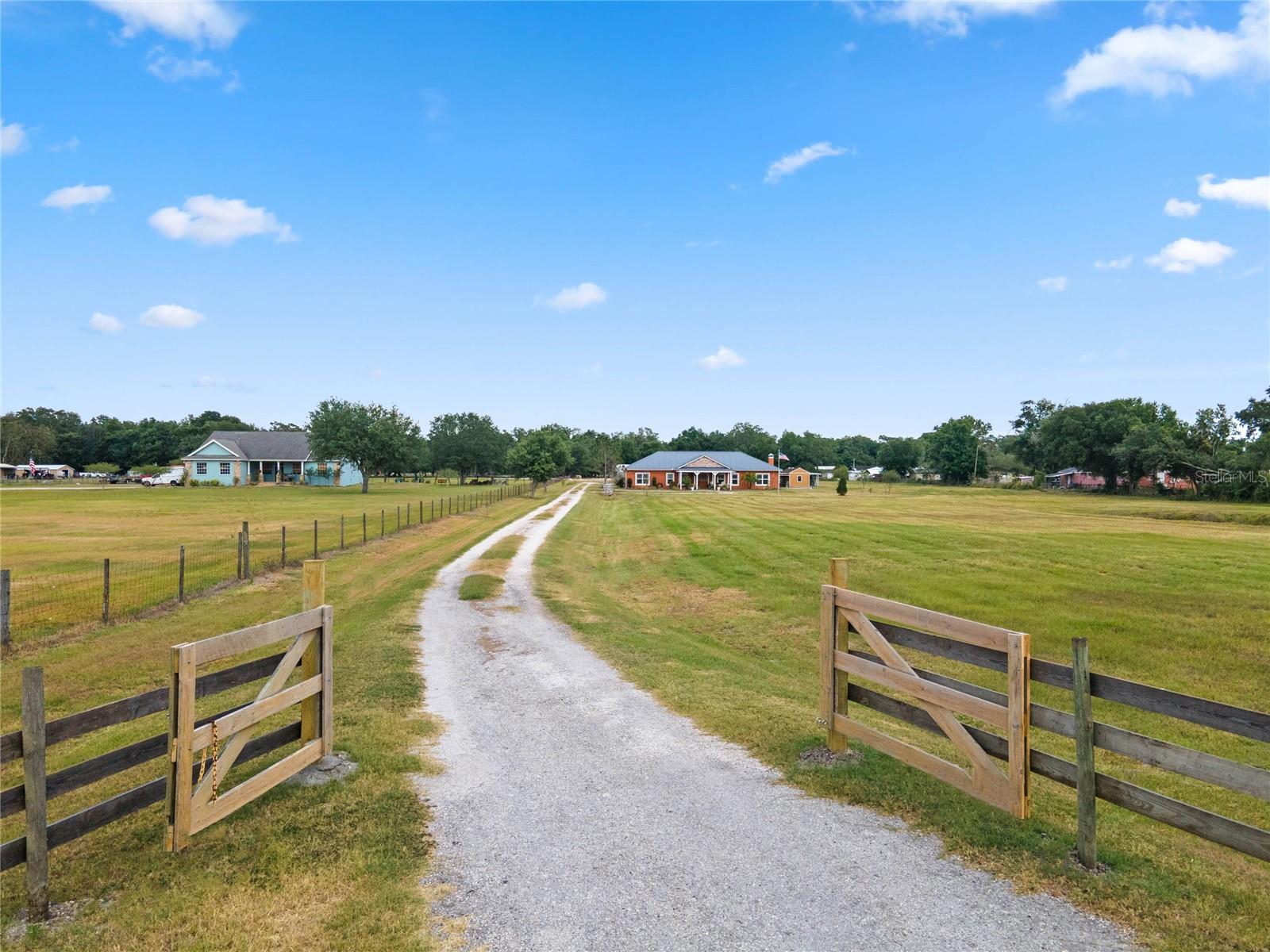 Nestled behind a gated entry, come discover rustic elegance in this 2017 custom-built 3 bedroom, 2.5 bath home on 5.43 acres of pristine land with 3 outbuildings and no HOA restrictions! This property offers limitless possibilities with room for horses, farm animals, boats, RVs, ATVs and more! Welcome to 408 Old Bartow Lake Wales Rd in Bartow, FL. Passing through the double gated entry, you'll be charmed by the traditional-style home with a welcoming covered front porch. Step inside to discover gorgeous hardwood flooring, a grand foyer, and an open floor plan with 2,625 sqft of living area that exudes warmth and character. The expansive great room features a wood-burning fireplace that provides a cozy ambiance and a formal dining area for casual or intimate gatherings. The eat-in kitchen is finished with elegant granite counters, hardwood cabinetry, an island with a prep sink, breakfast bar, brand new pot filler, custom backsplash, stainless steel appliances including double ovens, and a large walk-in pantry. The primary suite is a retreat in itself, with a tray ceiling adorned with crown molding, French doors providing access to the lanai and barn doors leading to a spacious 7'x9' walk-in closet and en-suite bath featuring travertine floors, a walk-in shower, granite counters with dual sinks and makeup vanity, and a separate water closet for added privacy. The secondary bedrooms are generously sized and share a Jack and Jill bathroom with separate granite vanities, travertine flooring, and a relaxing tub. Step outside onto the 825 sqft covered and screened lanai, perfect for hosting holidays and parties, and creating cherished memories with friends and family for years to come. A huge 30’x40’ barn with concrete flooring, electricity, and 2 attached horse stalls provides plenty of room for storage of vehicles, boats, ATVs and equipment. A 10'x40' covered storage space and a 20’x21' carport, both offer additional parking options. For hobbyists, there is a she-shed that could be used as an art or craft studio, as well as a stunning greenhouse with crystal chandelier lighting and operating windows for year-round plant growth. Fresh eggs can be collected daily from the backyard chicken coop, and there is plenty of space for growing fruits and vegetables. If living a self-sustained life is your dream, this property offers the perfect footprint. A front yard pond adds to the beauty and provides a peaceful spot for reflection and sunsets. Additional features include; a guest powder room, an interior laundry room equipped with a washer and dryer, new paint in bedrooms and second bath, double pane windows, metal roof, 2 A/C units, leased water softener, 4" deep well, rain gutters, 50 amp connection for RV or generator, underground electrical lines, solar lights, stone accents, fully fenced and more. Located less than 1/2 mile from Highway 60, making for easy commutes to the east and west coasts of FL. Only 5 minutes from the new South Pointe Elementary School and less than 20 minutes from downtown Bartow, Winter Haven & Lake Wales. Whether you desire space for farm animals, horses, workshops, or just privacy, this property captures the essence of the rural living experiences you've always envisioned. Don't miss the opportunity to own this unique estate, call today for a private tour!