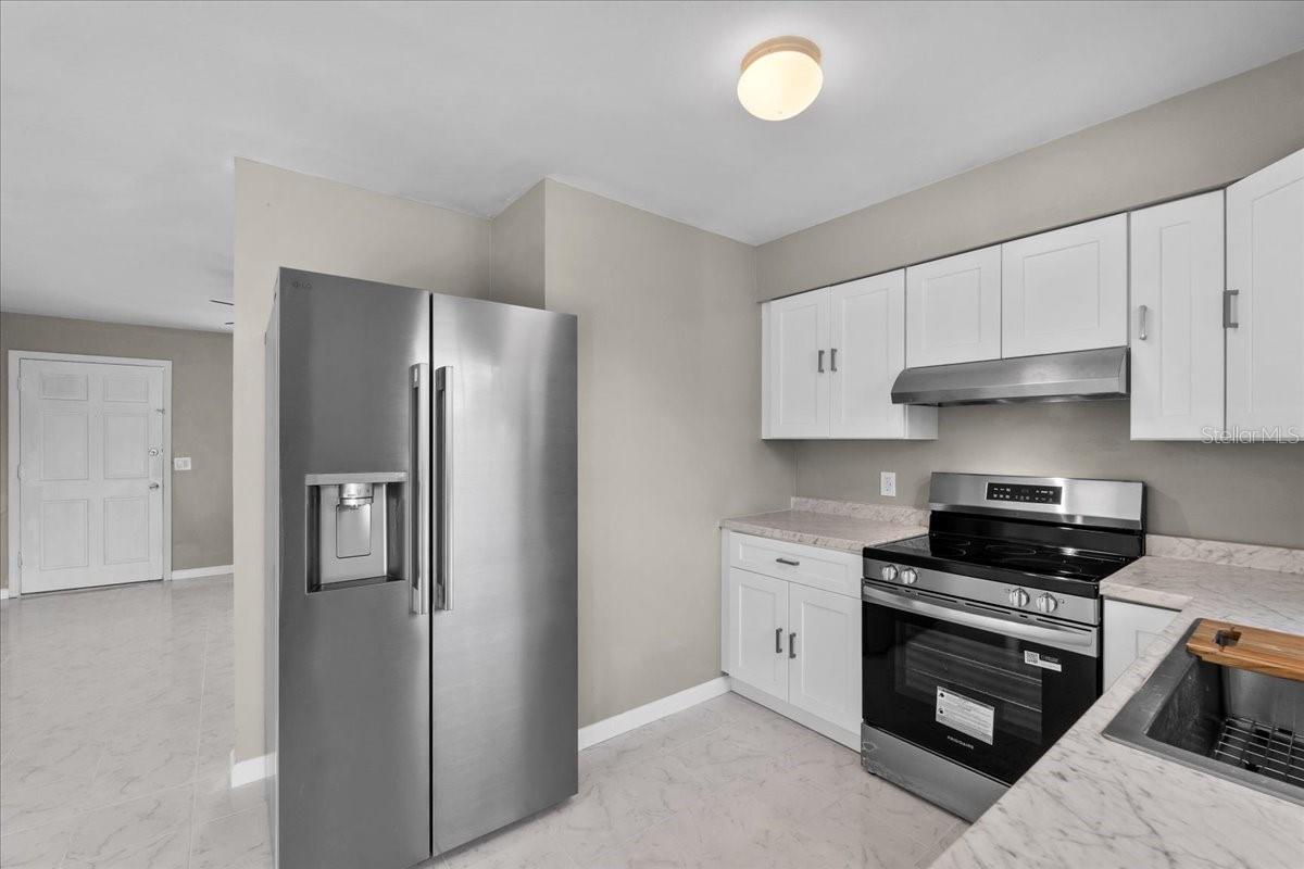 This fully remodeled 3BR/1BA home with no HOA and fantastic curb appeal is move-in ready! Step inside to a bright, modern interior featuring a brand-new kitchen with shaker cabinets, stainless steel appliances, and elegant Bianco Calacata ceramic tile flooring. The entire home has been freshly painted inside and out, and includes a new roof (permitted), new Ply Gem windows, newer AC (2021), seamless gutters, and updated baseboards and trim. The bathroom has been completely renovated with updated fixtures and finishes. Outside, enjoy a spacious backyard perfect for entertaining, complete with a metal-roofed storage shed, covered space for projects or parking, a dedicated laundry room, and even a custom-built dog house. Located minutes from Fort Fraser Trail, Circle B Bar Reserve, and major roadways for easy travel to Lakeland, Tampa, and Orlando. Move-in ready with all major updates done!